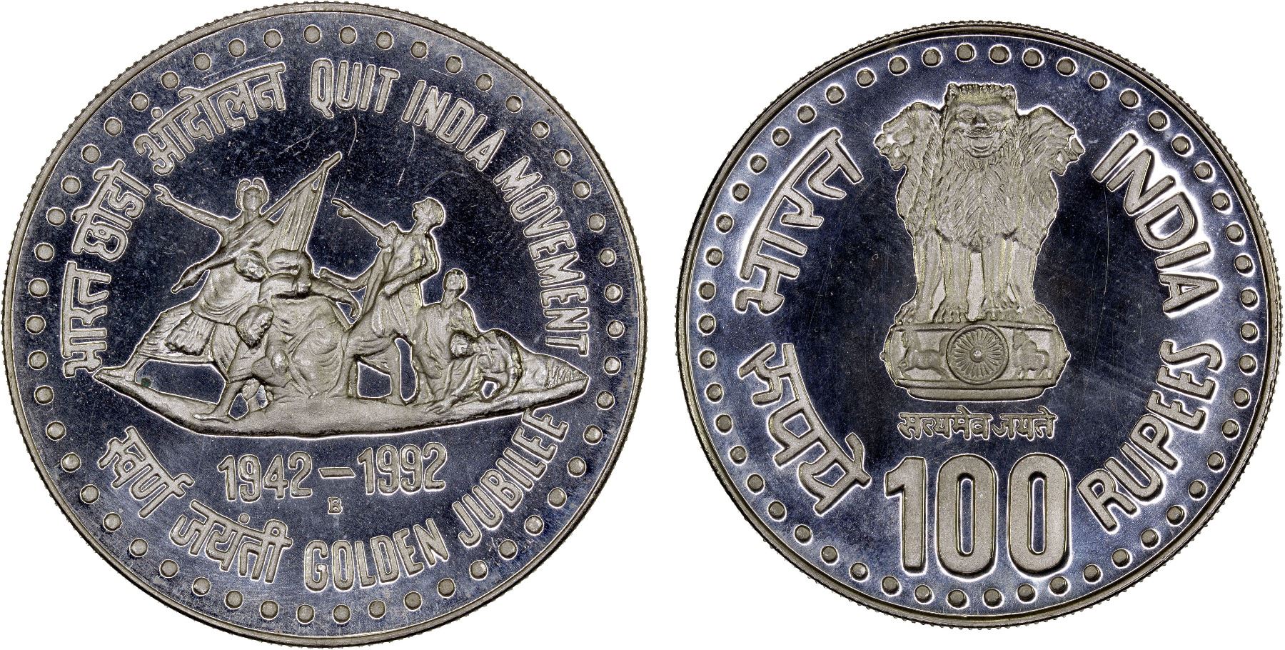 INDIA: Republic, AR 100 rupees, 1992-B, KM-286, Quit India Movement, a few light hairlines, Proof, ex Wolfgang Schuster Collection.