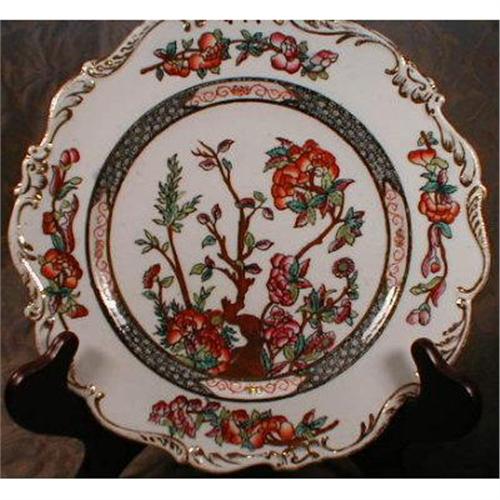 WONDERFUL set of 12 antique india tree pattern plates from England. These great plates may possibly be made by Coalport or other fine manufacturers. Decorated in pink, Chinese red, green and brown with gold accents. There is some variation in color and shape in the set. We also have matching cake plates. Add this great set of antique plates to your china collection TODAY!