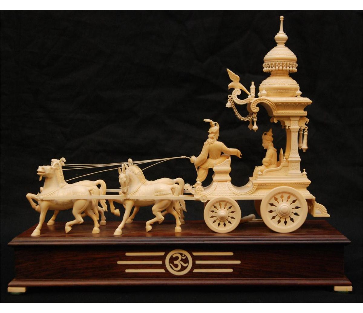 Indian hand carved ivory chariot depicting two men riding riding in a cart with four horses pulling it. Mounted on wooden base with ivory inlaid design with calligraphy to front. Measures 10 1/4" height x 14 1/8" length + 2 1/2" base height (26cm x 35.8cm + 6.3cm). Total weight of 1854 grams.