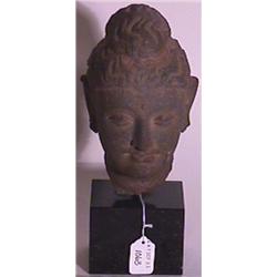 INDIAN CARVED STONE HEAD OF A DEITY, 18th/19th century, modeled with wavy hair, set on a modern marble cube base; height of sculpture 7 inches; overall height 9-1/2 inches