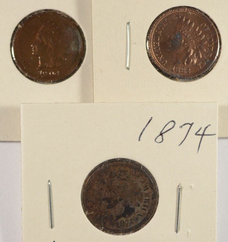 INDIAN CENTS: 1874 AG, 1882 AU SPOTS, 1904 AU CLEANED