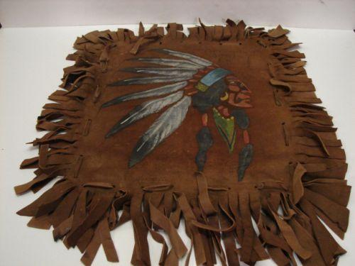 INDIAN CHIEF PAINTING ON DEER SKIN. Depicts side profile of Indian chief. Titled at upper right "Chief Scaring Eagle" and marked in lower left "Montreal". 24" x 24"