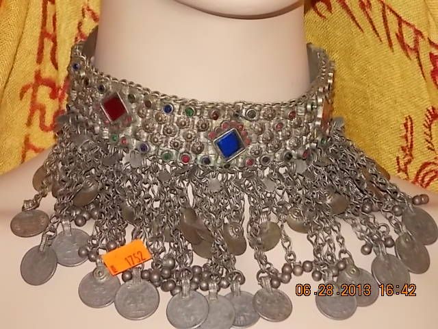 INDIAN CHOKER - CHAINS HANGING DOWN WITH COINS - RED, BLUE & GREEN GEMS (SOME MAY BE MISSING)