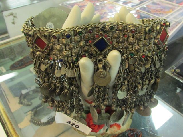 INDIAN CHOKER - CHAINS HANGING DOWN WITH COINS - RED, BLUE & GREEN GEMS (SOME MAY BE MISSING)