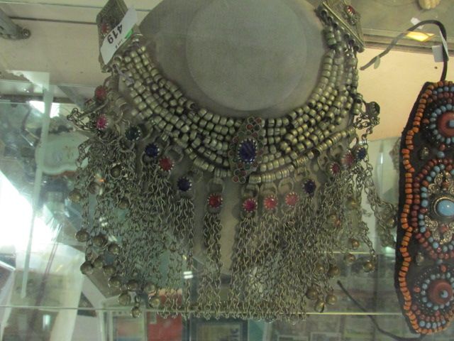 INDIAN CHOKER - CHAINS HANGING DOWN WITH GHUNGRUS (SMALL BELLS) - RED, BLUE & GREEN BEADS (SOME MAY BE MISSING)