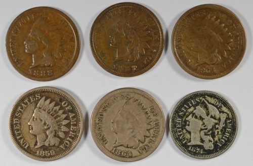 INDIAN ONE CENT: 1863 F, 1864 C N G, 1859 VG, 1888 G, 1889 XF, AND A FREE 1874