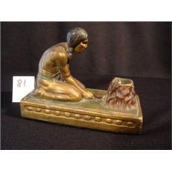 4 1/4" tall by 5 3/4" by 2 1/2" Plaster Incense Burner with Indian lighting a fire in a tree stump. Incense goes in stump. Painted with felt bottom and no chips.