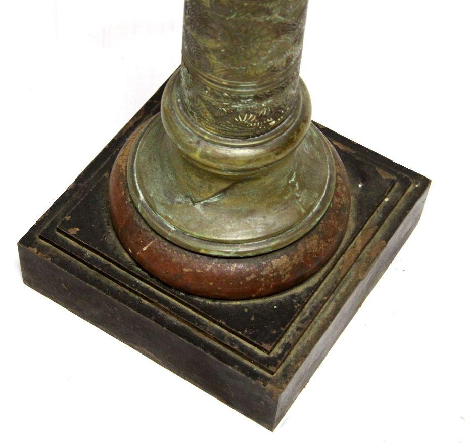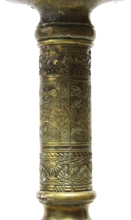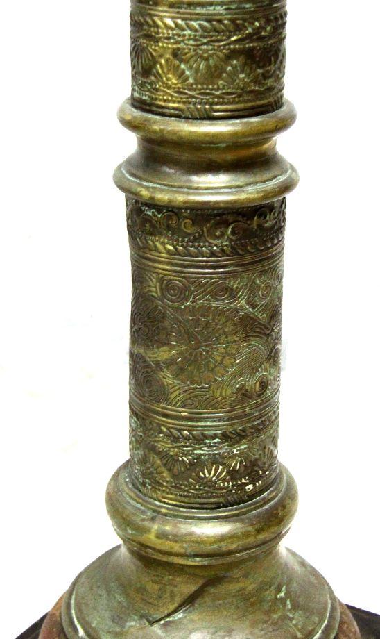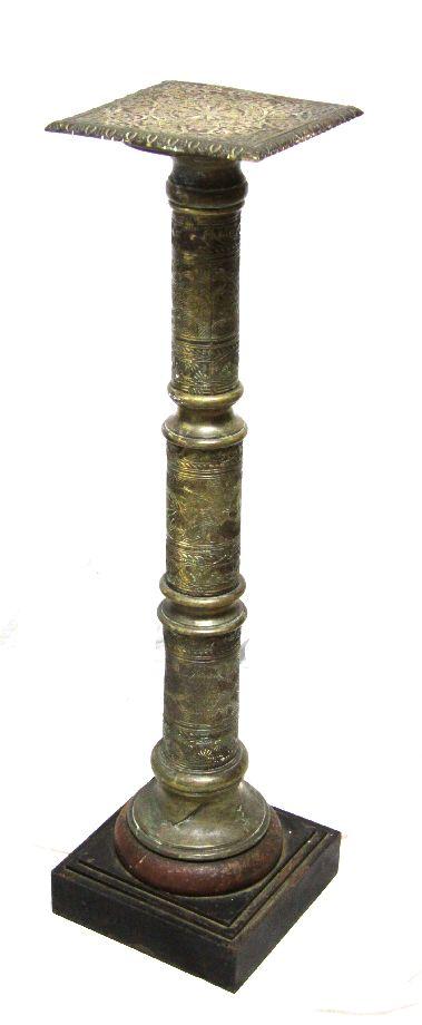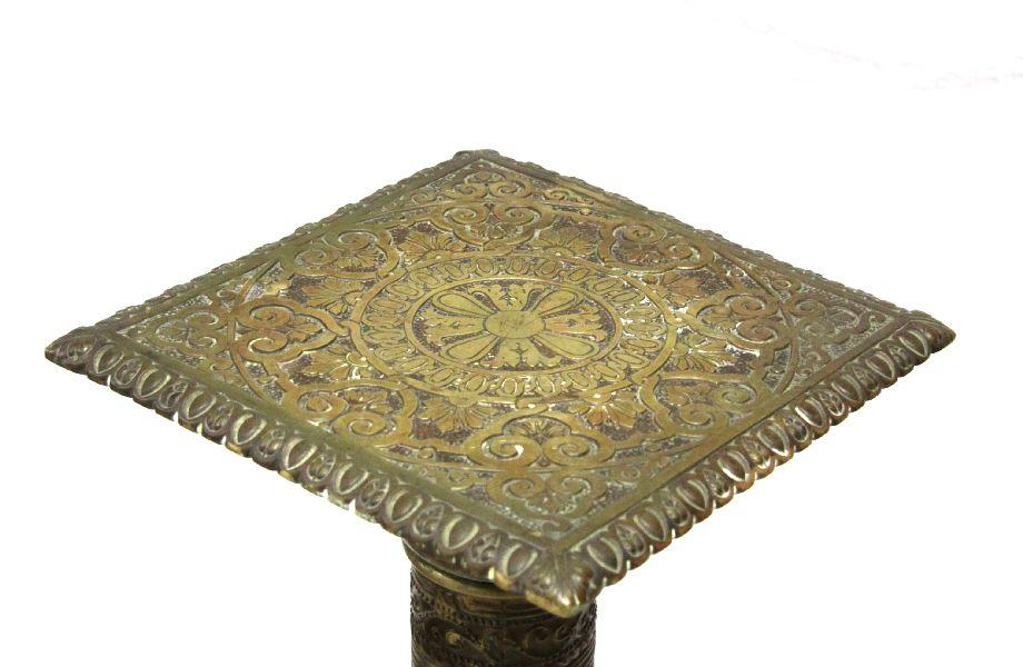 41 inches in height with 10x10 inch top. Patinaed brass pedestal with intricate floral and Indian designs. Overall good condition with a dent to one side mid-way up the column.