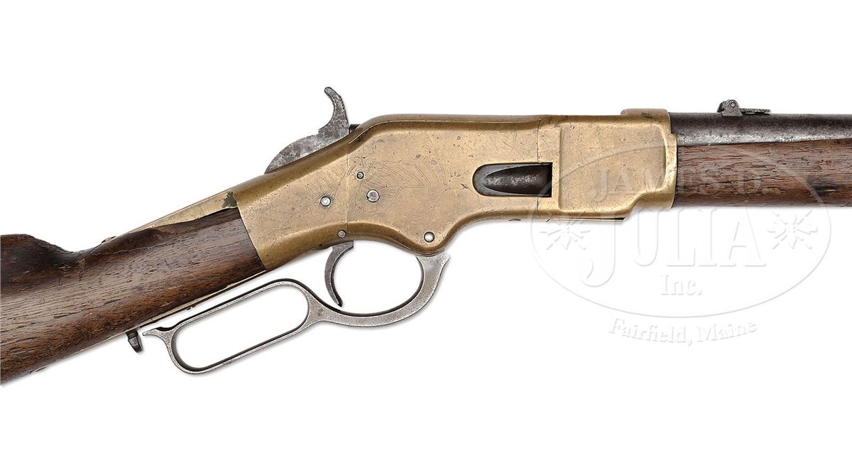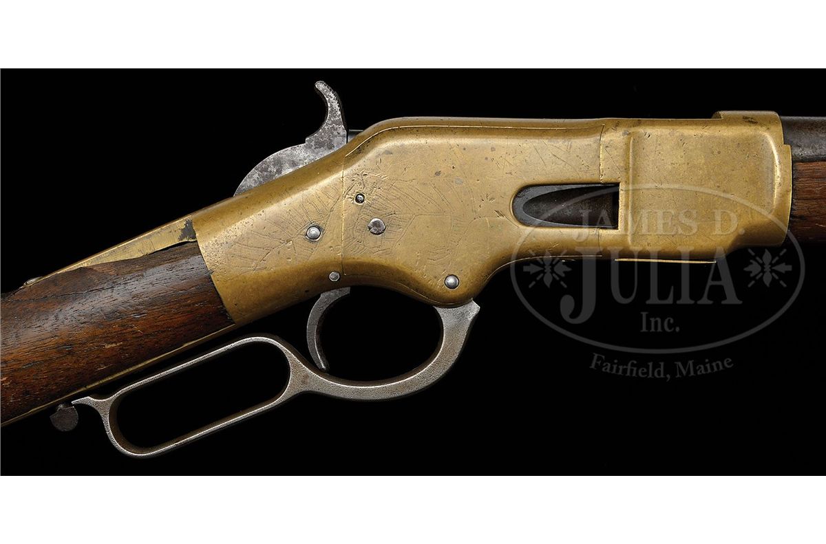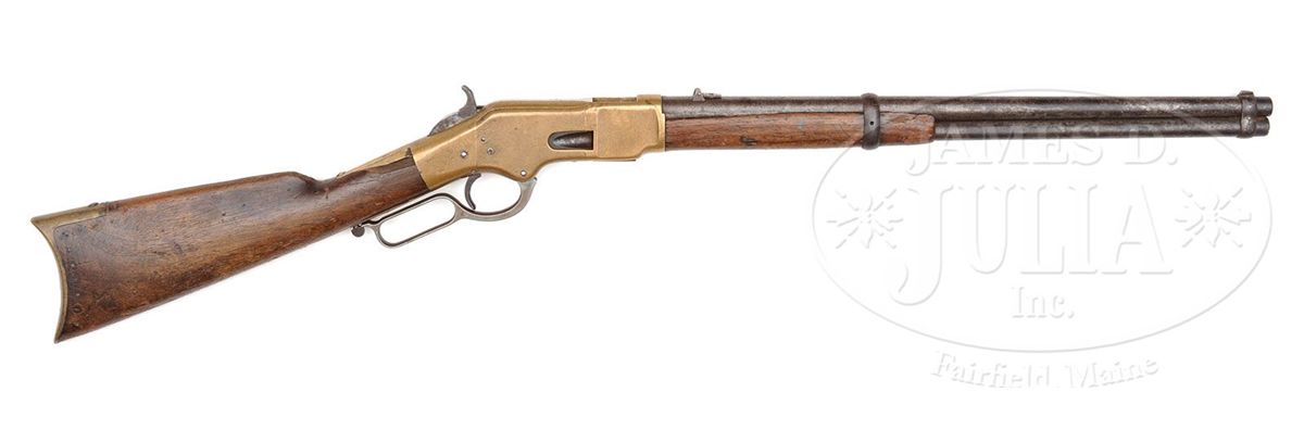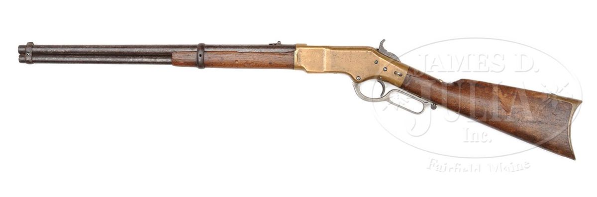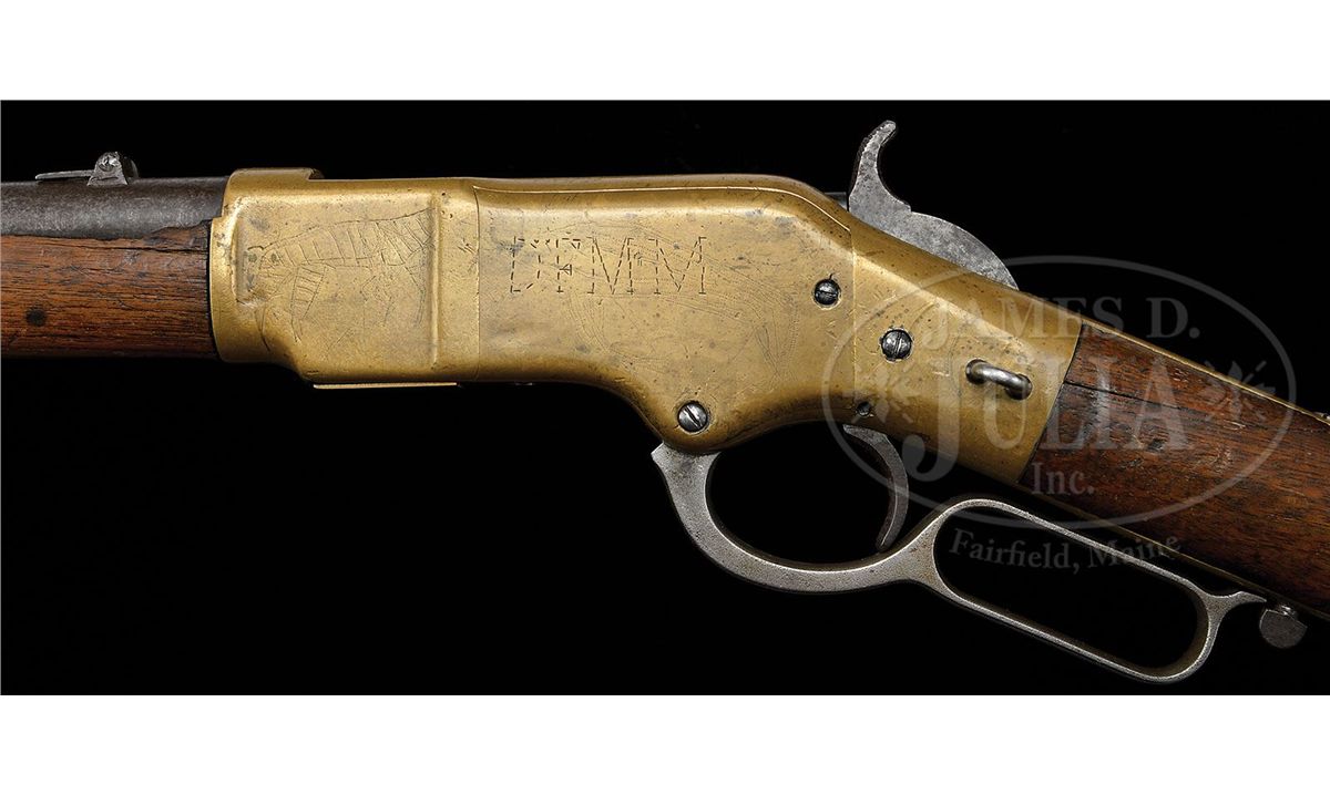 SN 39810. Cal. 44 RF Henry. Standard carbine with 20" rnd bbl, full magazine, integral front band/front sight, early thick forearm band & 2-position flip rear sight. Left side of the receiver has a saddle ring staple with the ring removed but not before it wore a groove in the receiver and the adjacent wood. Mounted with uncheckered straight grain American walnut with straight stock and a crescent brass buttplate with trap. Left side of the receiver is crudely engraved on the front flat with what appears to be a striped horse. Right side of the receiver is engraved with 2 similar horses. Left side plate is hand scratched with the initials "DFMM". This carbine exhibits all the traits of an Indian used firearm showing very hard use and wear with readily apparent saddle bow wear on the forearm, the crude horse engraving and the missing saddle ring. Buttstock also has a row of brass tack shanks around the right side of the buttplate, tackheads are missing. Trigger return spring & screw are missing. CONDITION: Fair. No orig finish remains on the steel parts which are mostly a mottled gray/brown patina. Receiver shows very heavy wear, especially around the carry point and the brass all retains a dark mustard patina. Stock has a break around the top tang and is missing a large chunk on the right side with small slivers missing around the bottom tang and long slivers missing from the forearm by the bbl channel. Left side of the forearm is very thin from saddle bow wear and handling. Aside from the missing trigger return spring, mechanics are fine. Strong dark bore with good rifling. 4-49068 JR161