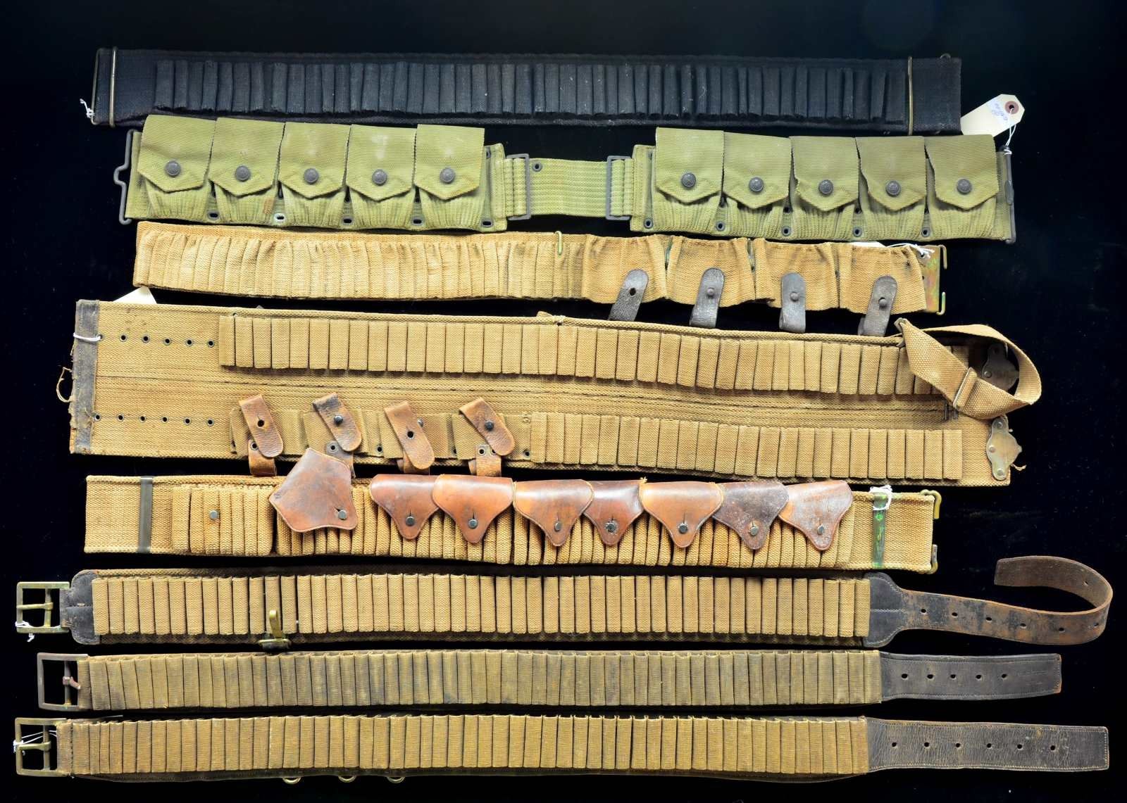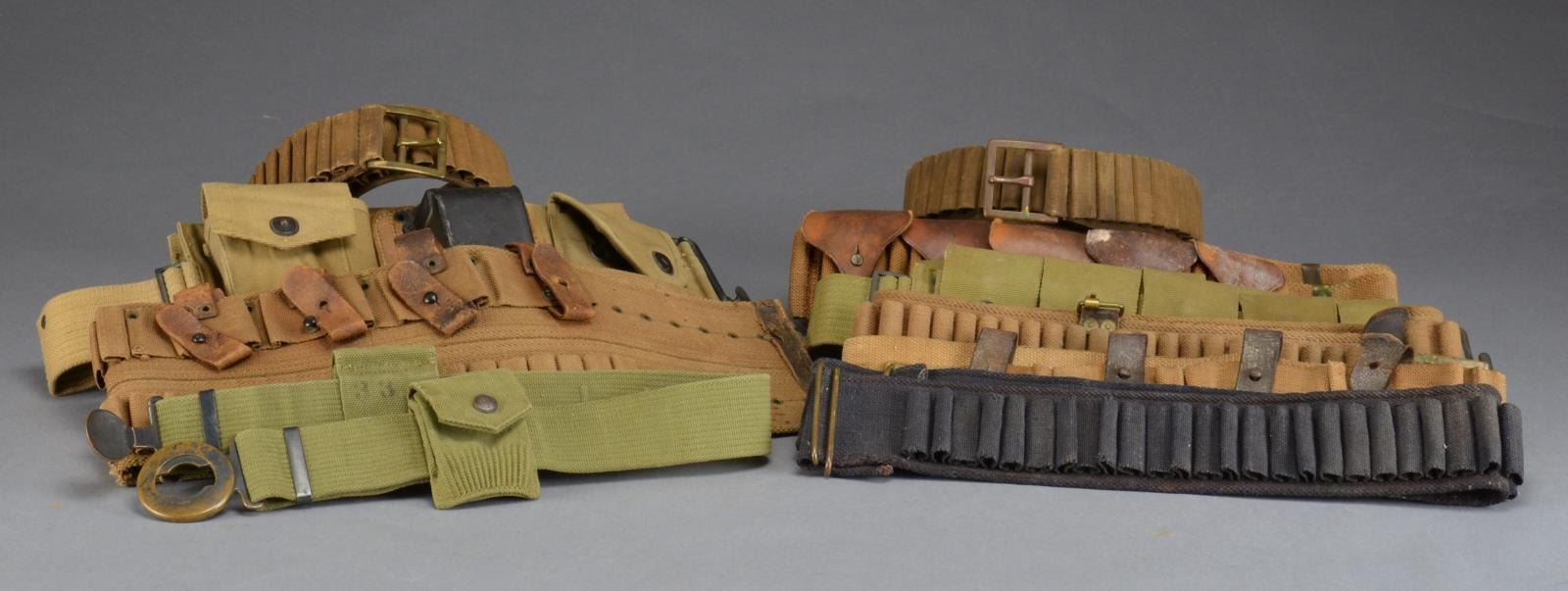 This varied lot of American military equipment includes a M1876 cartridge belt for the 45-70 cartridge. / 1 M1876 cartridge belt having the 1879 trial modification for the 45-70 cartridge. / 1 M1881 woven cavalry cartridge belt for the 45-70 cartridge. / 1 Circa 1894 blue woven cartridge belt w/ C closure for the 45-70 cartridge. / 1 M1910 enlisted garrison belt & buckle. / 1 M1910 dismounted cartridge belt having 10 pockets featuring rimmed snaps. / 1 Tan canvas Mills style cartridge belt having dbl. loops for the 45-70 cartridge. Cartridge belt features 10 leather flaps that cover cartridges & secure to iron studs. 2 Flaps are missing & 1 is torn. / 1 Canvas cartridge belt having “C” type closure that features 30 cartridge loops & 4 clip pockets having leather thong closures. / 1 Dbl. width canvas cartridge belt & over the shoulder strap having a hook closure. Belt has 40 cartridge loops on the top, 23 loops on the bottom combined w/ 4 clip pockets & leather thong closures. / 1 BAR cartridge belt w/ metal cup brace marked, “L.C.C. & CO. 11-18 RIFLEMANS RIGHT” & “L.C.C. & CO. 11-18 RIFLEMANS LEFT”. CONDITION: most items show light to moderate wear except as noted. (02-13678/BF). $1,200-1,800.