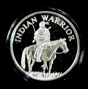 "INDIAN WARRIOR" ON A ONE OUNCE .999 SILVER ART ROUND, IN CAPSULE AND GIFT BOX
