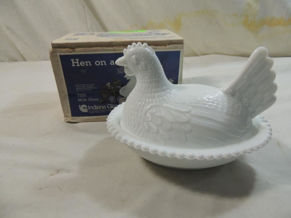 MILK GLASS INDIANA GLASS HEN ON A NEST DECORATIVE HEN VINTAGE KEN ON A NEST DISH AS SHOWN SEE PHOTO FOR MORE DETAILS