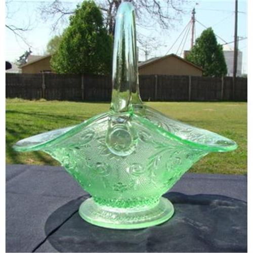 FOR SALE IS THIS LOVELY BASKET 10 1/2" TALL, 11 1/4" LONG AND 8" WIDE, IN THE 'TIARA SANDWICH' PATTERN BY INDIANA, IN CHANTILLY GREEN. THE GLASS MAKERS MARK JT. IN EXCELLENT CONDITION