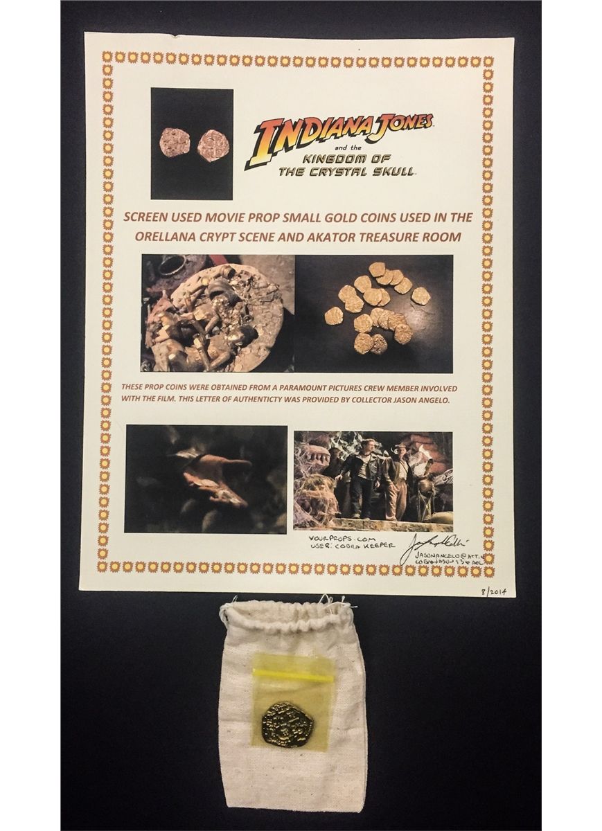INDIANA JONES AND THE KINGDOM OF THE CRYSTAL SKULL SCREEN USED GOLD COIN PROP. INCLUDES A LETTER.