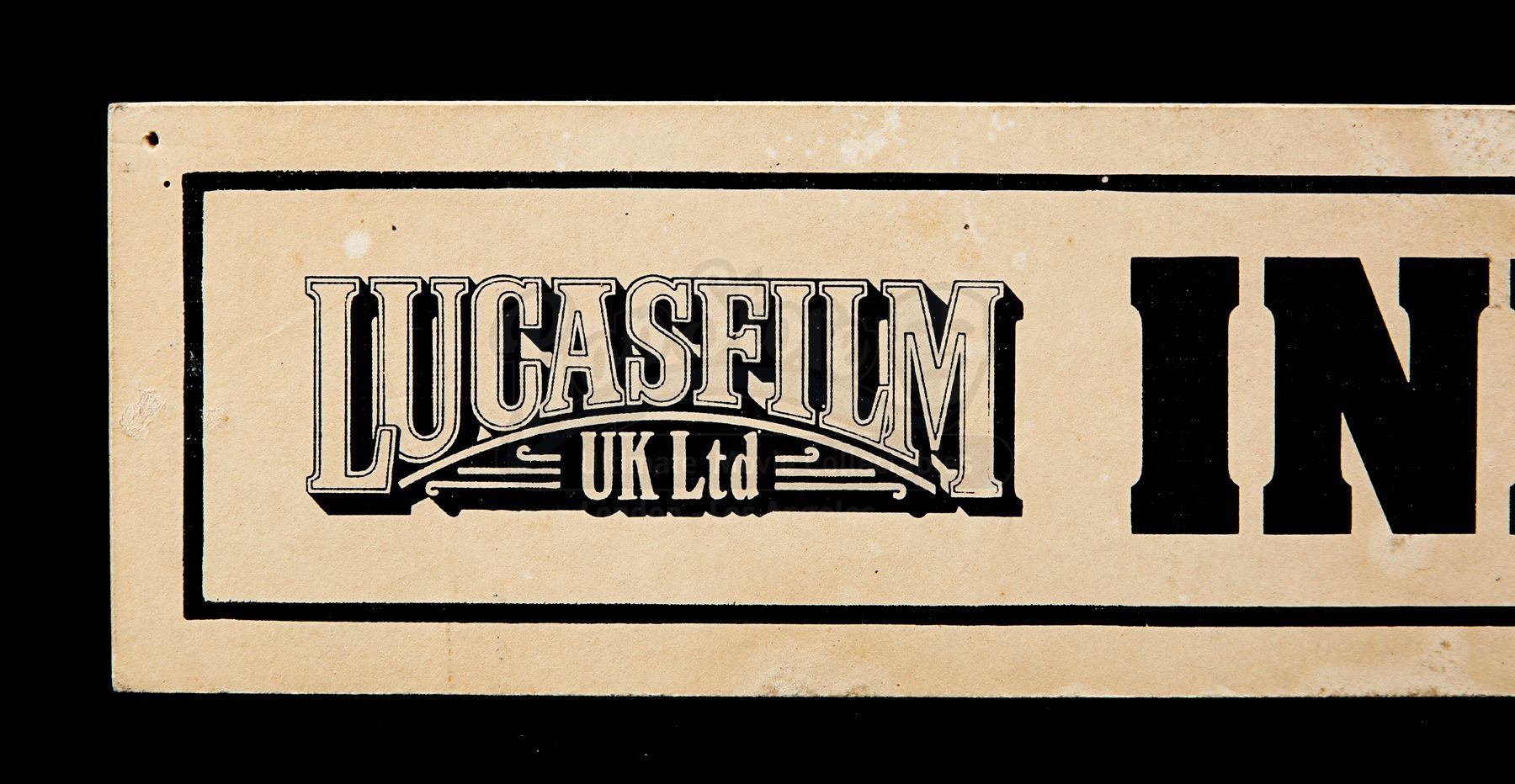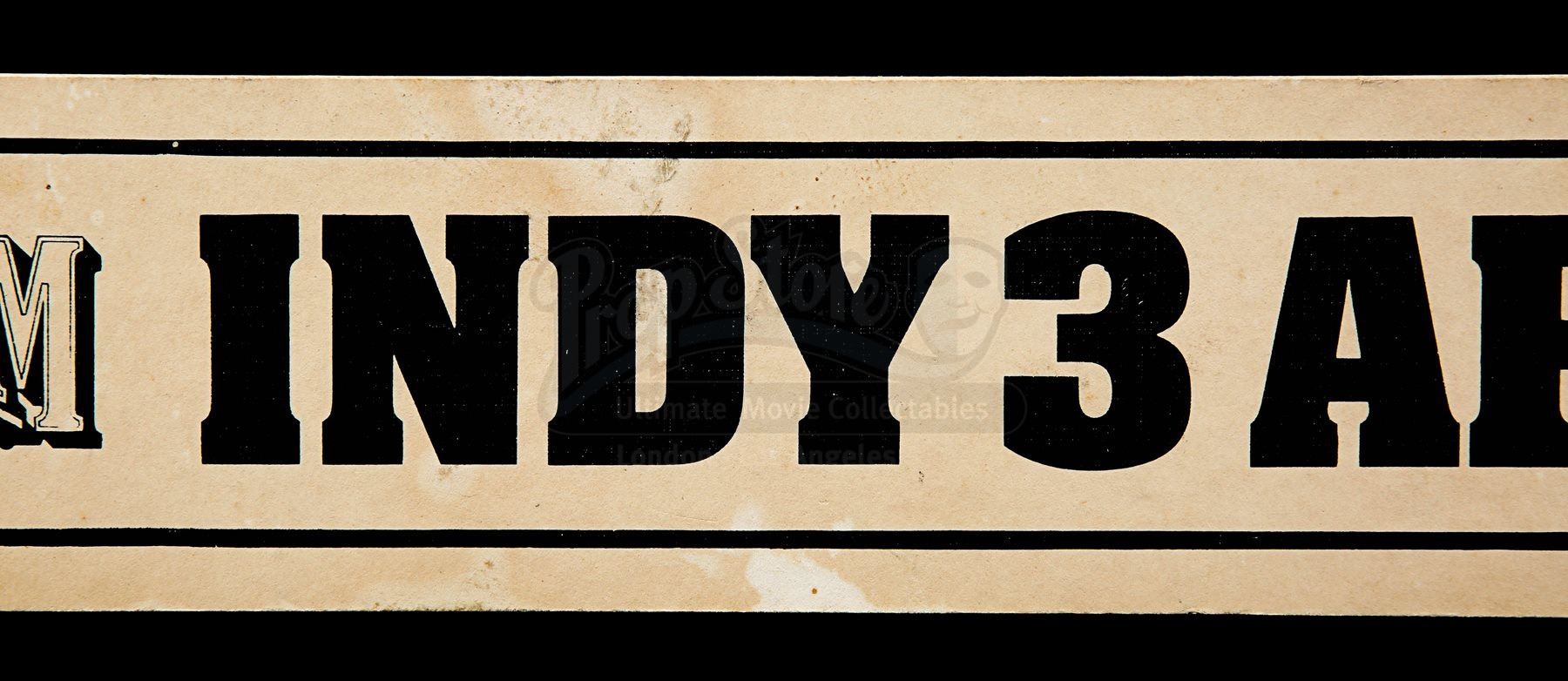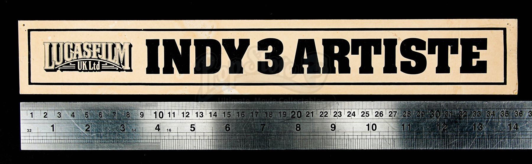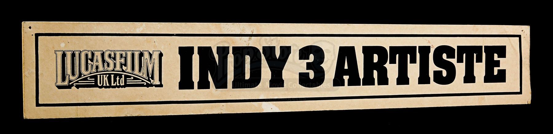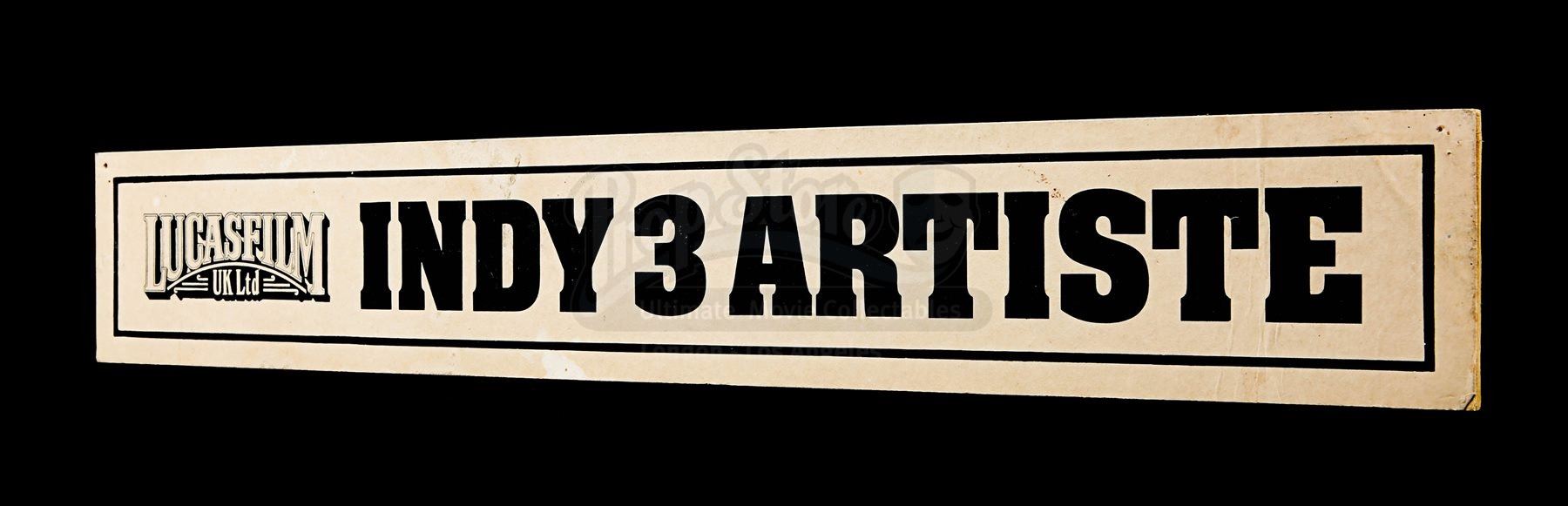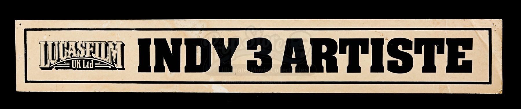 An artiste door sign from Steven Spielberg’s action adventure Indiana Jones and the Last Crusade. This sign would have marked the various cast member’s dressing rooms while on location and at the studios. Made from beige card, the door sign displays a black “Lucas Film UK Ltd” logo and the text “Indy 3 Artiste”, all printed within a black border. There are signs of wear, including crease lines, marks from age and remnants of Blu Tack on the back. Dimensions: 5.5 cm x 36 cm x 0.2 cm (2 ¼” x 14 ¼” x ¼”)