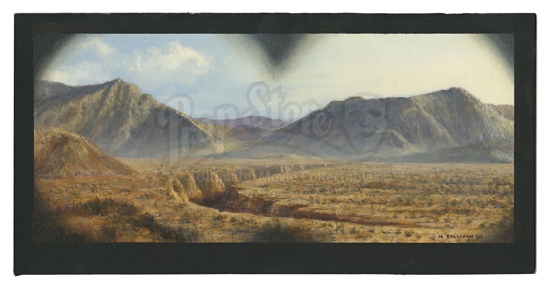 This hand-painted concept study for a matte painting of the canyon as seen with binoculars was created by ILM matte painting supervisor Mark Sullivan. It is rendered in oil paint and mixed media on thin illustration paper affixed to black illustration board, and initialled "M SULLIVAN 89". The board exhibits minor signs of wear along the edges. Dimensions: 31.75 cm x 16 cm (12 1/2" x 6 1/4")