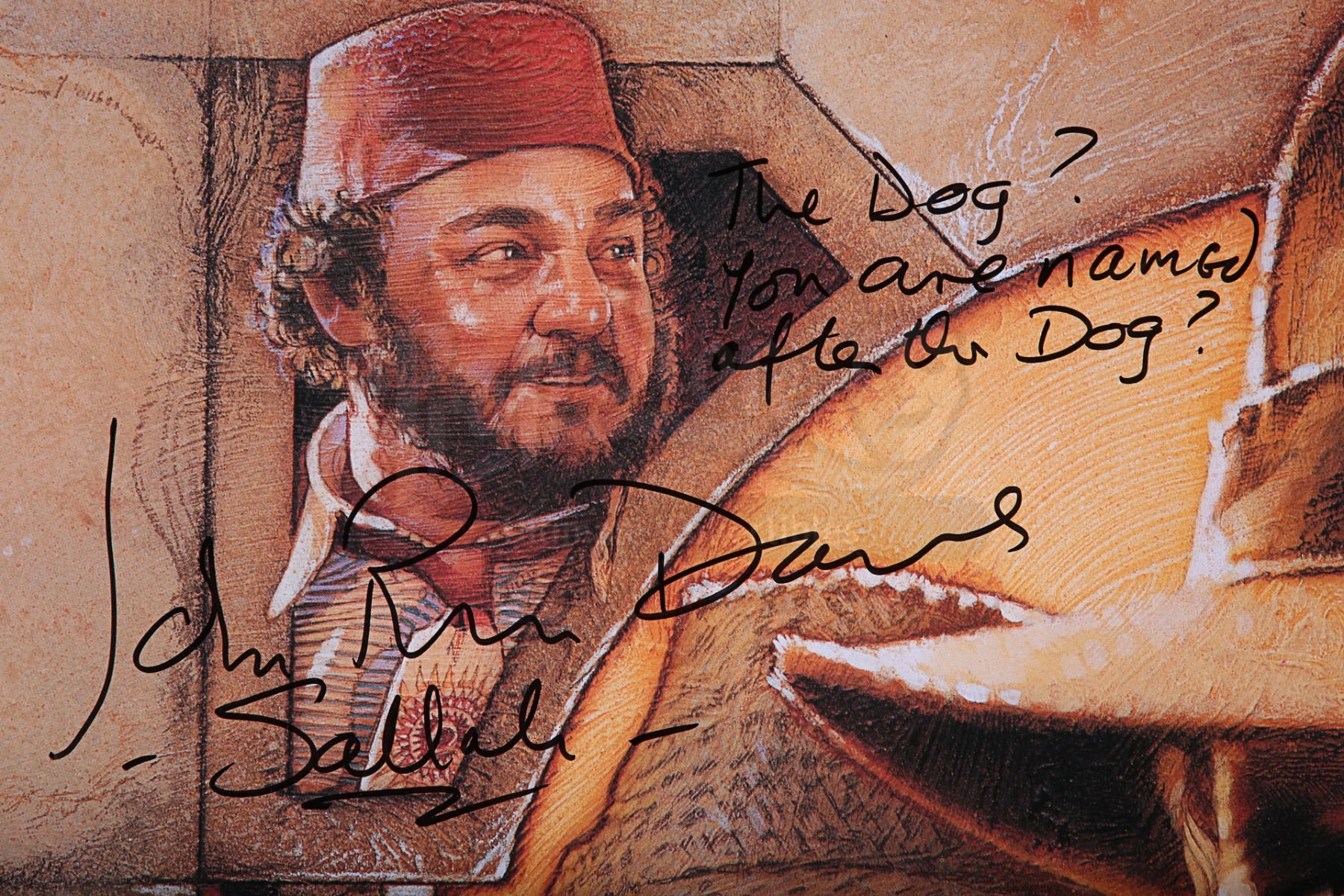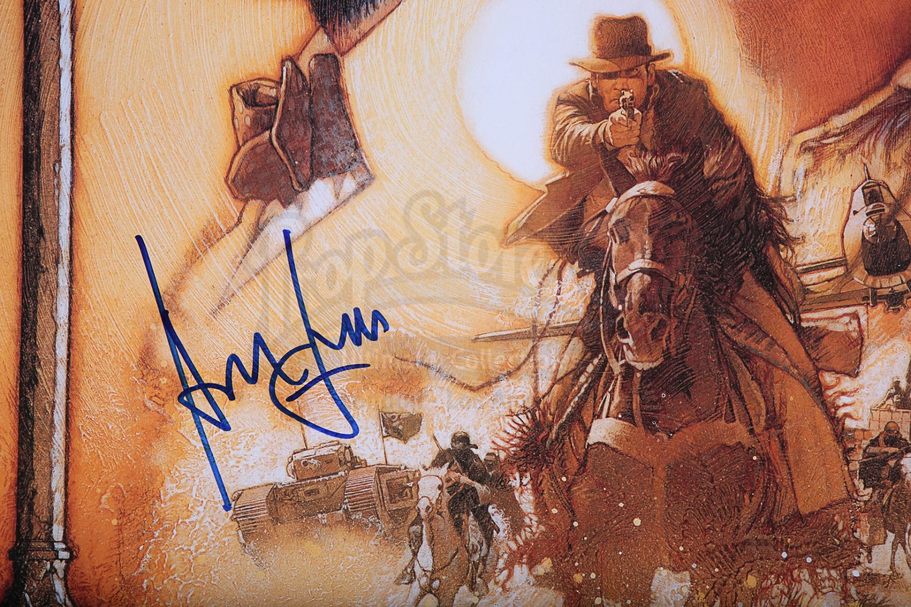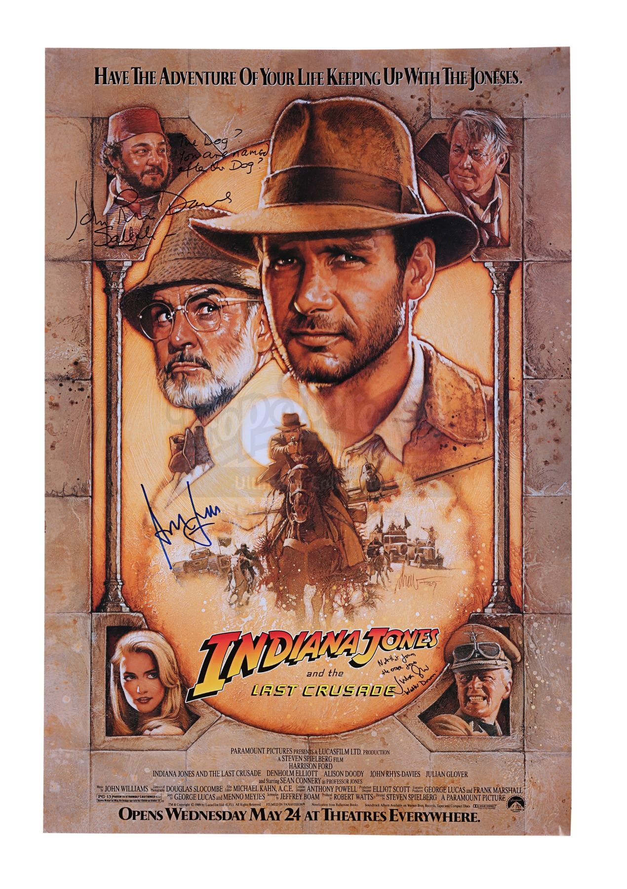Printed on glossy paper, this original one-sheet displays artwork by renowned poster artist Drew Struzan and features Indiana Jones (Harrison Ford), Professor Henry Jones (Sean Connery), Sallah (John Rhys-Davies), Marcus Brody (Denholm Elliott), Walter Donovan (Julian Glover) and Elsa (Alison Doody). Above the title artwork, Indy is depicted aiming a pistol while riding a horse, pursued by a plane, tanks and several assassins on horseback. The poster is autographed in blue and black ink by Ford, Rhys-Davies and Glover. The lot displays a small fold in one corner, light creasing and minimal wear. Dimensions: 101.5 cm x 68.5 cm (40" x 27")