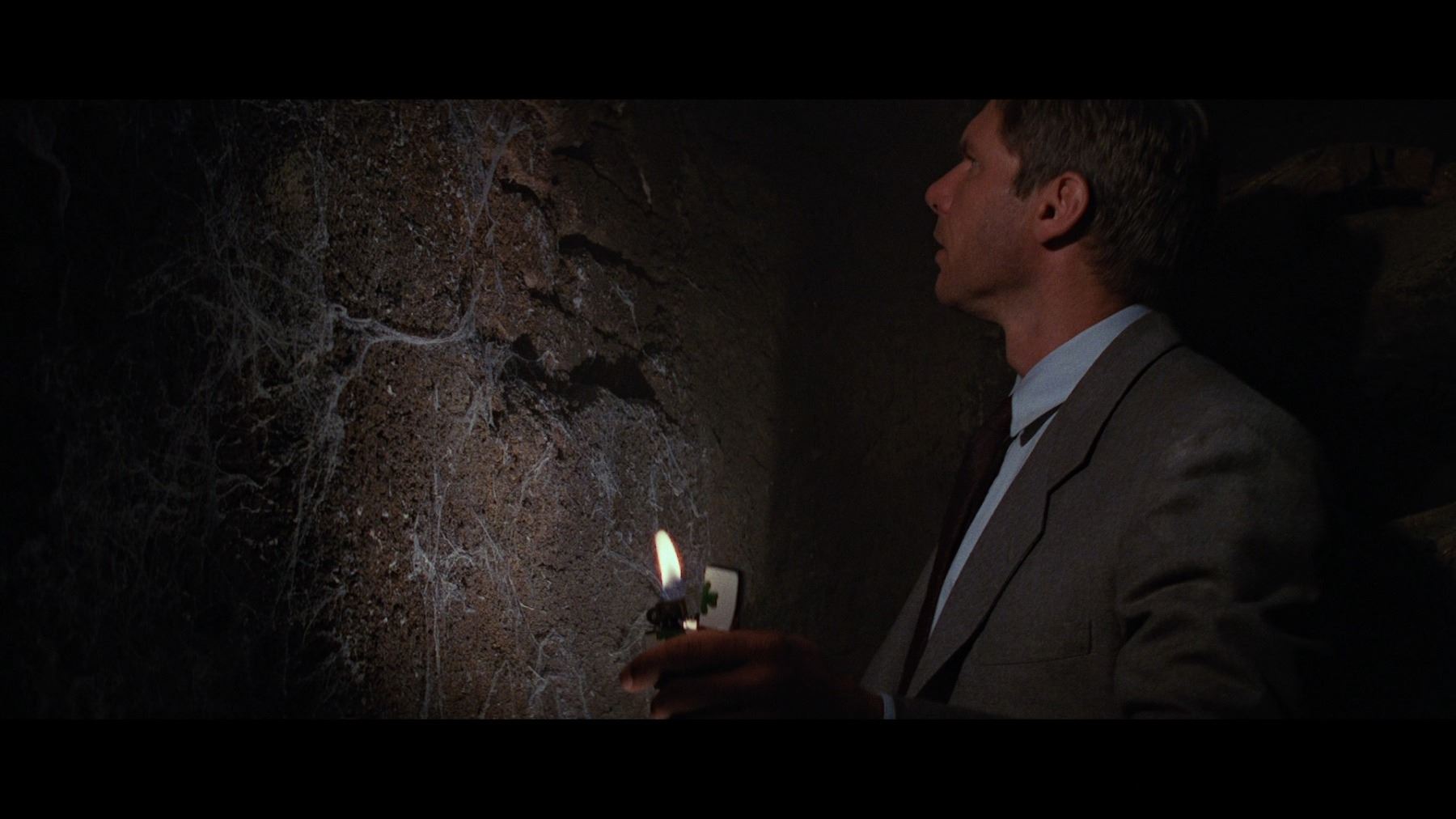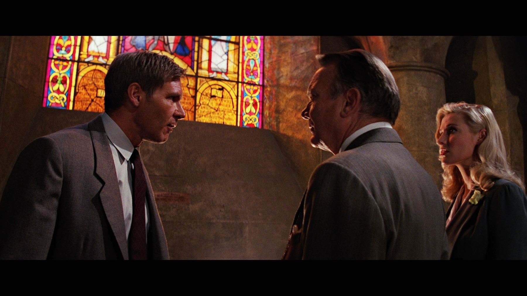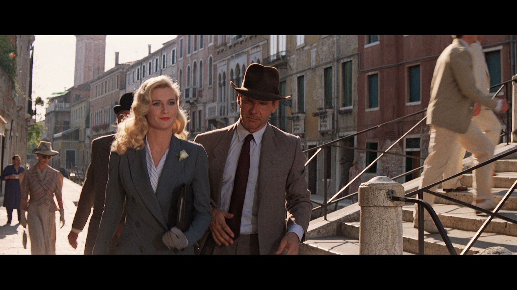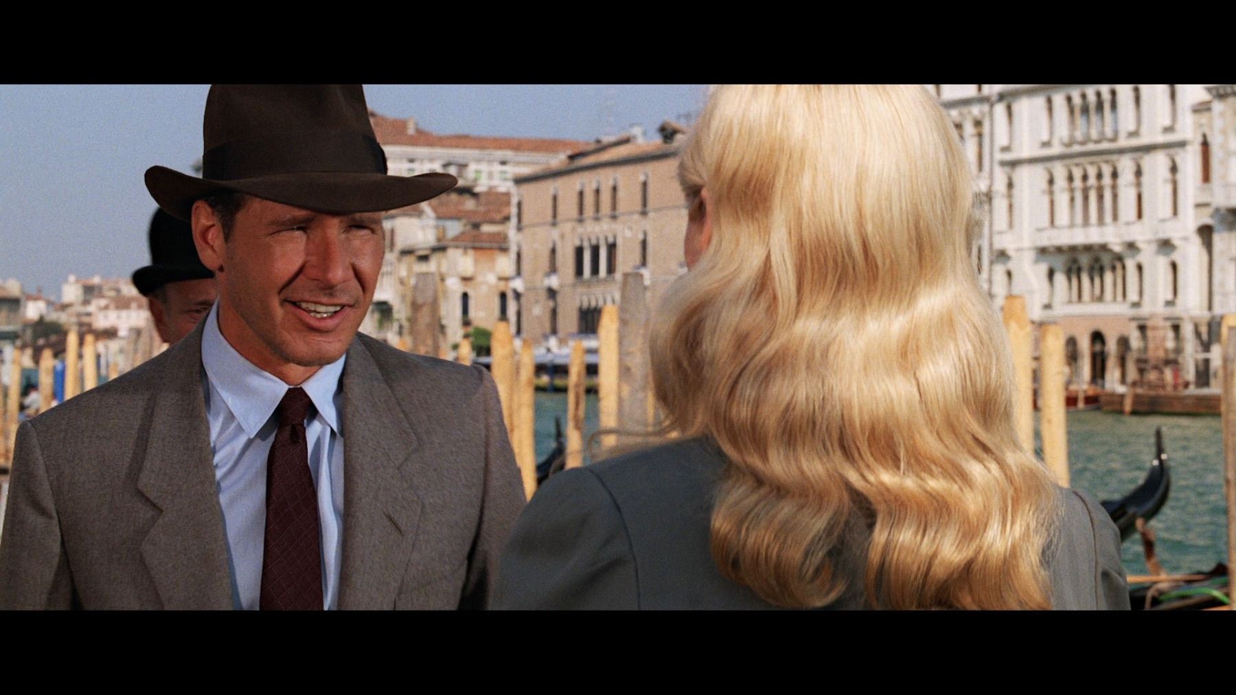 Indiana Jones' (Harrison Ford) Venice suit from Steven Spielberg's action-adventure sequel Indiana Jones and the Last Crusade. Indy wore his suit when he ventured to Venice alongside Marcus Brody (Denholm Elliott) to locate his vanished father Professor Henry Jones (Sean Connery). He later wore it when, with Elsa Schneider (Alison Doody), he discovered the catacombs beneath the Venice Library which contained the tomb of First Crusade knight Sir Richard.