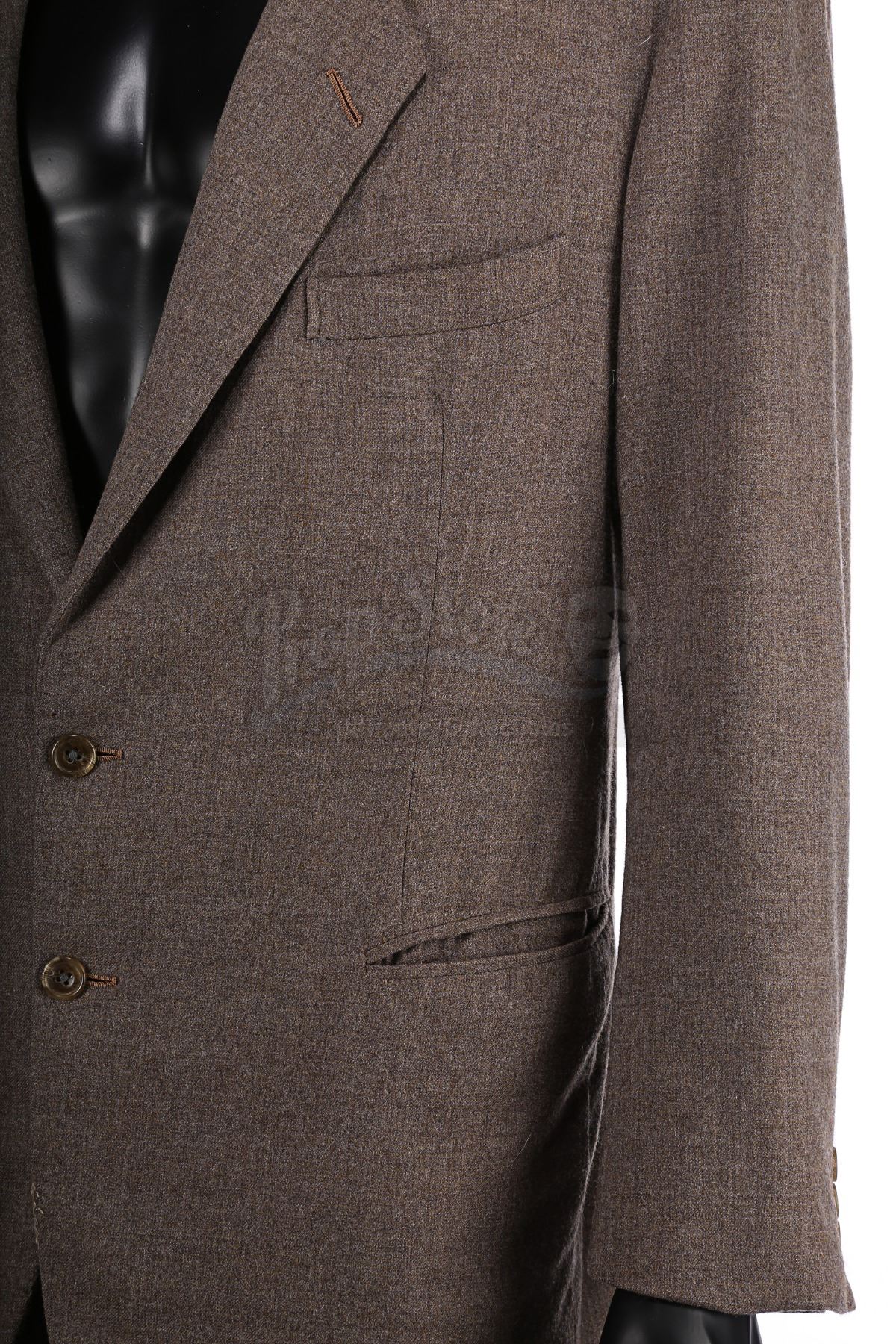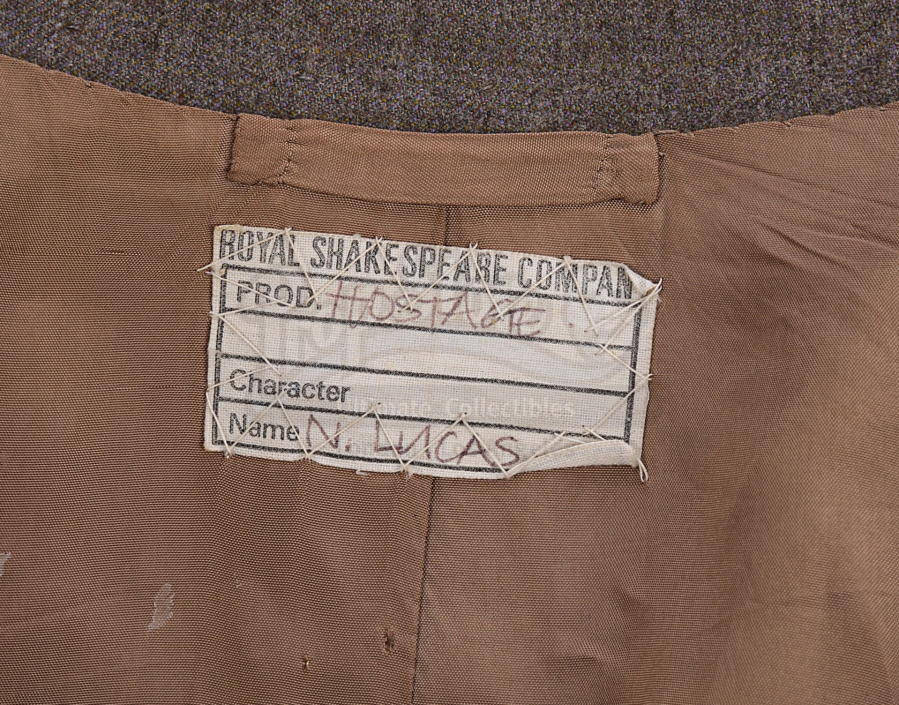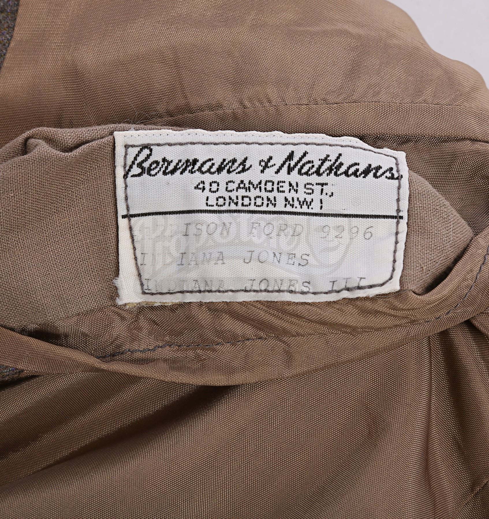 The suit consists of a single-breasted jacket and trousers, both made from a grey-and-brown textured cotton-polyester blend. Three pockets adorn the front of the jacket, and it is lined with a light brown silk. The trousers feature zip flies and turned up hems, and multiple buttons are sewn inside the waistband where braces would have been attached. A Bermans & Nathans label is located in the right interior jacket pocket, displaying printed text which reads "Harrison Ford 9296, Indiana Jones, Indiana Jones III". A Royal Shakespeare Company label is also sewn into the garment, suggesting that this jacket was used for a different production after filming was completed. The costume shows signs of wear and age, notably on the jacket lining, which displays several stains and holes on the right side, with stitching that has come undone around the armpits. Several small holes are present on the crotch area and the back of the trousers.