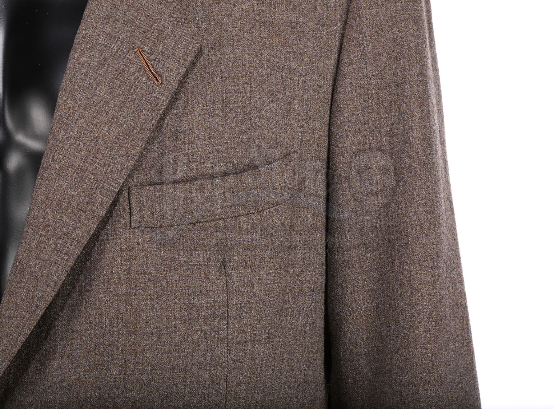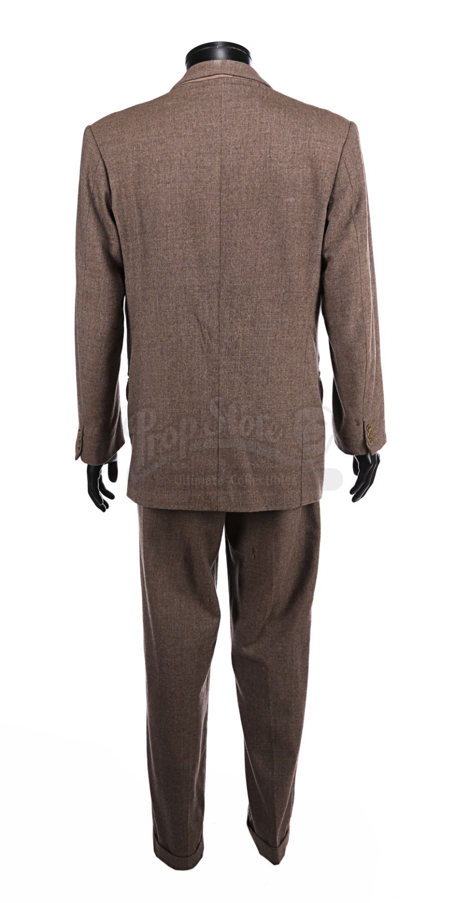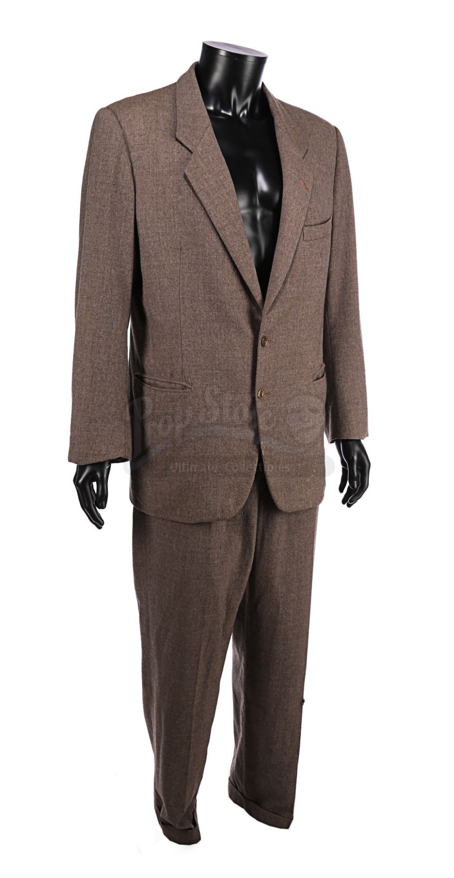 The suit consists of a single-breasted jacket and trousers, both made from a grey-and-brown textured cotton-polyester blend. Three pockets adorn the front of the jacket, and it is lined with a light brown silk. The trousers feature zip flies and turned up hems, and multiple buttons are sewn inside the waistband where braces would have been attached. A Bermans & Nathans label is located in the right interior jacket pocket, displaying printed text which reads "Harrison Ford 9296, Indiana Jones, Indiana Jones III". A Royal Shakespeare Company label is also sewn into the garment, suggesting that this jacket was used for a different production after filming was completed. The costume shows signs of wear and age, notably on the jacket lining, which displays several stains and holes on the right side, with stitching that has come undone around the armpits. Several small holes are present on the crotch area and the back of the trousers.
