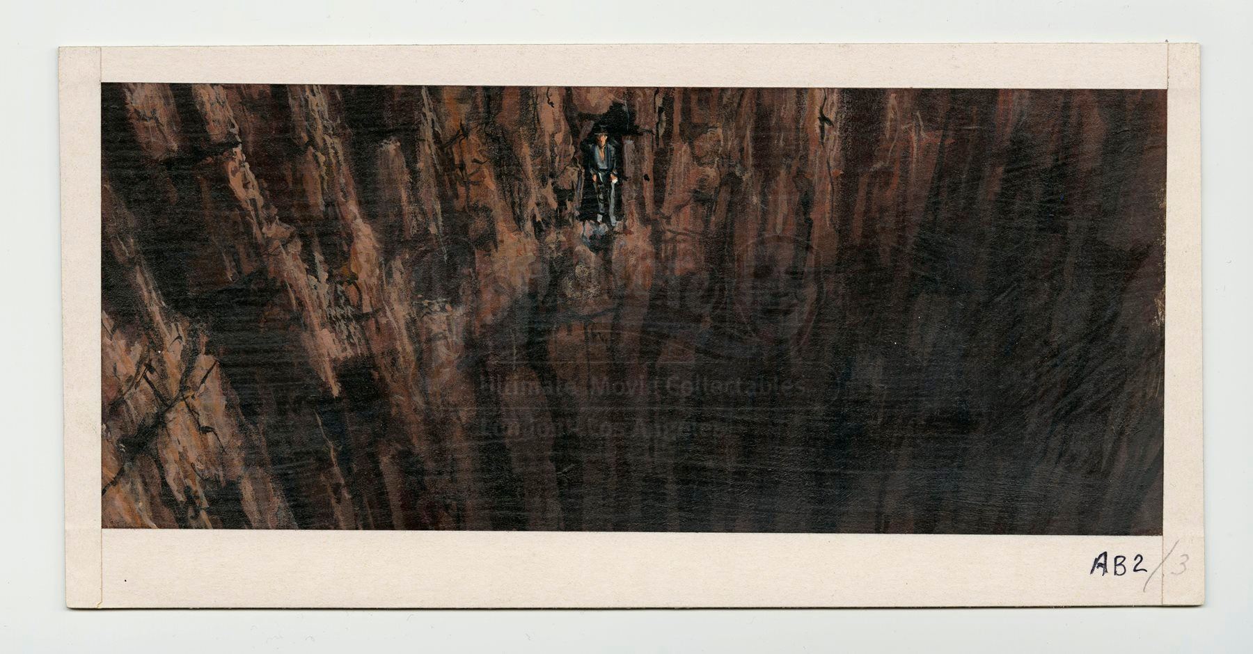 Illustrated by ILM matte artist Mark Sullivan, the hand-painted matte study is done on illustration board using acrylic paints, and shows Indy standing on a ledge before a great open chasm. Written at the bottom of the board is “AB 2/3” in ink and pencil. Showing minor wear due to production use and age, the board remains in good condition. Dimensions: 25 cm x 12 cm (9 ¾” x 4 ¾”)