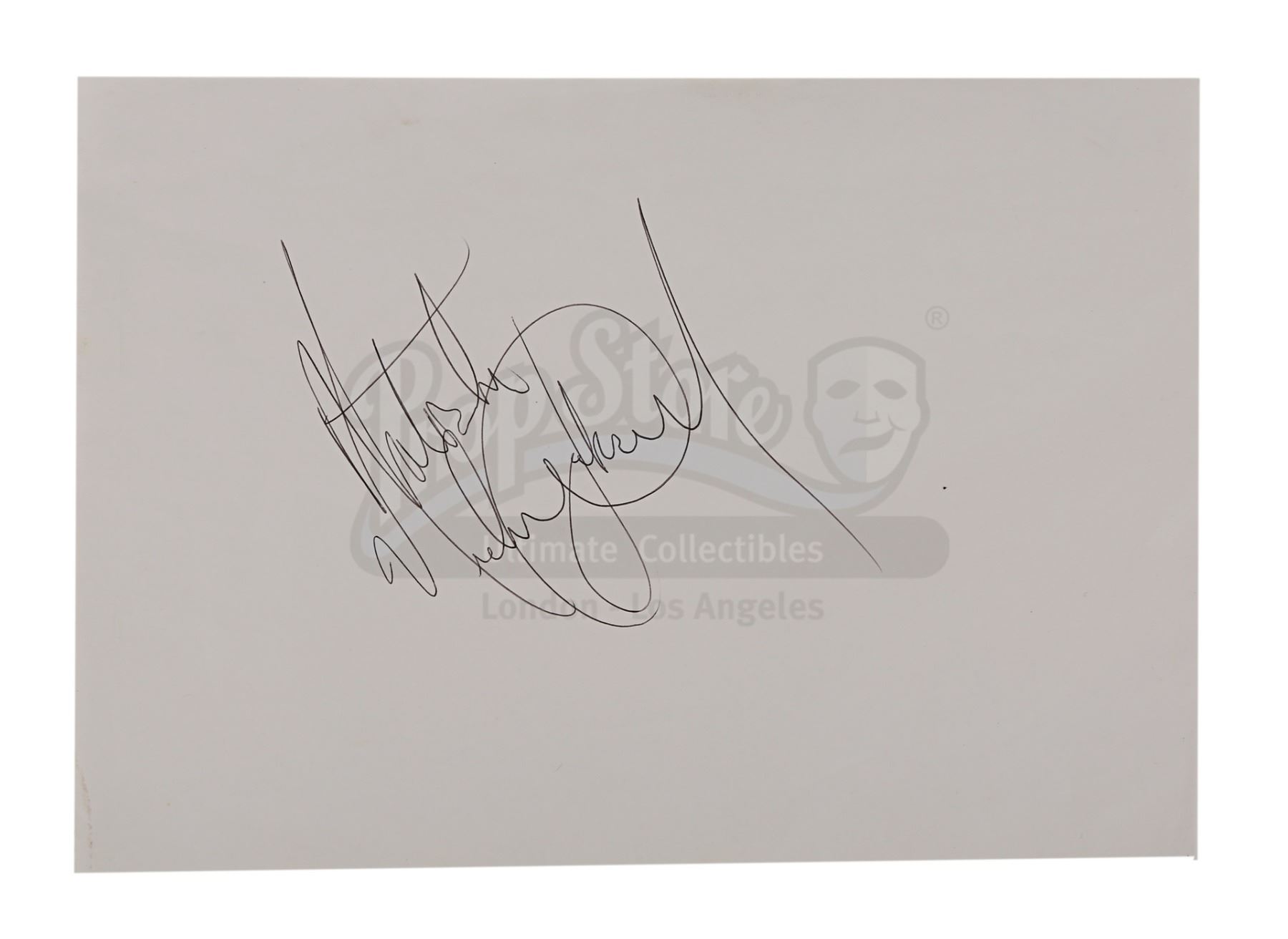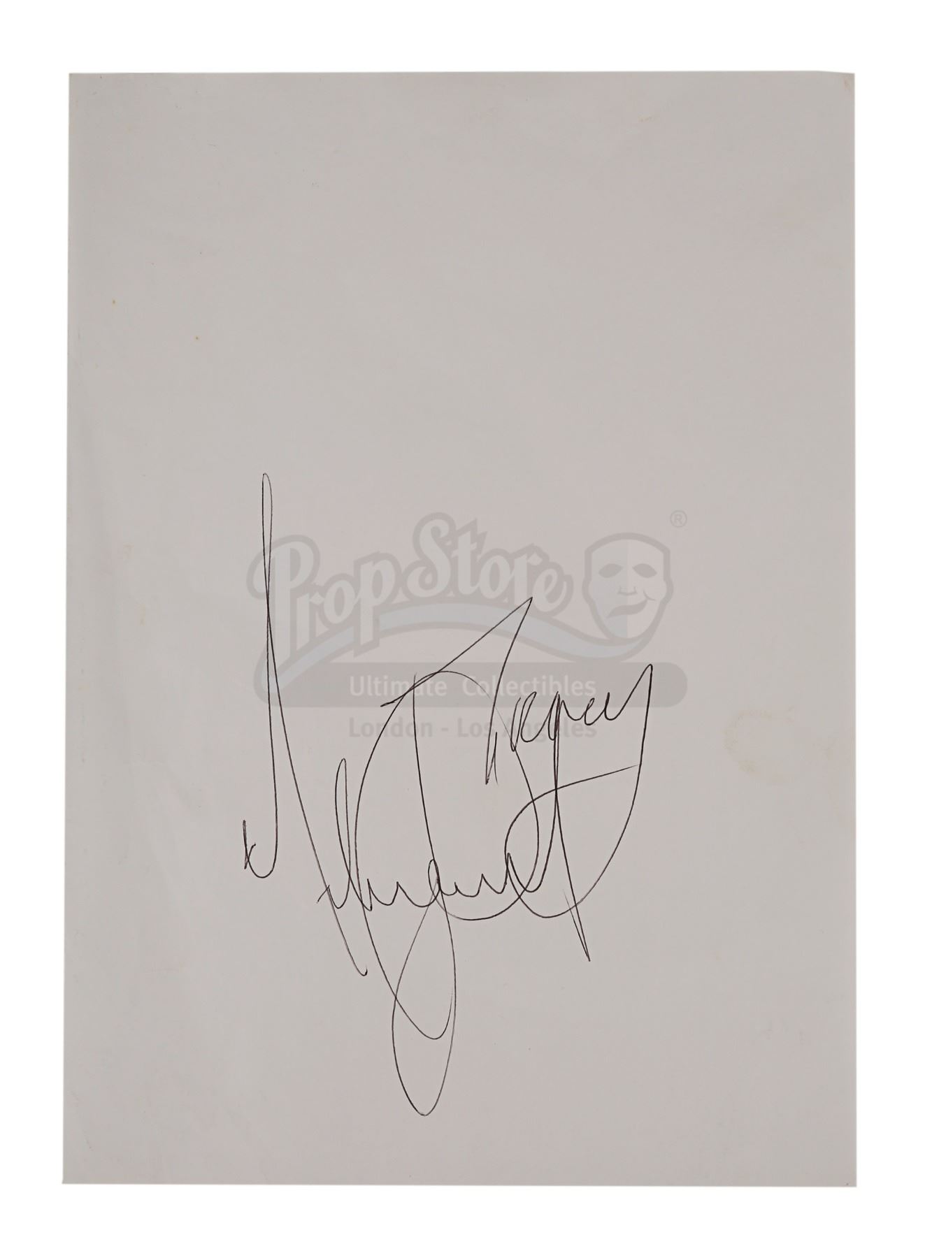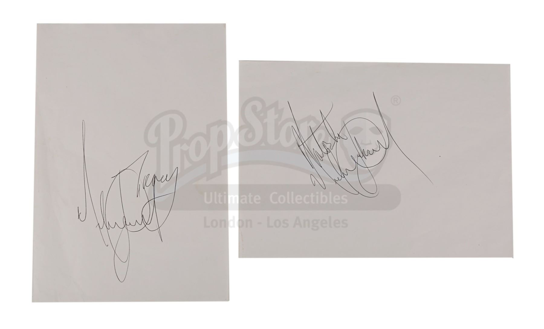Two Michael Jackson autographs obtained from a crew member on the set of Steven Spielberg's Indiana Jones and the Last Crusade. Jackson visited Elstree Studios during filming in 1988 while he was in London for the European leg of his "BAD" world concert tour. The two white A4 sheets are autographed by the one-time "King of Pop" in black ballpoint pen and are inscribed to "Natasha" and "Tracy". The lot displays light creasing and one sheet shows slight water damage. Dimensions (each sheet): 29.5 cm x 21 cm (11 1/2" x 8 1/4")