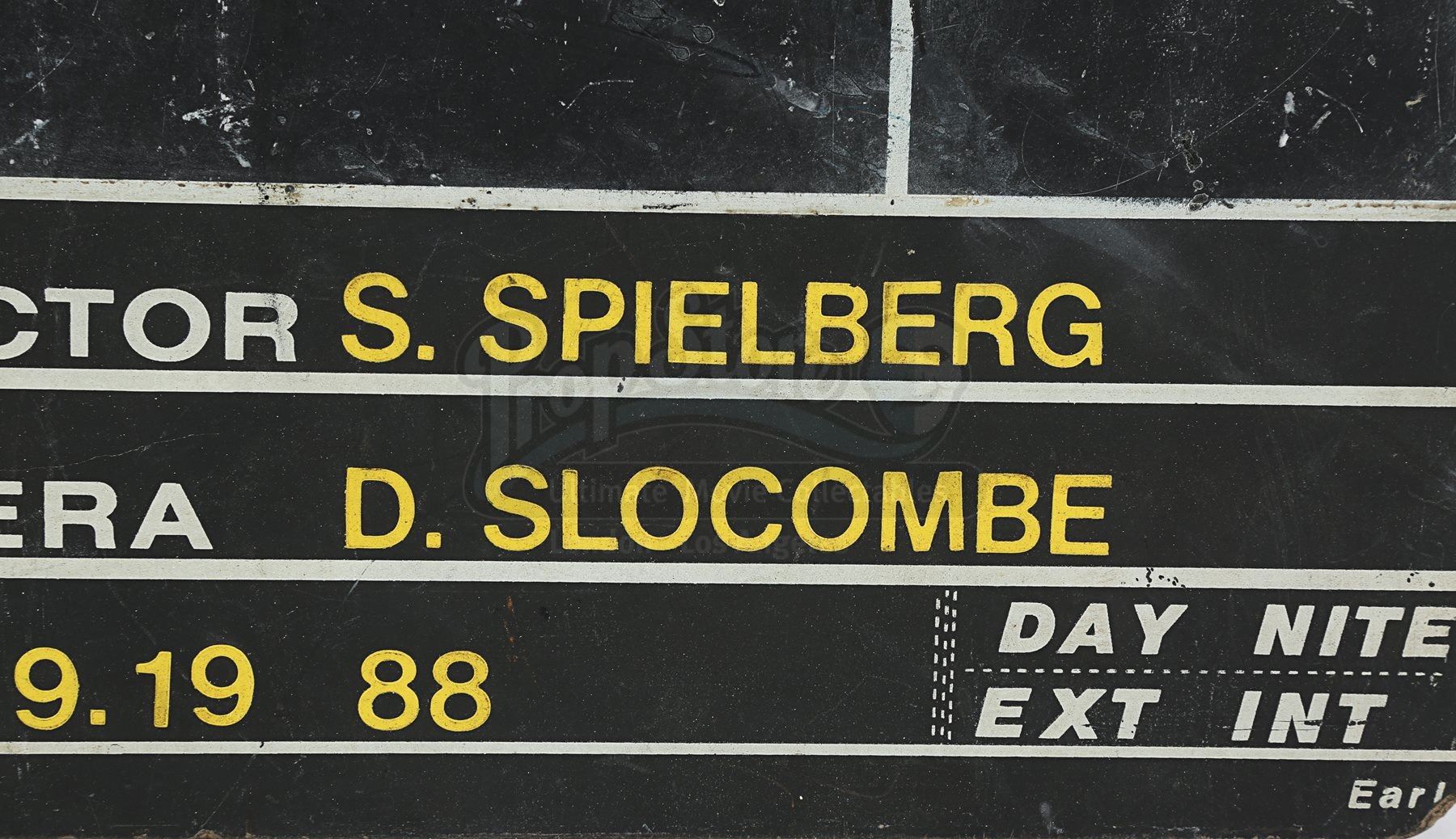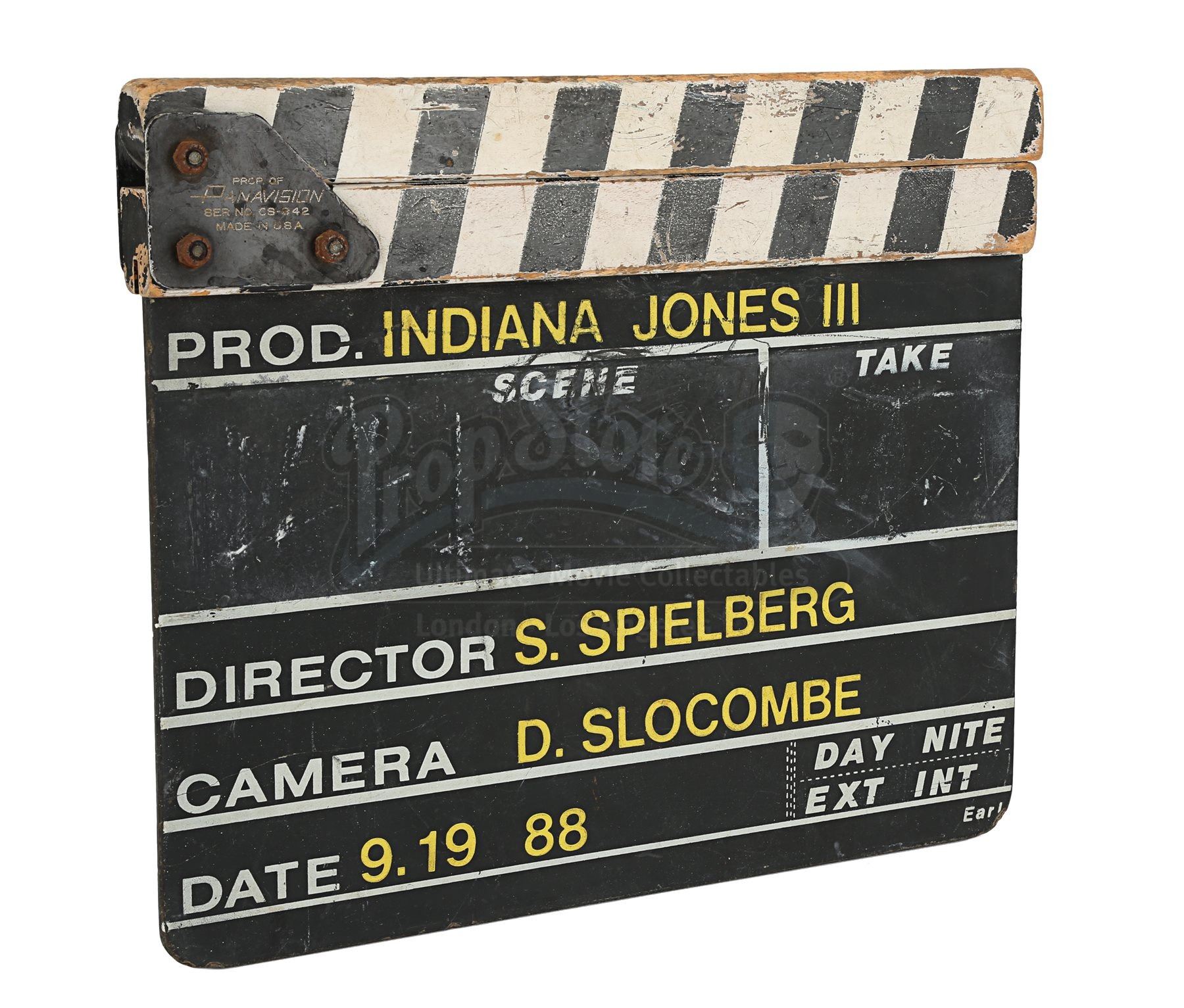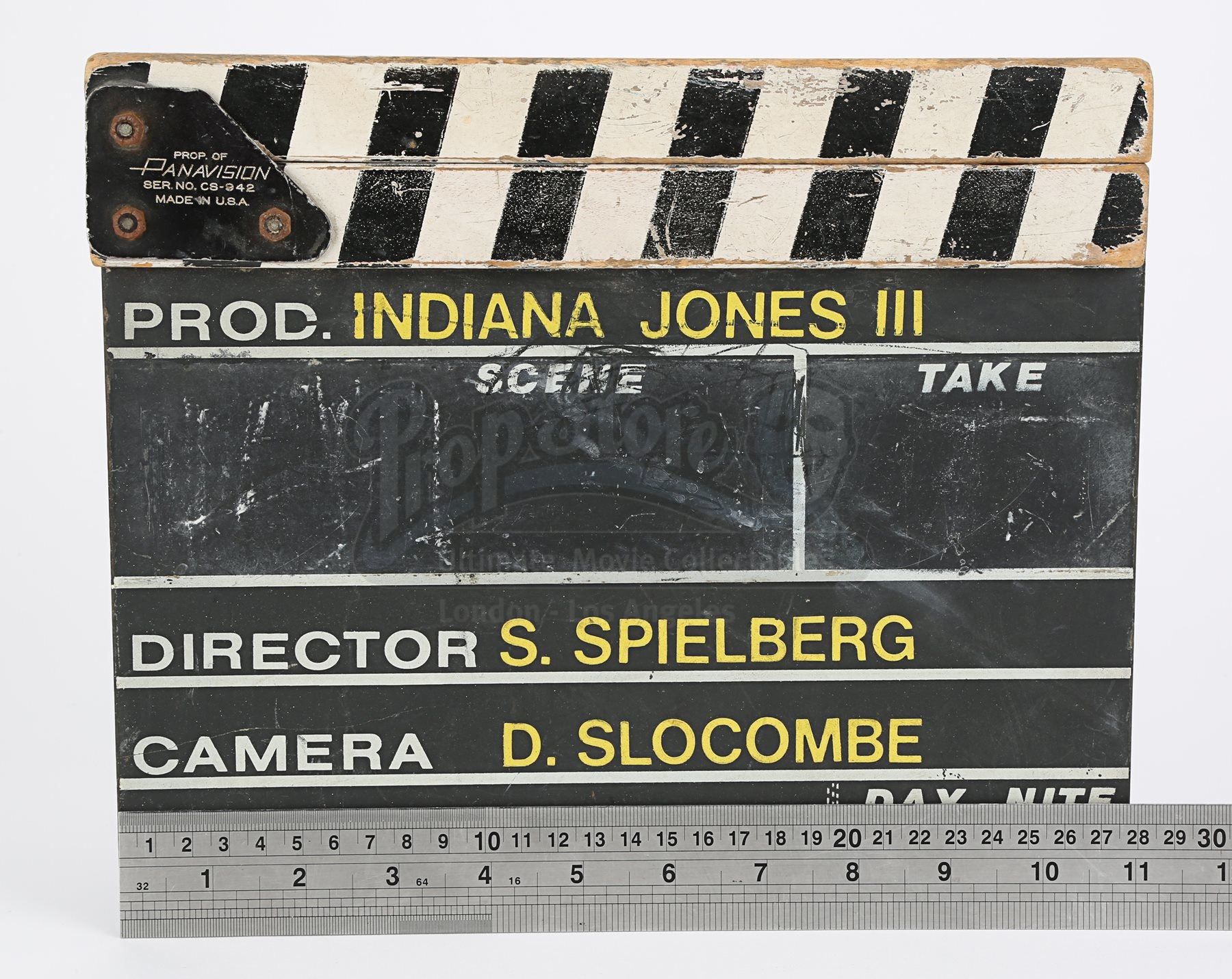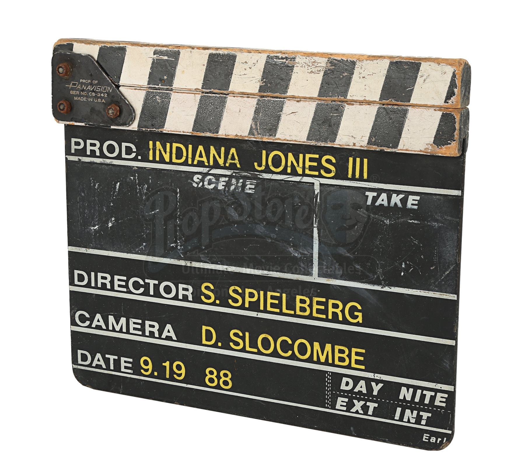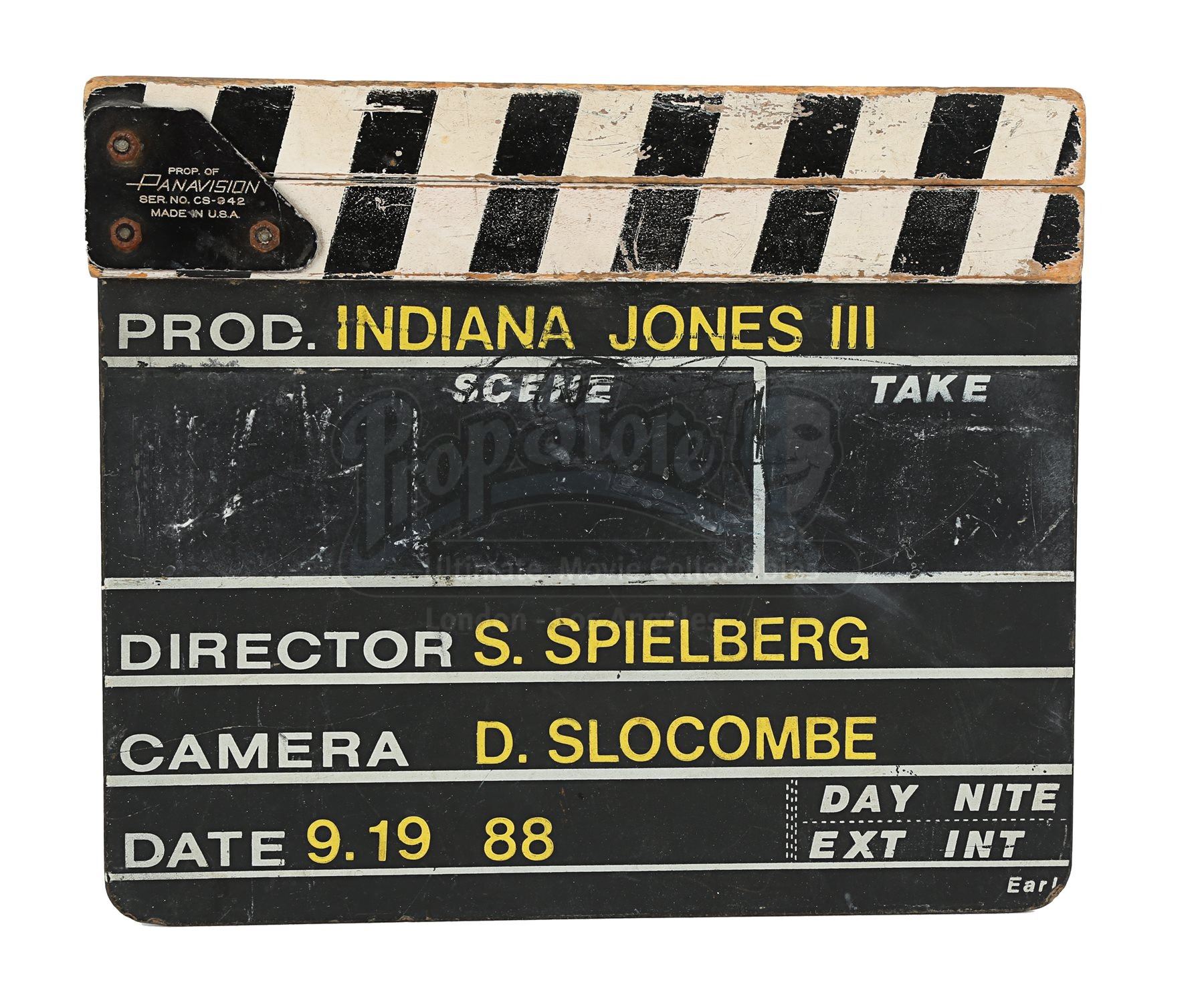 A production-used clapperboard from Steven Spielberg’s action-adventure Indiana Jones and the Last Crusade. Made from wood, its hinged clapper sticks display the Panavision logo and serial number on the hinge plate. Labelled spaces are provided for production title, scene and take numbers, director, cameraperson and date. There are markers for day/night and interior/exterior shooting.