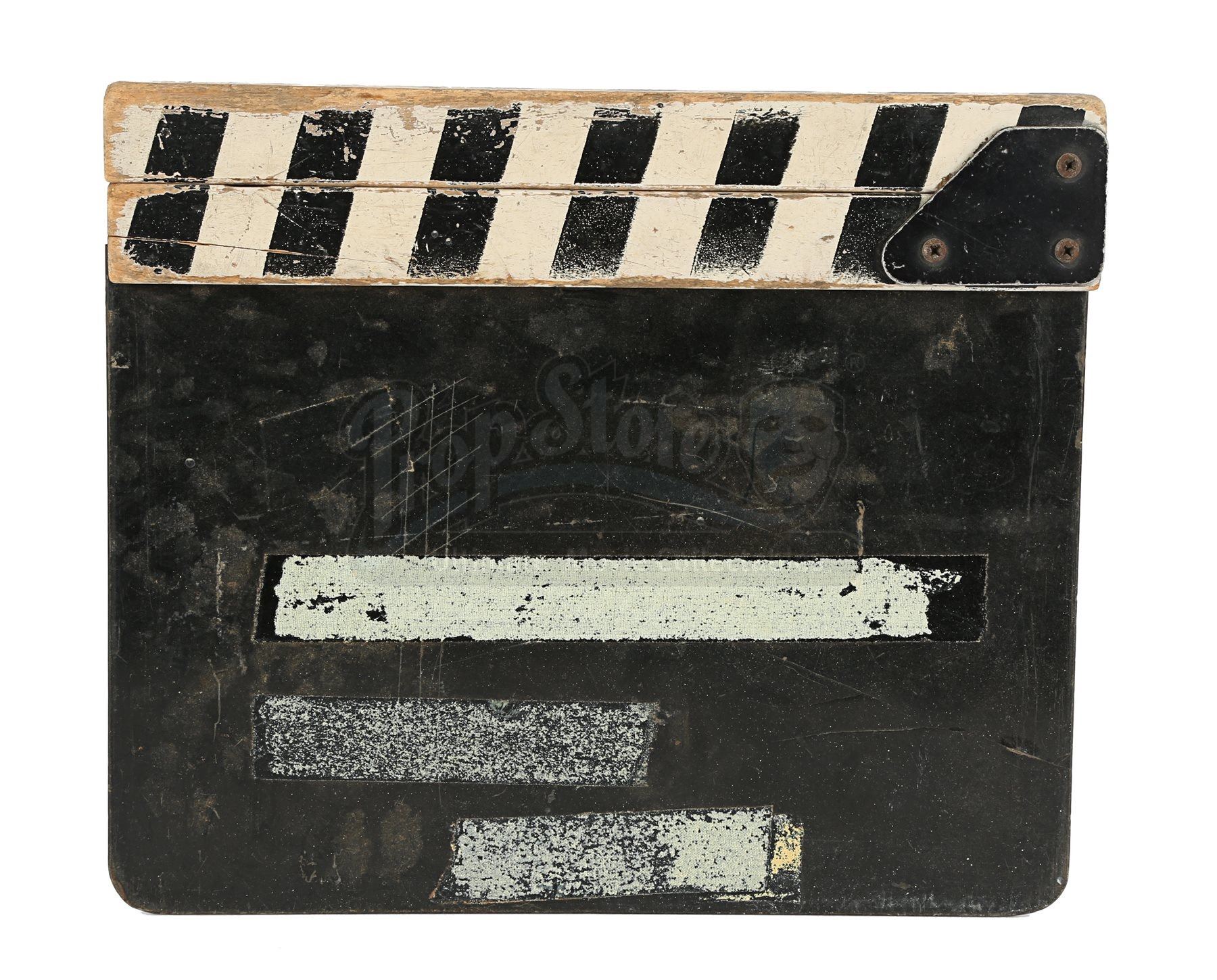 Evidence of notes in chalk can be seen in the scene and take fields. The clapperboard is heavily used from production, with scuffed edges and scratched surfaces, faded paint on the clapper sticks and three pieces of tape adhered to the rear. Dimensions: 2.5 cm x 28 cm x 24 cm (1” x 11” x 9.5”)