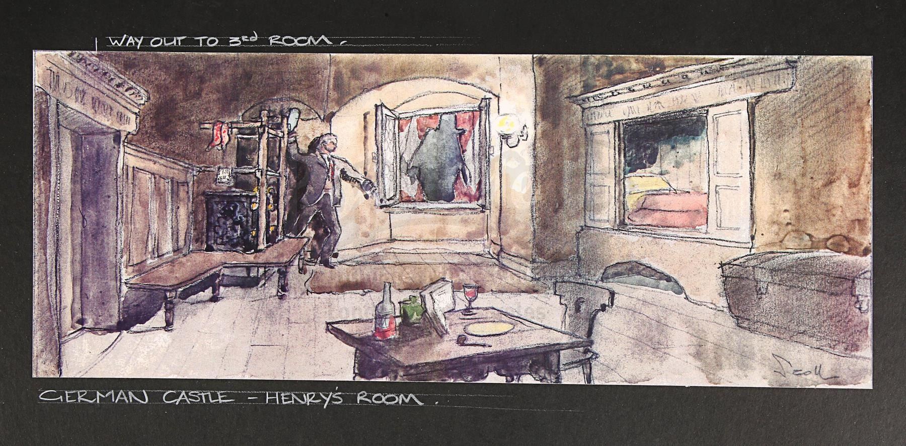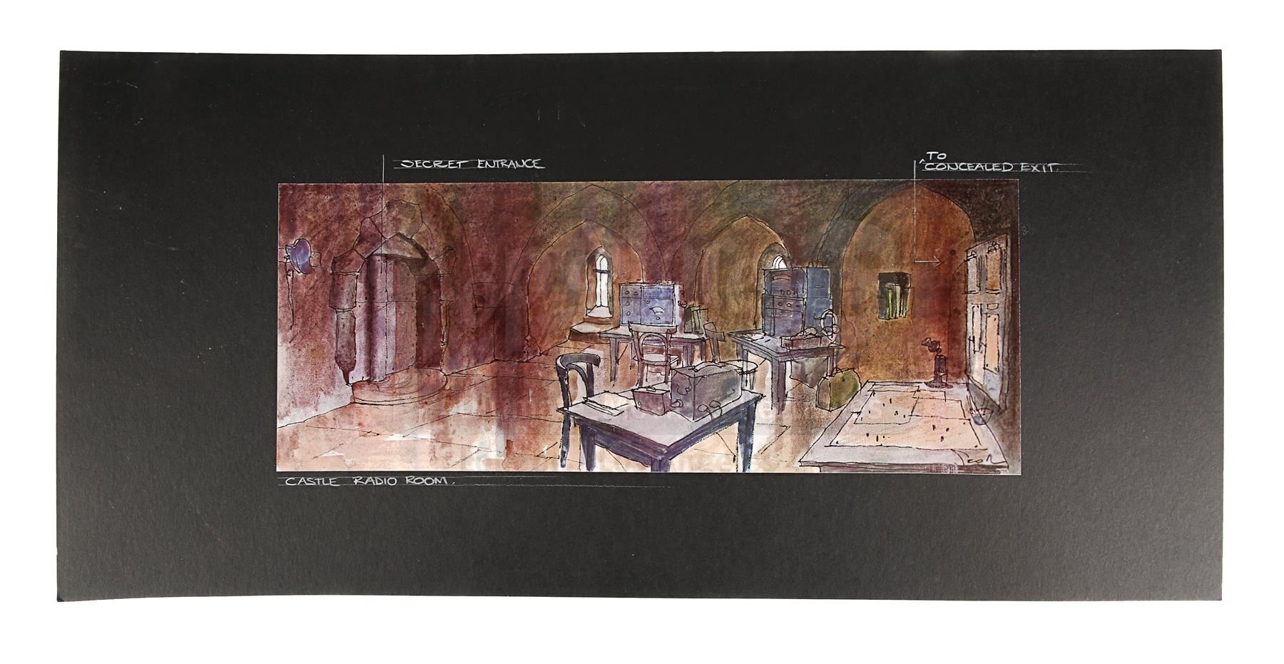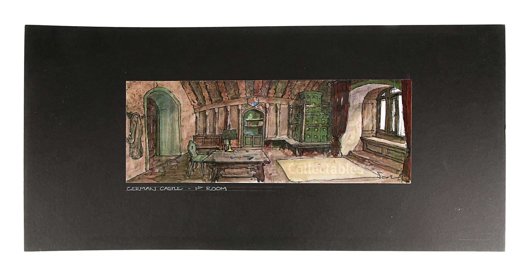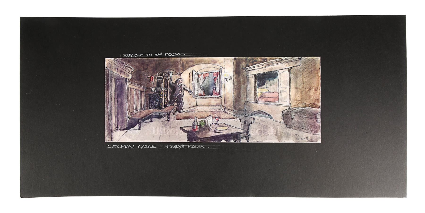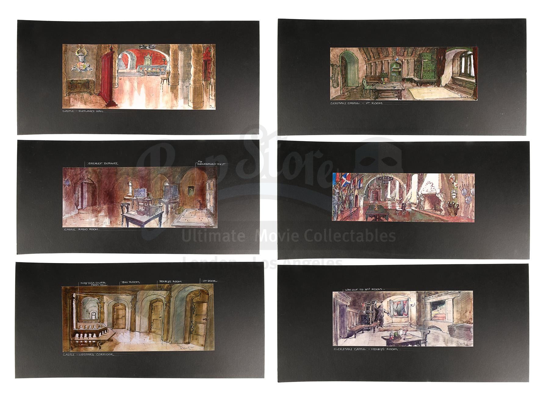 The designs depicts various rooms within Castle Brunwald, including the room where Indiana Jones' (Harrison Ford) father Professor Henry Jones (Sean Connery) was imprisoned by the Nazis. Adhered to thick black card, each design features annotations written in white pencil. The notes explain the setting and point out certain elements within the design. Signs of production use are present on the card, including light marks and minor wear, notably on the corners. Dimensions (each): 28 cm x 59.5 cm (11" x 23 1/2")