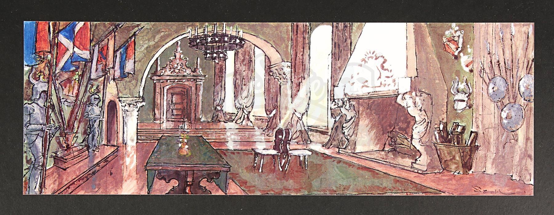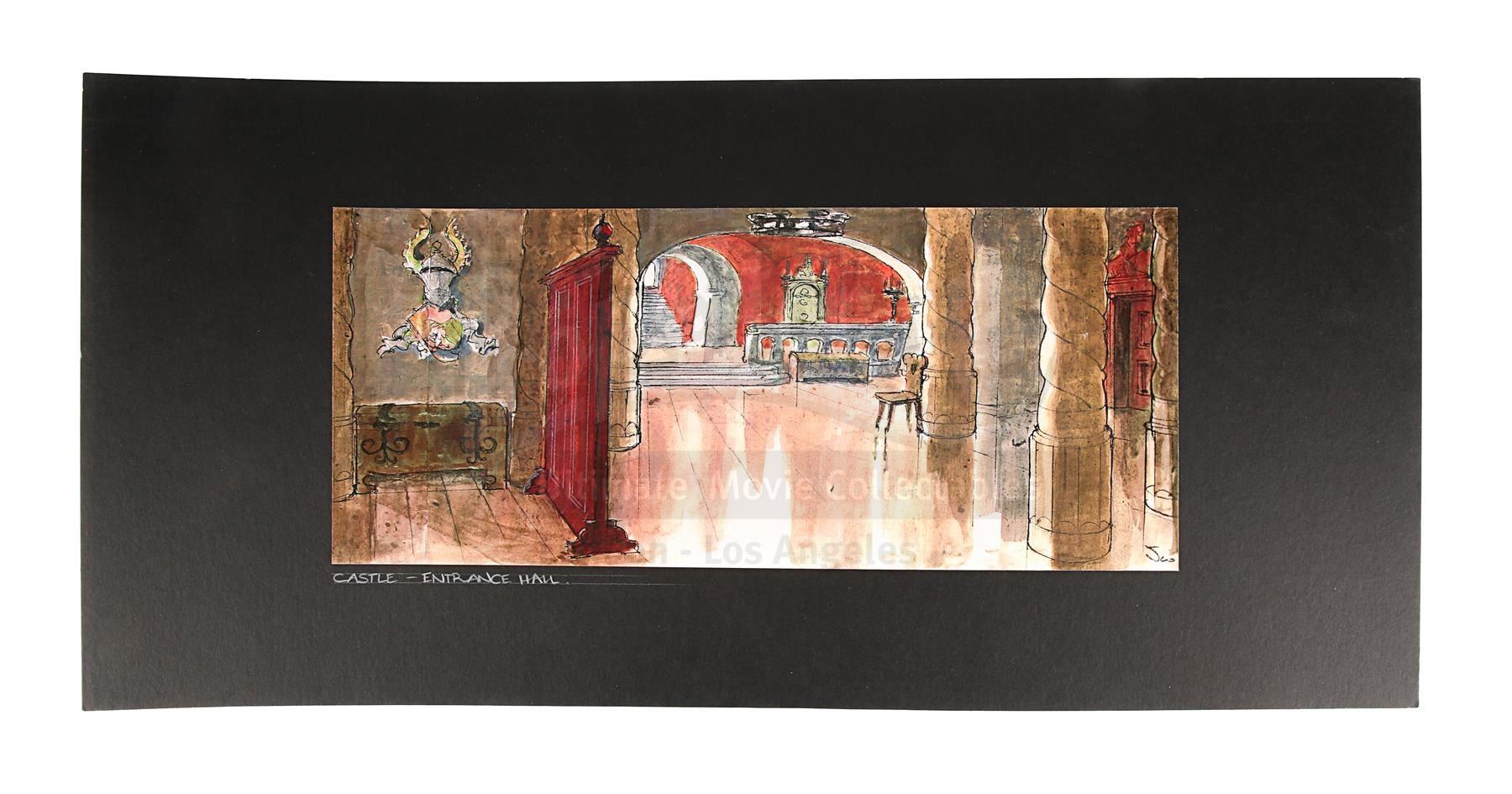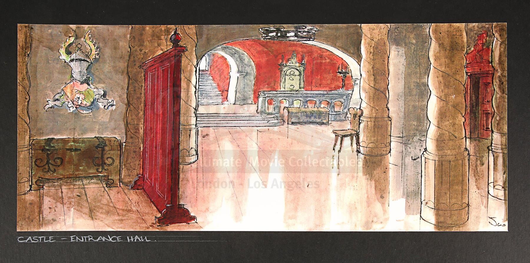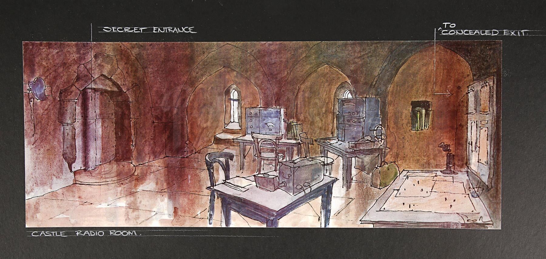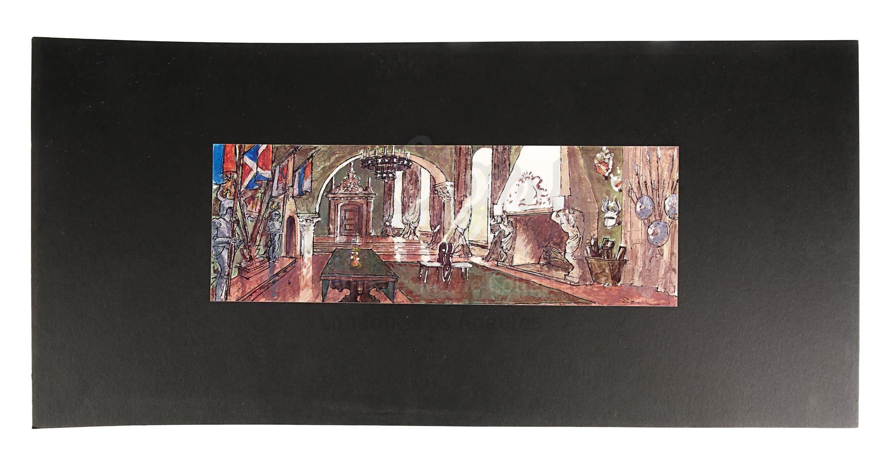 The designs depicts various rooms within Castle Brunwald, including the room where Indiana Jones' (Harrison Ford) father Professor Henry Jones (Sean Connery) was imprisoned by the Nazis. Adhered to thick black card, each design features annotations written in white pencil. The notes explain the setting and point out certain elements within the design. Signs of production use are present on the card, including light marks and minor wear, notably on the corners. Dimensions (each): 28 cm x 59.5 cm (11" x 23 1/2")