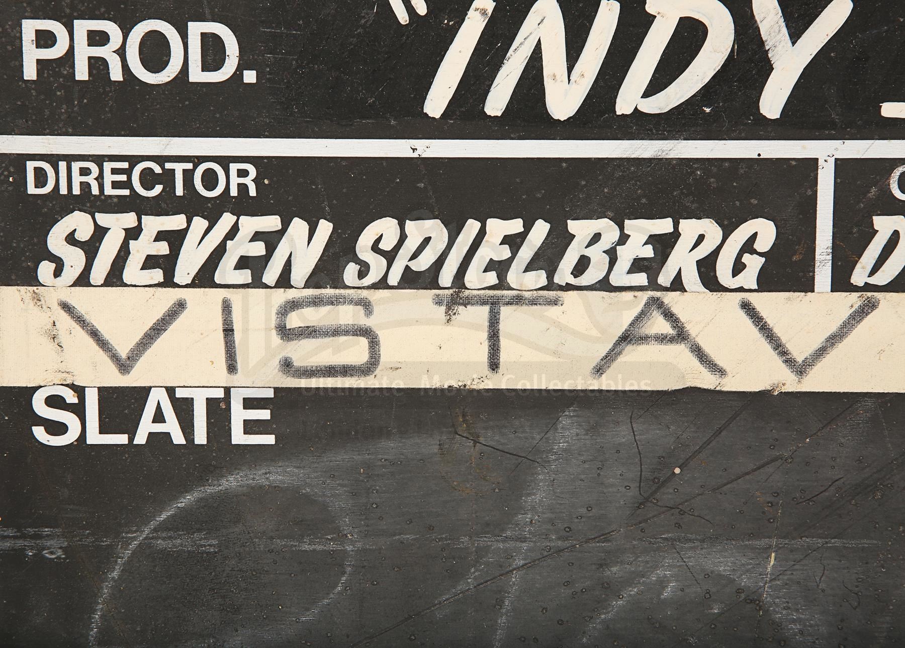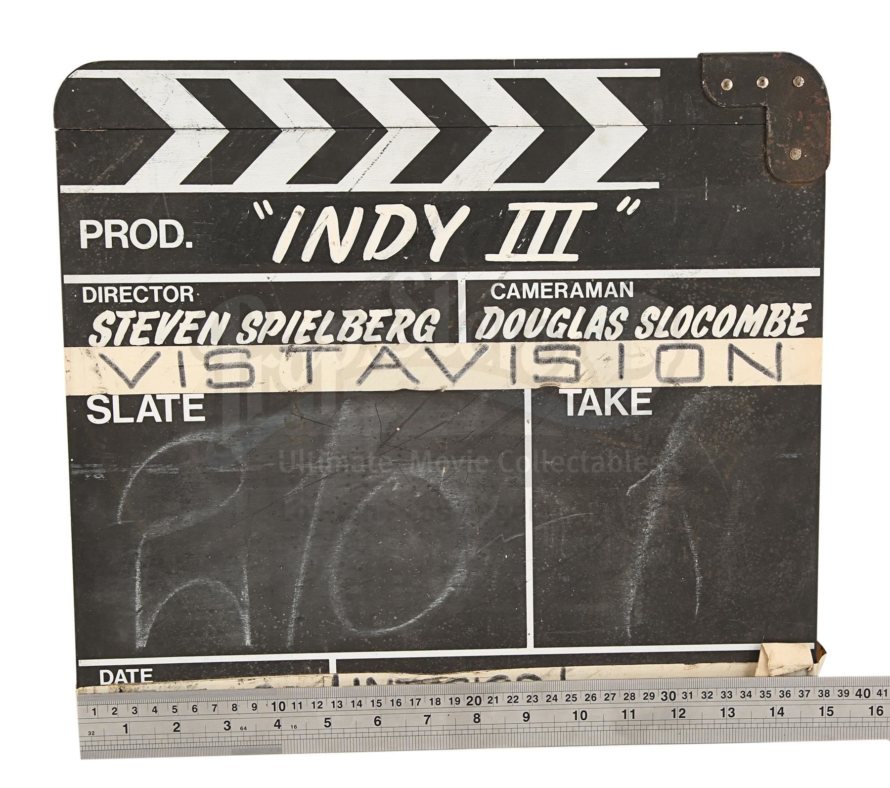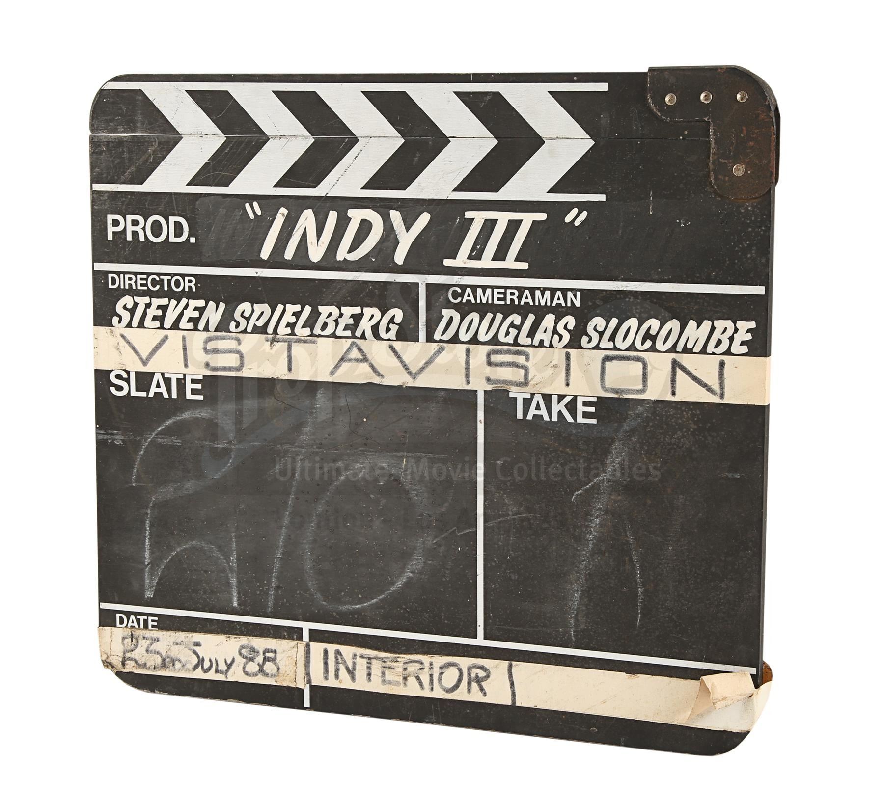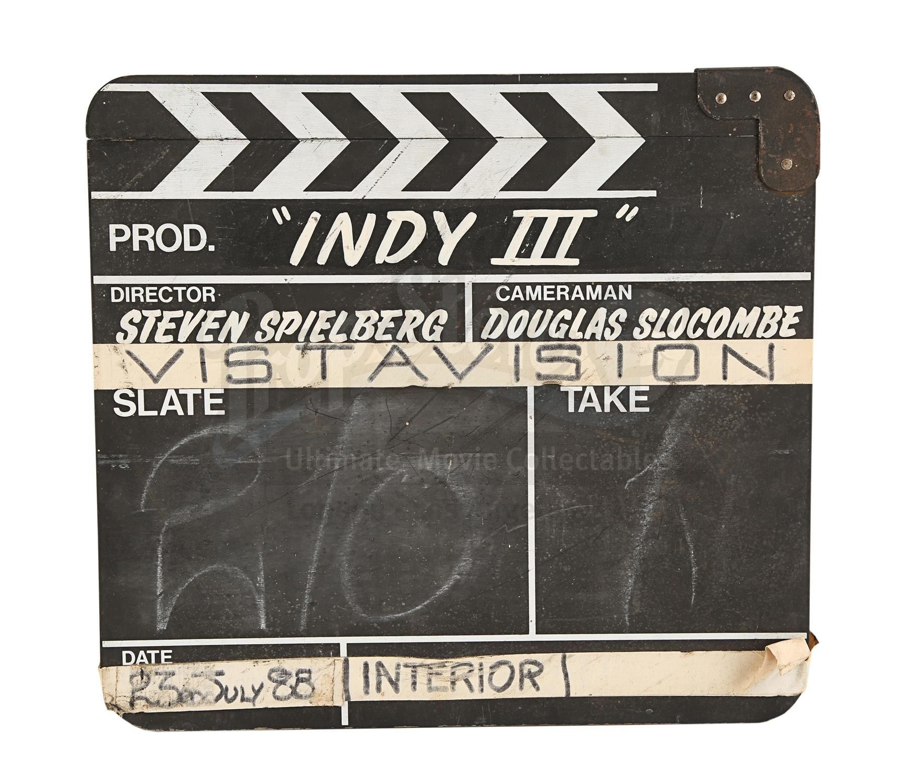 A production-used clapperboard from the production of Steven Spielberg's action-adventure sequel Indiana Jones and The Last Crusade. This item comes from the personal collection of producer Robert Watts. The wooden clapperboard displays white painted text, including the production's working title "Indy III", the name of director Steven Spielberg and the director of photography Douglas Slocombe. Multiple lines have been painted on it to create fields for slate, take and date. "Vistavision" and "23rd July 88, Interior" have been handwritten in black on two strips of adhesive canvas tape. The back of the board features additional strips of tape, creating five filled-in sections titled lens, distance, stop, height and angle.