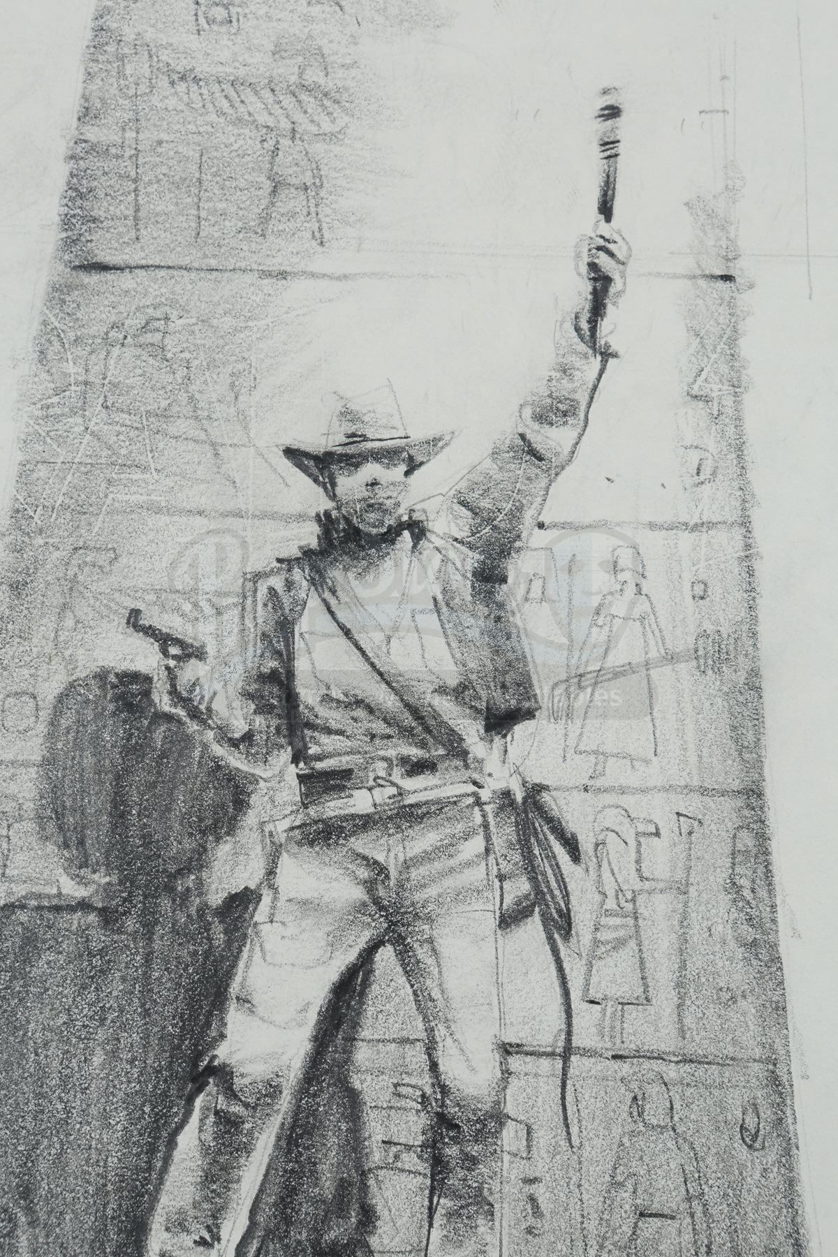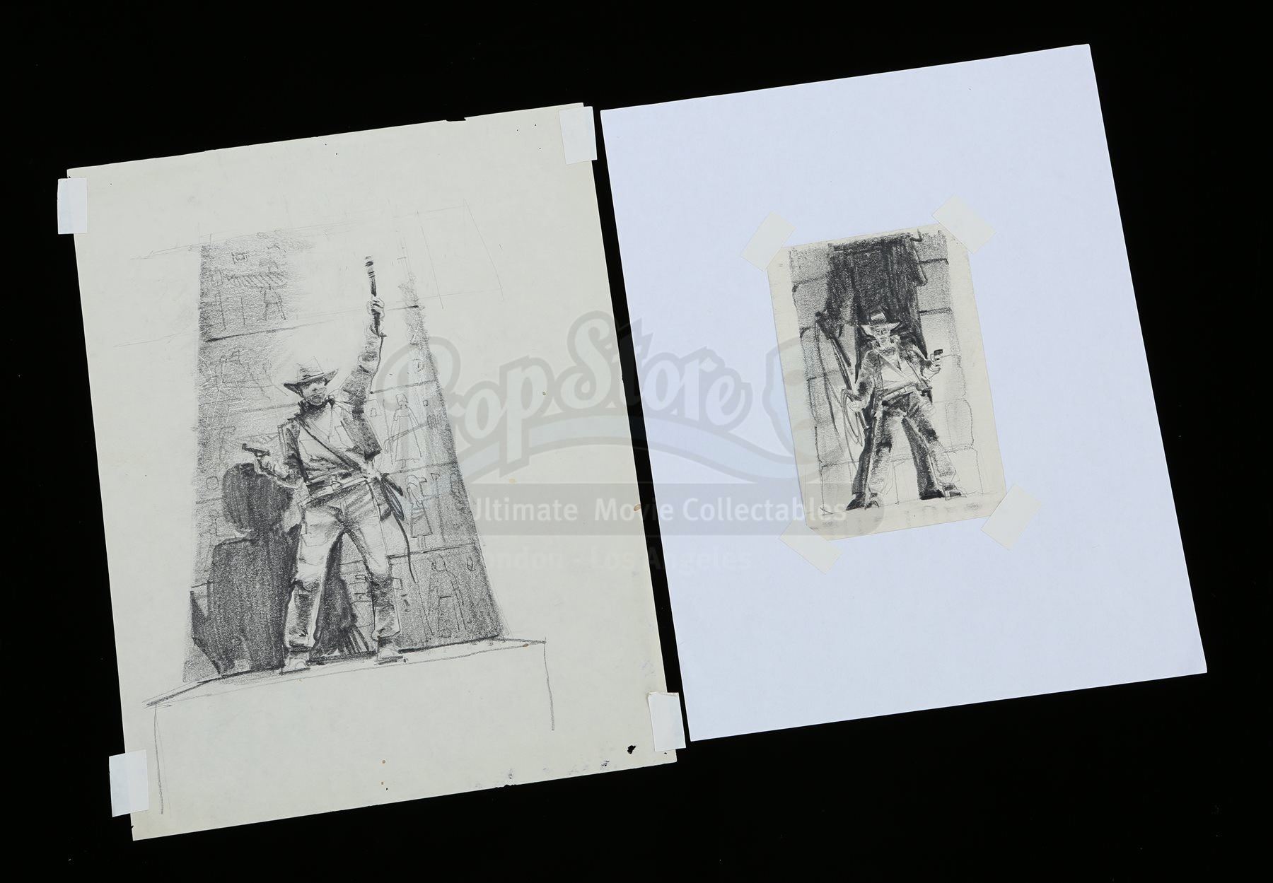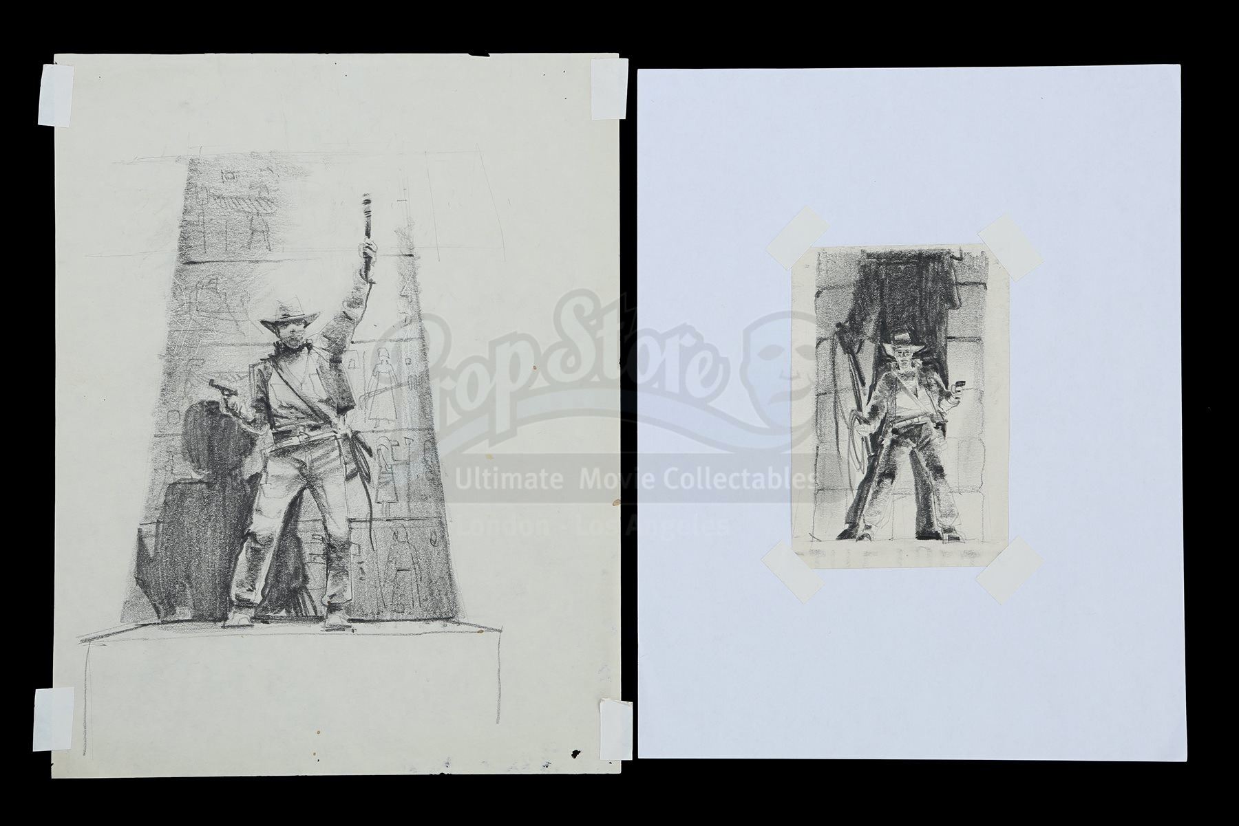 The first sketch is drawn in graphite on sketch paper. It depicts Indiana Jones (Harrison Ford) with a torch held high above his head in front of a wall of hieroglyphs. The second piece is also rendered in graphite on sketch paper, but is cut to a smaller size and attached to another piece of paper. It shows Indiana Jones in front of a wall with his whip in his hand. Both pieces show signs of use, such as pinholes and attached pieces of tape, but the set remains in fine condition. Dimensions (largest): 29 cm x 23 cm (11” x 9”)