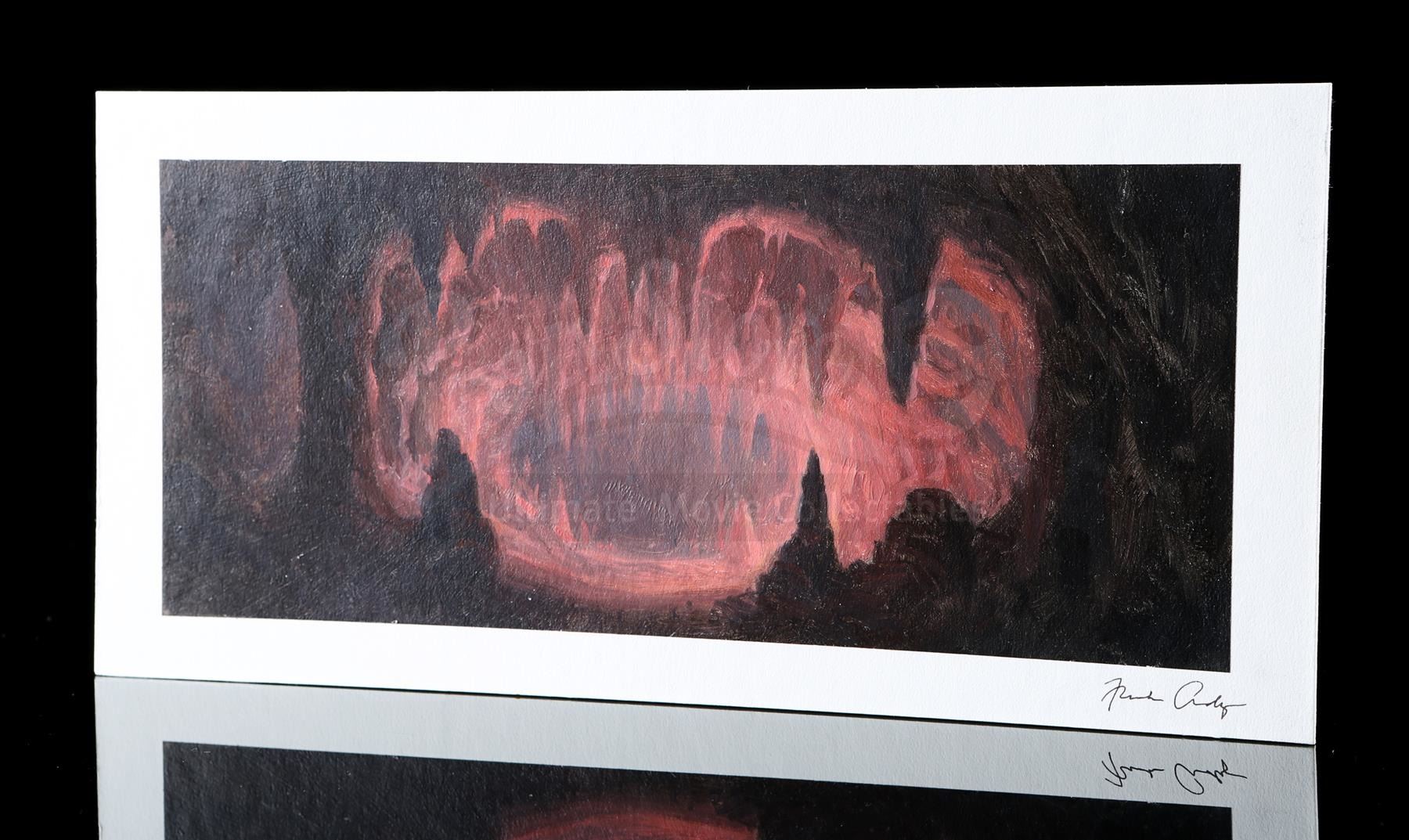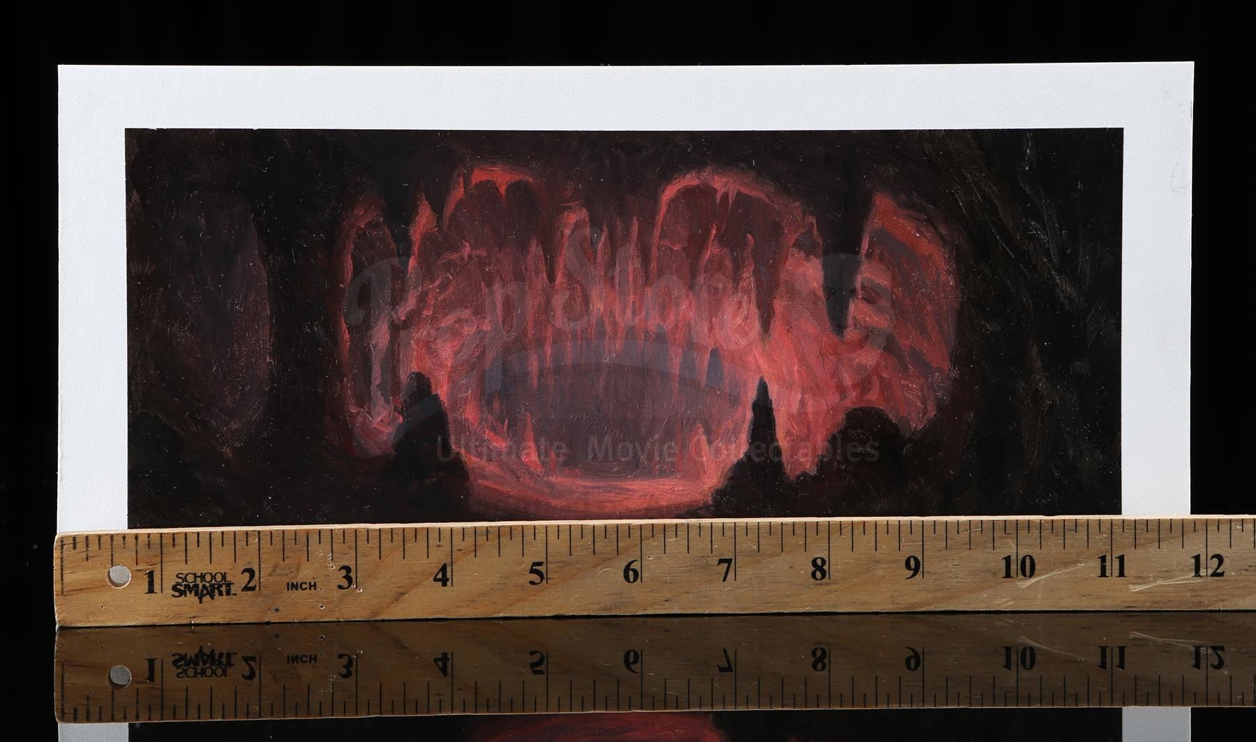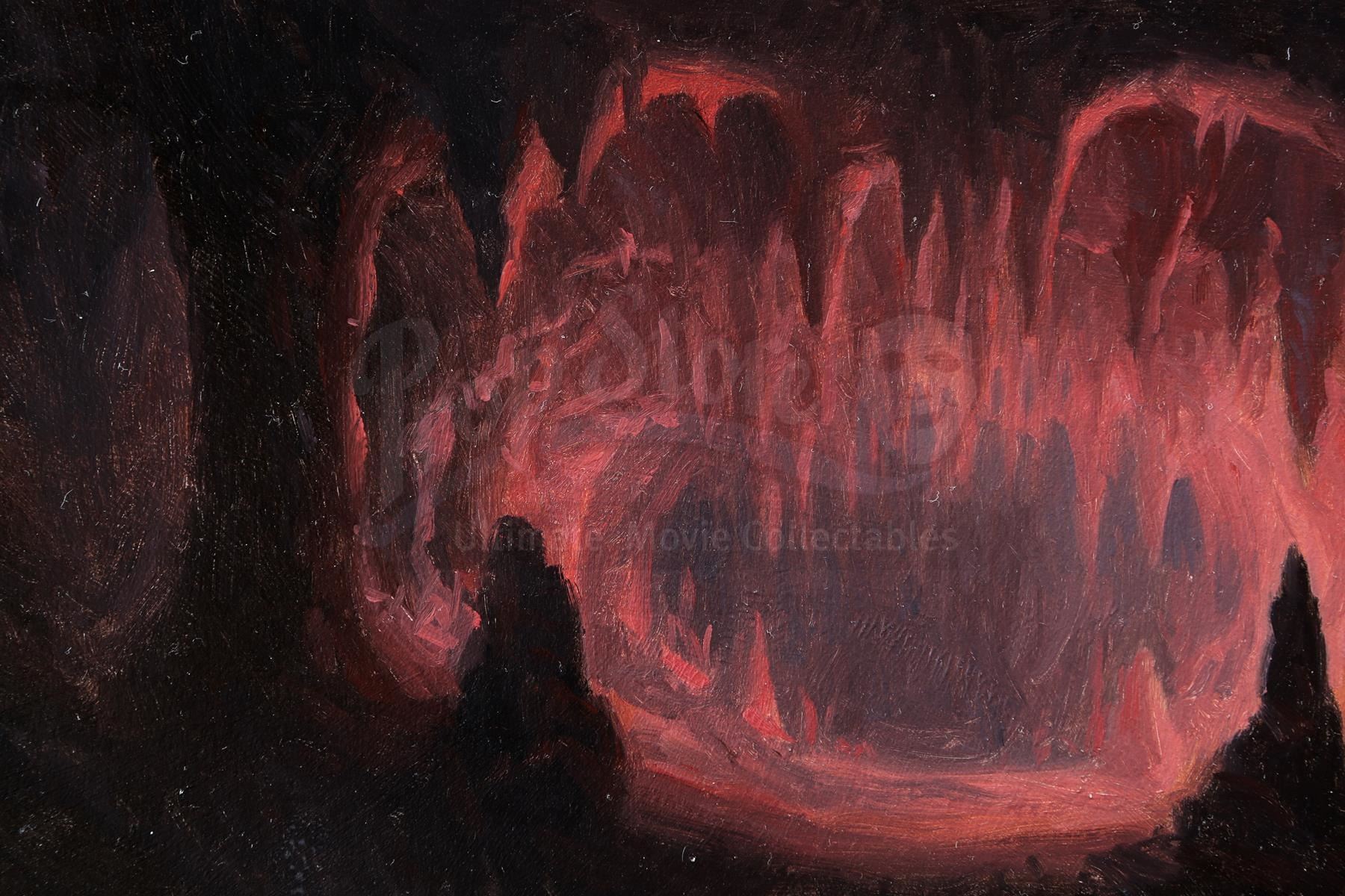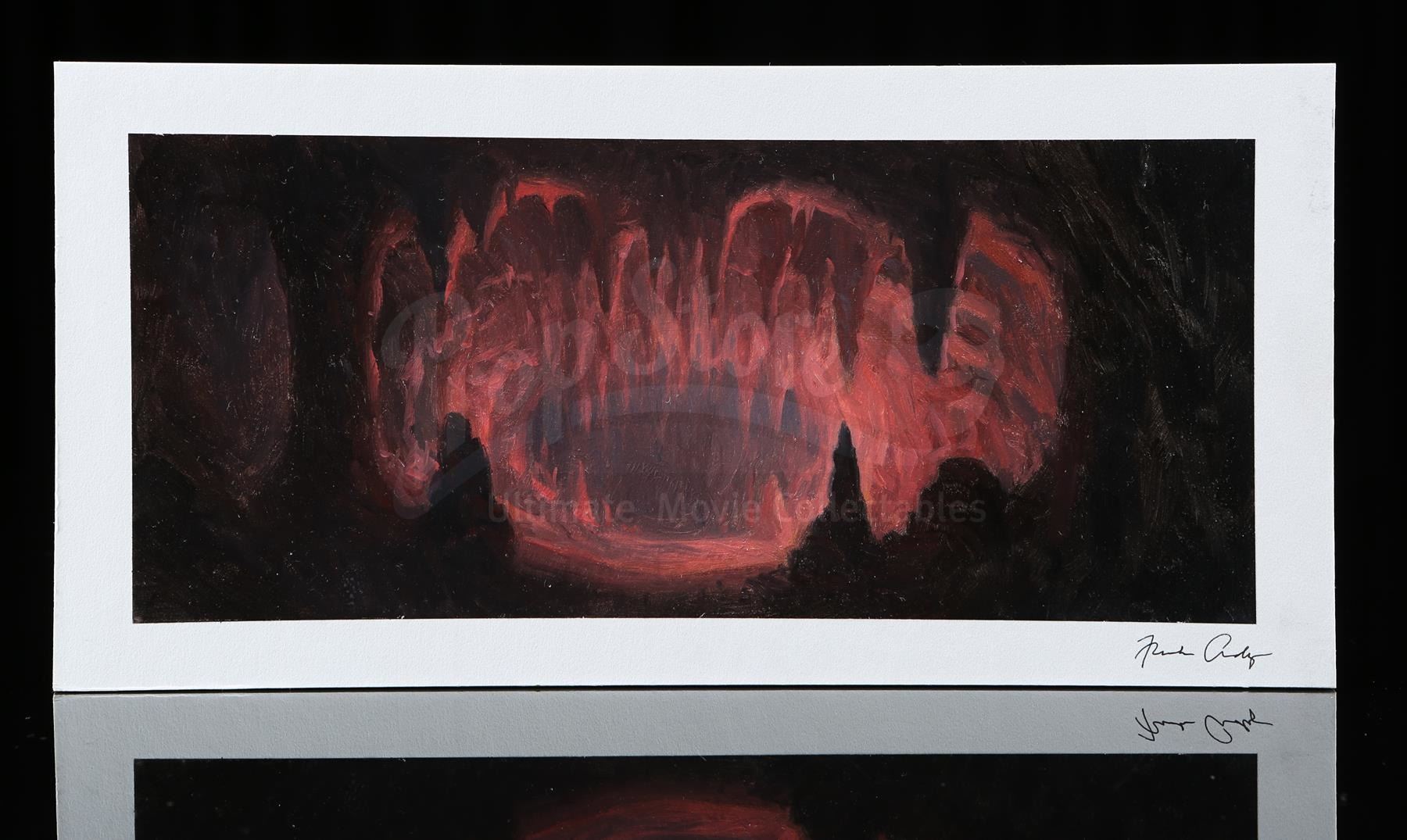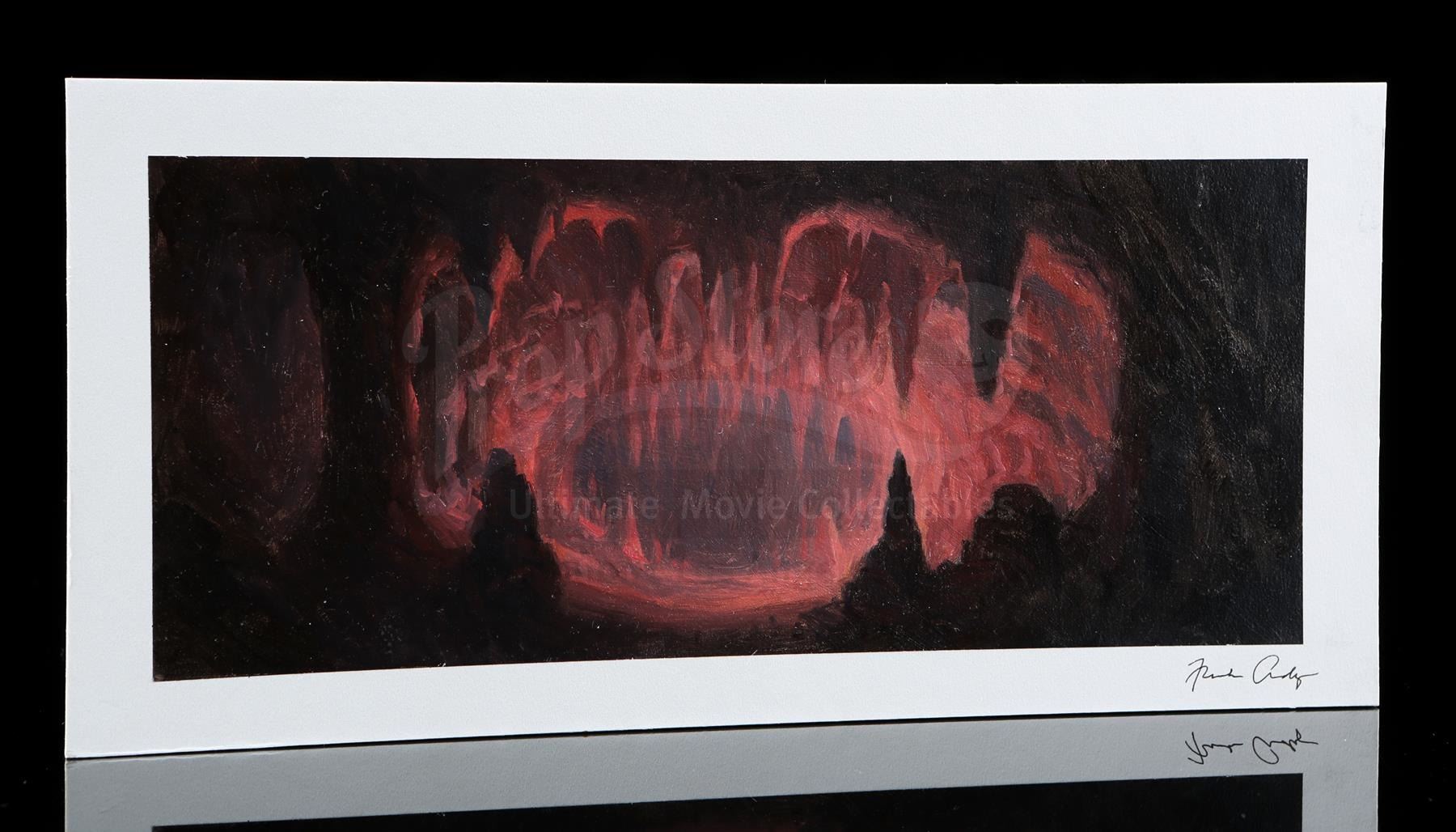 A hand-painted Frank Ordaz cave matte study from Steven Spielberg's action-adventure sequel Indiana Jones and the Temple of Doom. Explorer and archaeologist Indiana Jones (Harrison Ford) discovered Mola Ram's (Amrish Puri) cave in the catacombs beneath Pankot Palace while seeking to retrieve the fabled Sankara stones.