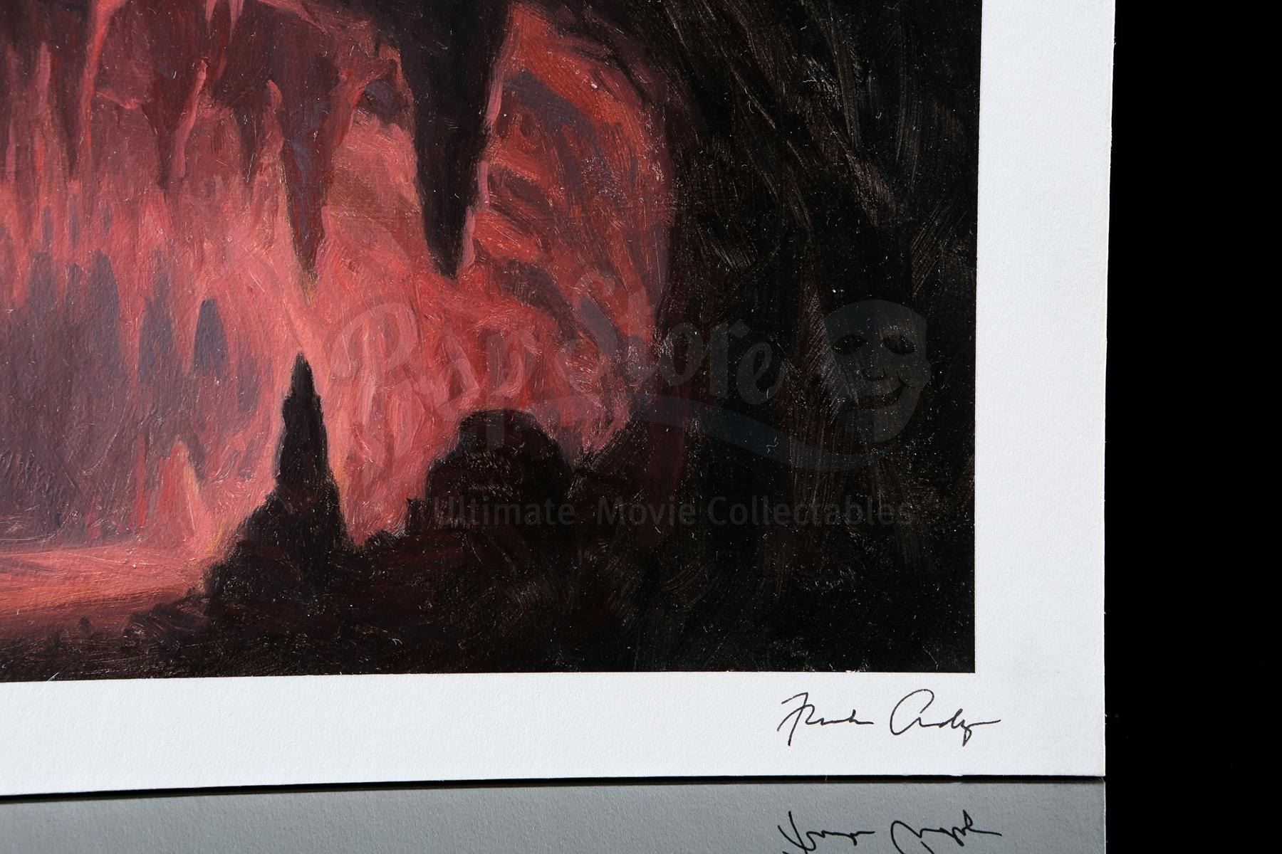 This matte study depicts a concept study of the cave, and was painted as a concept for a full-size matte painting by ILM matte artist Frank Ordaz. It is rendered in mixed media on illustration paper adhered to a white backing board bearing Ordaz's signature. The study exhibits minor scuffs, and peeled-tape stains to the board on its reverse. Dimensions: 15.25 cm x 30.5 cm (6" x 12")
