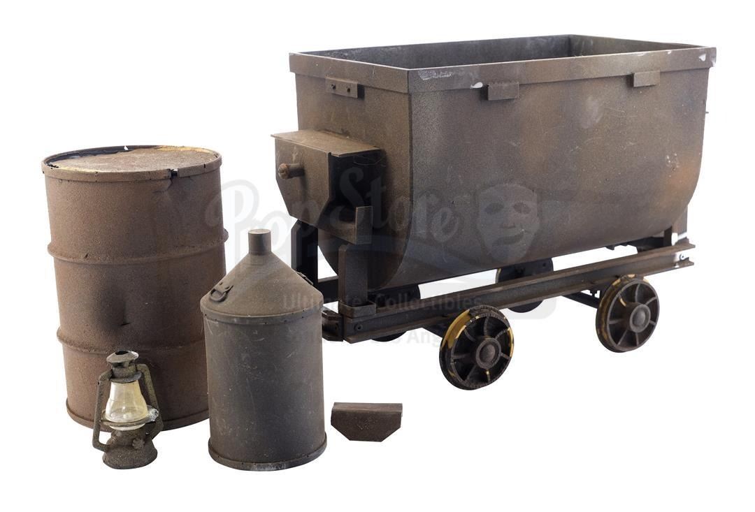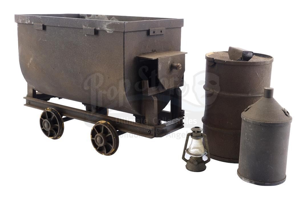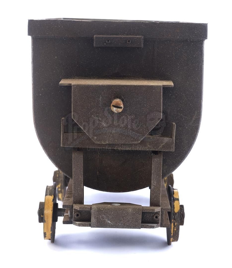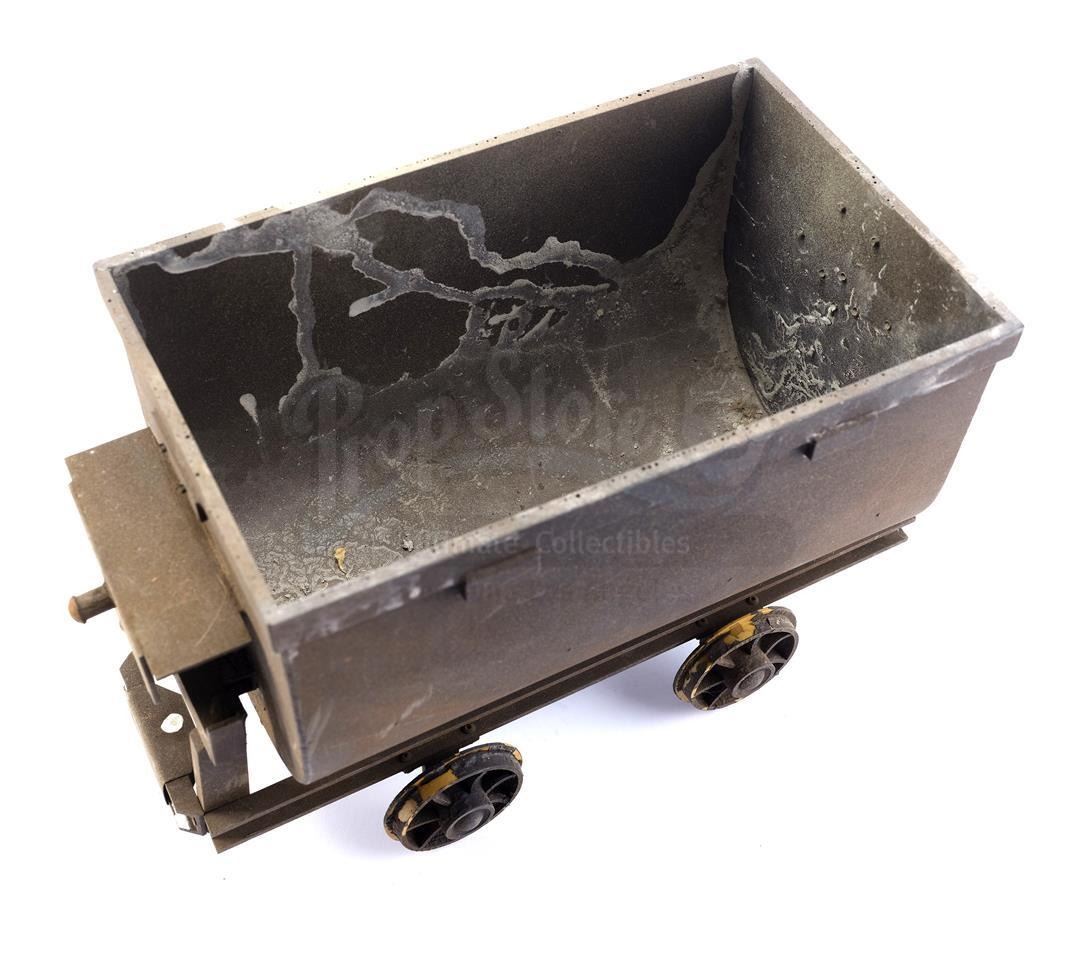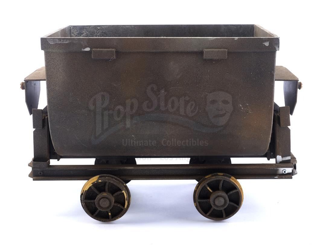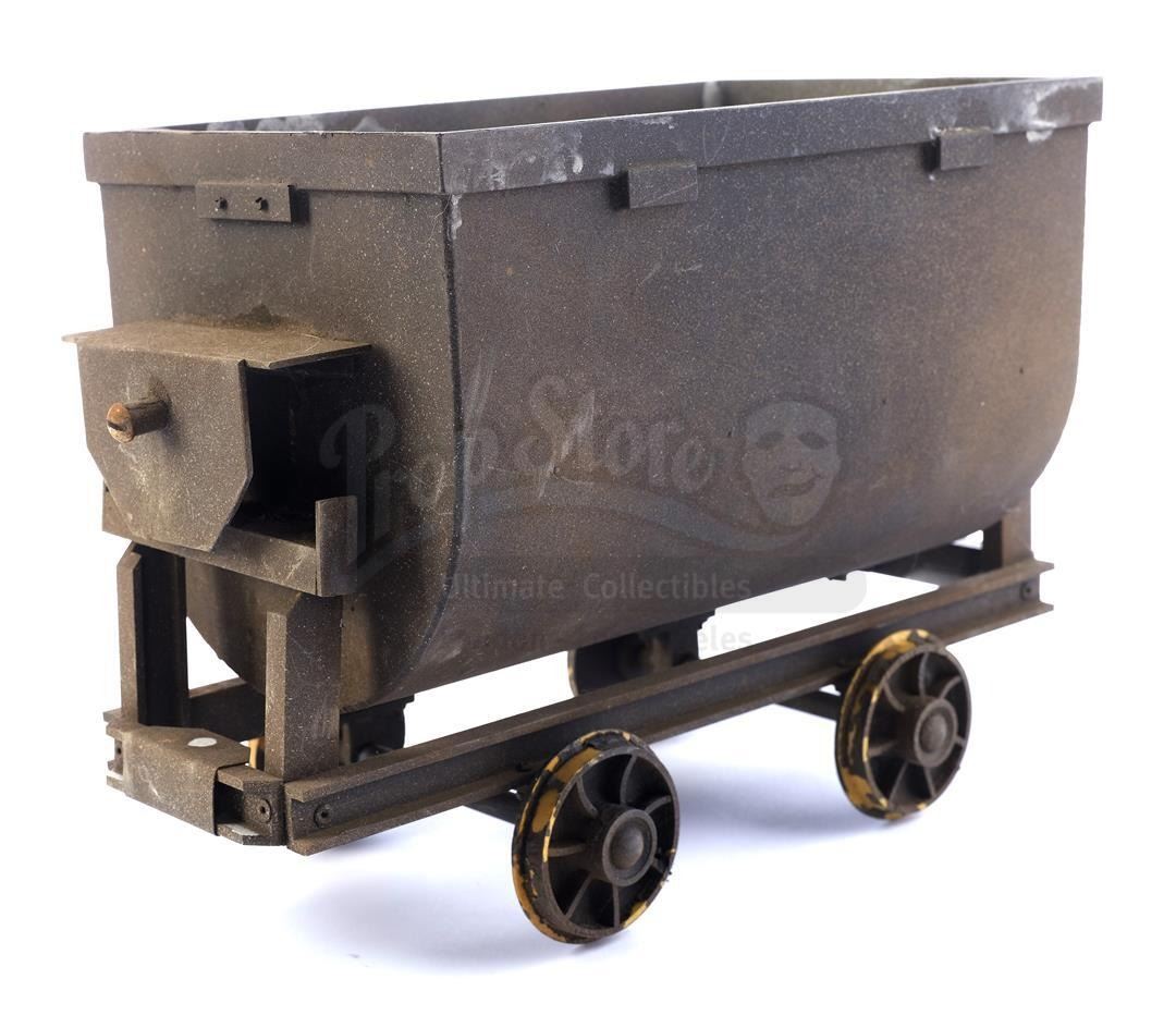 A mine cart model miniature from Steven Spielberg's action-adventure sequel Indiana Jones and the Temple of Doom. Mola Ram's (Amrish Puri) Thuggee cult chased Indy (Harrison Ford), Short Round (Ke Huy Quan), and Willie Scott (Kate Capshaw) through an underground mine on rickety carts. The sequence was achieved with a combination of stop-motion animation, model miniatures, and live-action shooting.