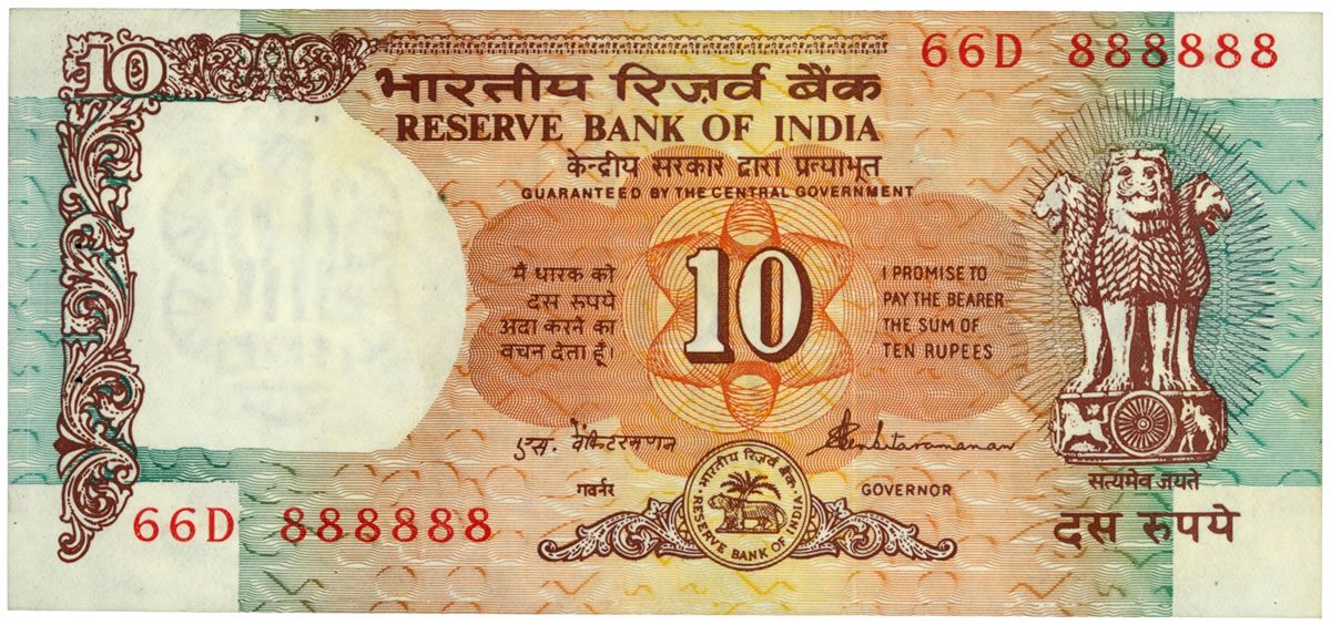 10 Rupees 1992. P.88a Jhun6.4.11.1A. Solid 8's . Serial no. 66D 888888. PMG graded Choice Unc-64. Note: Staple holes at issue.
