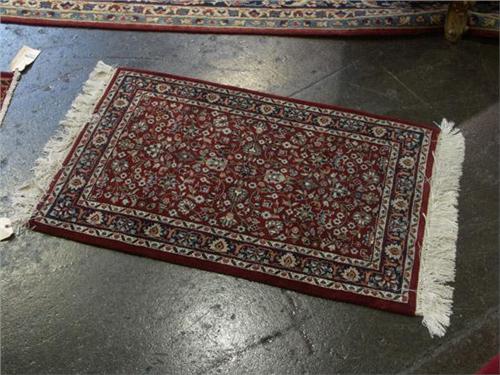 CARPET: Indo carpet of hand knotted wool woven on a cotton warp measuring approximately 3.0 x 2.0, red field and navy border.