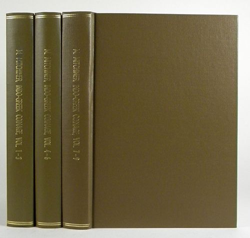 Mitchiner, Michael. INDO-GREEK AND INDO-SCYTHIAN COINAGE. VOLUMES 1-9. London: Hawkins Publications, 1975-76. Nine volumes, complete, bound in three volumes. 4to, later matching brown cloth, gilt. 1131 pages; maps, tables and numerous coin illustrations throughout. Fine. A standard reference and the most extensive work ever published on the topic, listing over 10,000 coins. Bound sets are a welcome change, since the large-format card covered volumes seem to invite bumping and wear. Clain-Stefanelli 3124*. Daehn 6403.