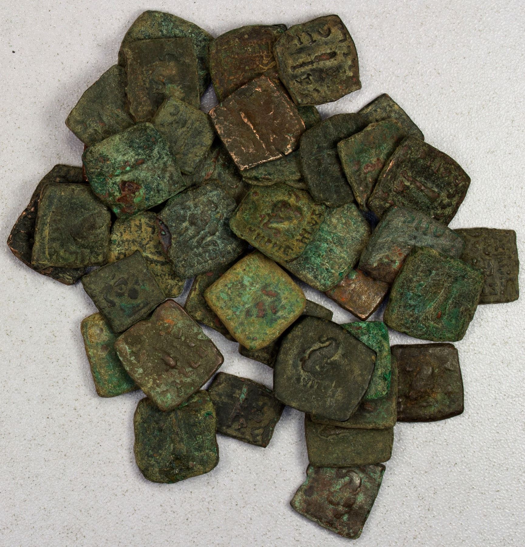 INDO-GREEK: Menander I, ca. 155-130 BC, LOT of 45 square AE chalkoi, all Bop-28 head of elephant // club of Herakles, various monograms; VG-F to F-VF conditions, nearly all with clearly identifiable designs, many with light porosity or smoothing; retail value $600, lot of 45 pieces.