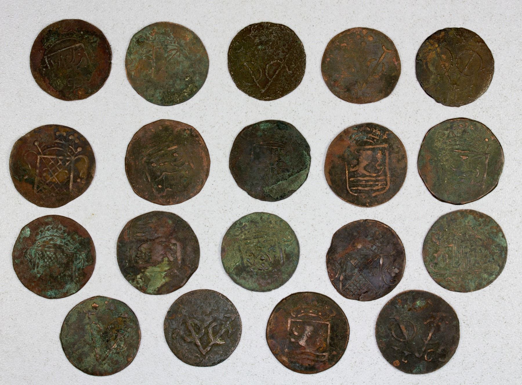BANJARMASIN: LOT of 19 AE duits, imitating various VOC duit types, a couple with the name Banjarmasin in Jawi inscribed in the shield instead of the original Dutch design, a few with legible dates (barbarous and often non-sensical); most in Fine to VF conditions with light to moderate porosity or discoloration; retail value $750, lot of 19 pieces, ex Jürgen M. Wilmes Collection.