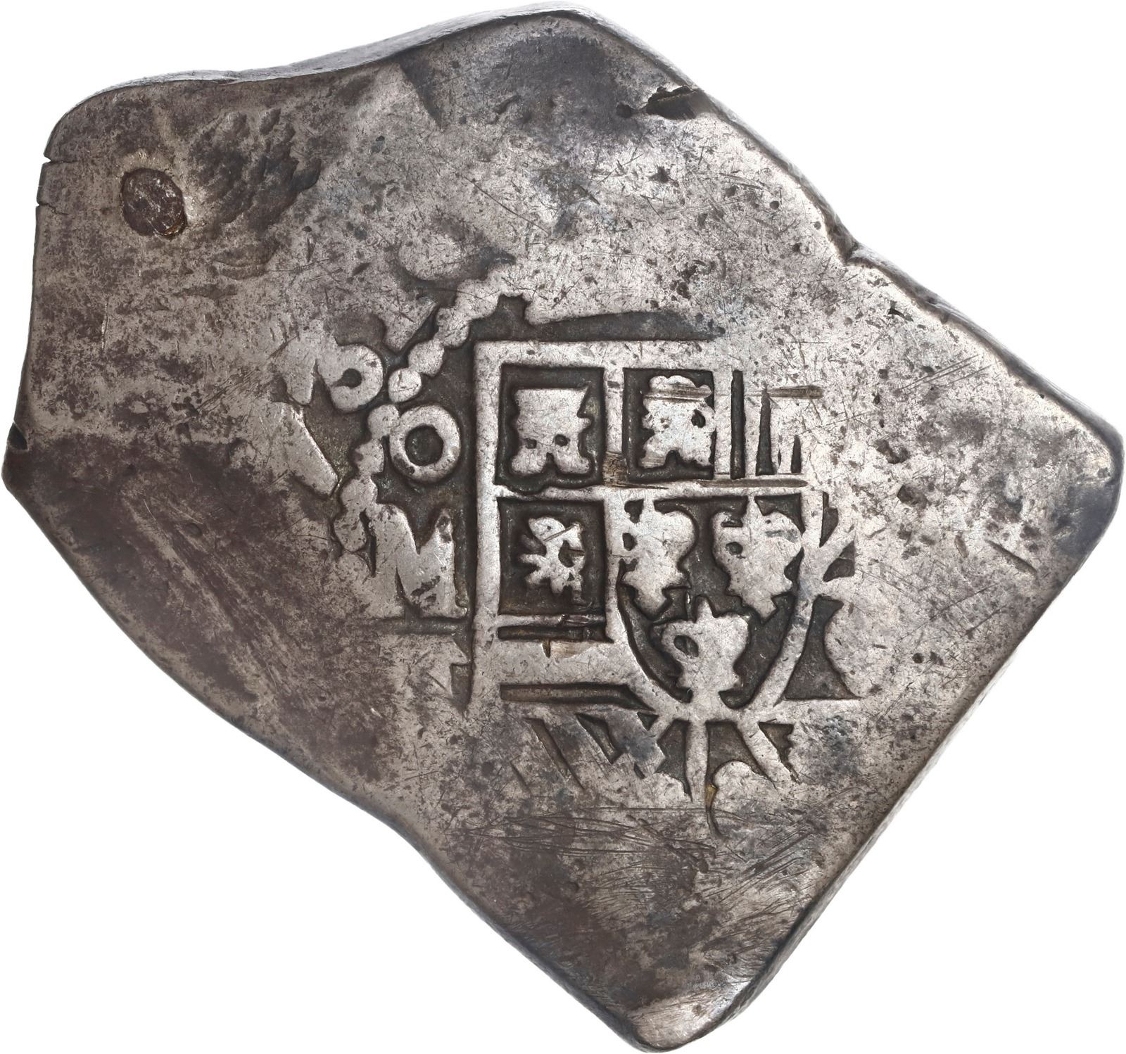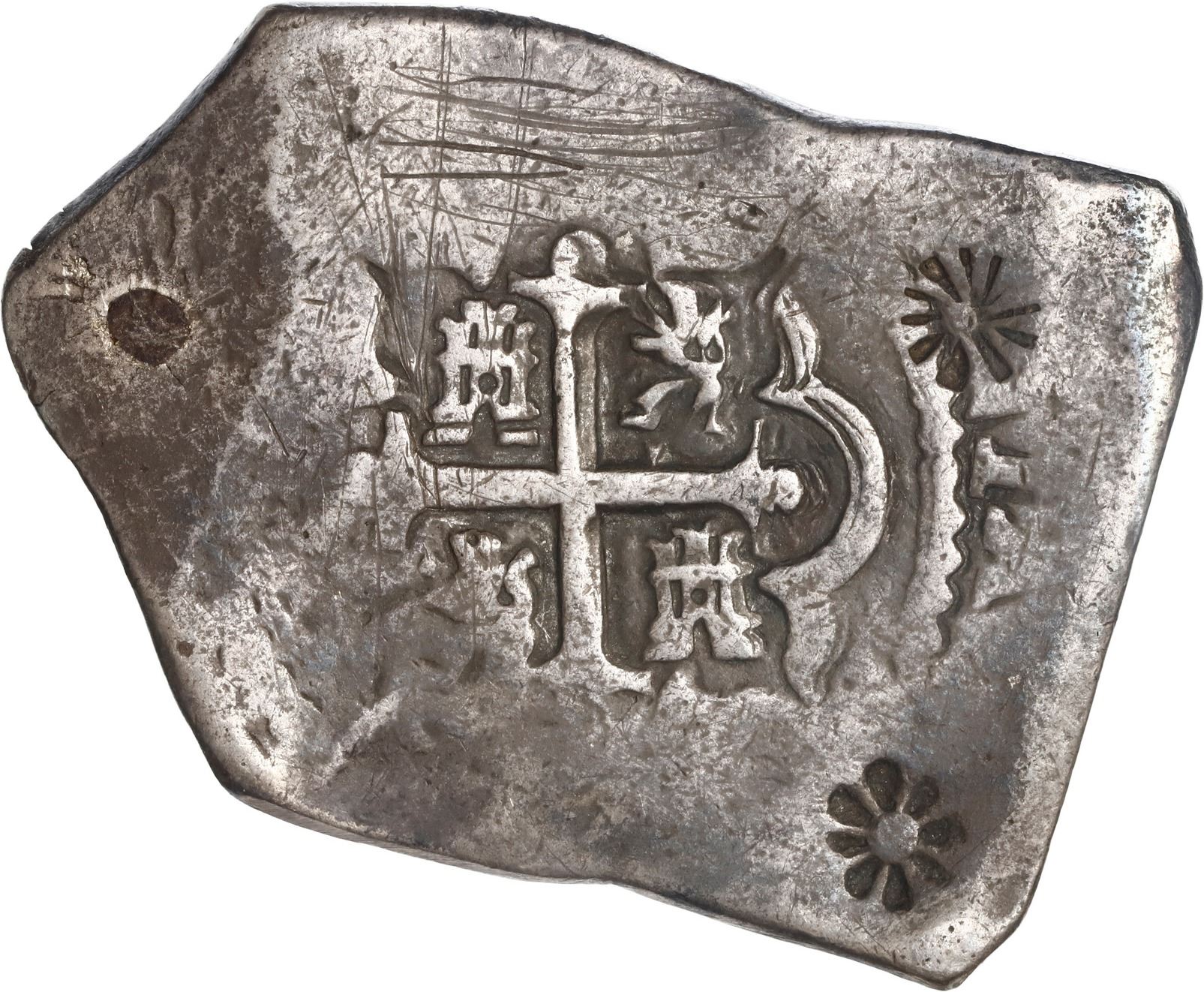 INDONESIA, Madura Island (Sumenep), 1 real batu, two different flower countermarks (ca. 1814) on a Mexico City, Mexico, cob 8 reales, 1731 F, ex-Hubbard, ex-Ponterio. KM-197. 26.42 grams. Broad-flan host (toned VF) with flat peripheries and plugged hole at one end but good full cross-lions-castles and clear date outside of full oMF to left of off-center shield, some old scratches, both of the countermarks on the cross side. Pedigreed to the Clyde Hubbard Collection, with his tag, and to the Ponterio auction of May 1988 (lot 221).