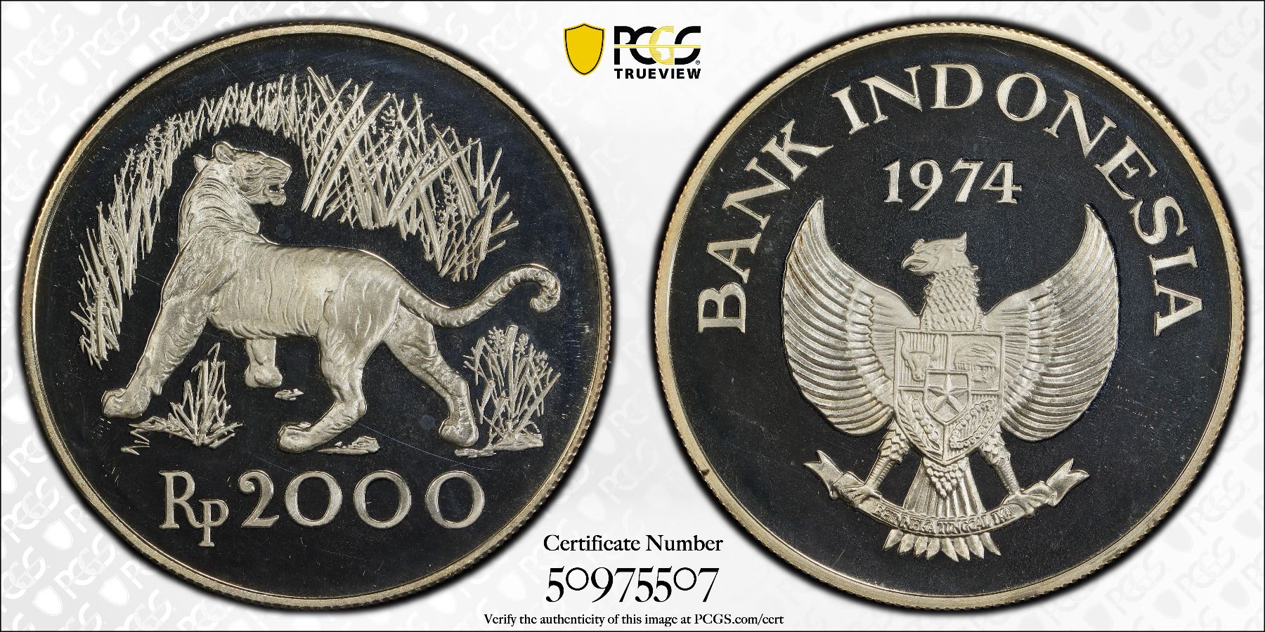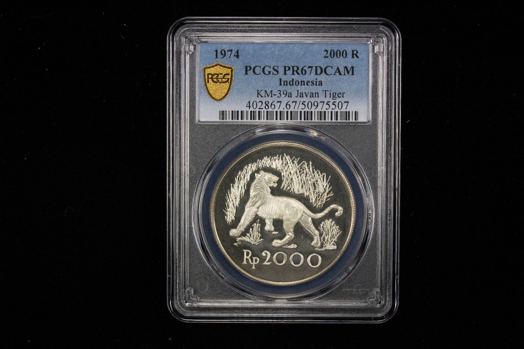 INDONESIA: Republic, AR 2000 rupiah, 1974, KM-39a, Conservation Series - Javan Tiger, PCGS graded Proof 67 DCAM, ex Almer H. Orr III Collection.