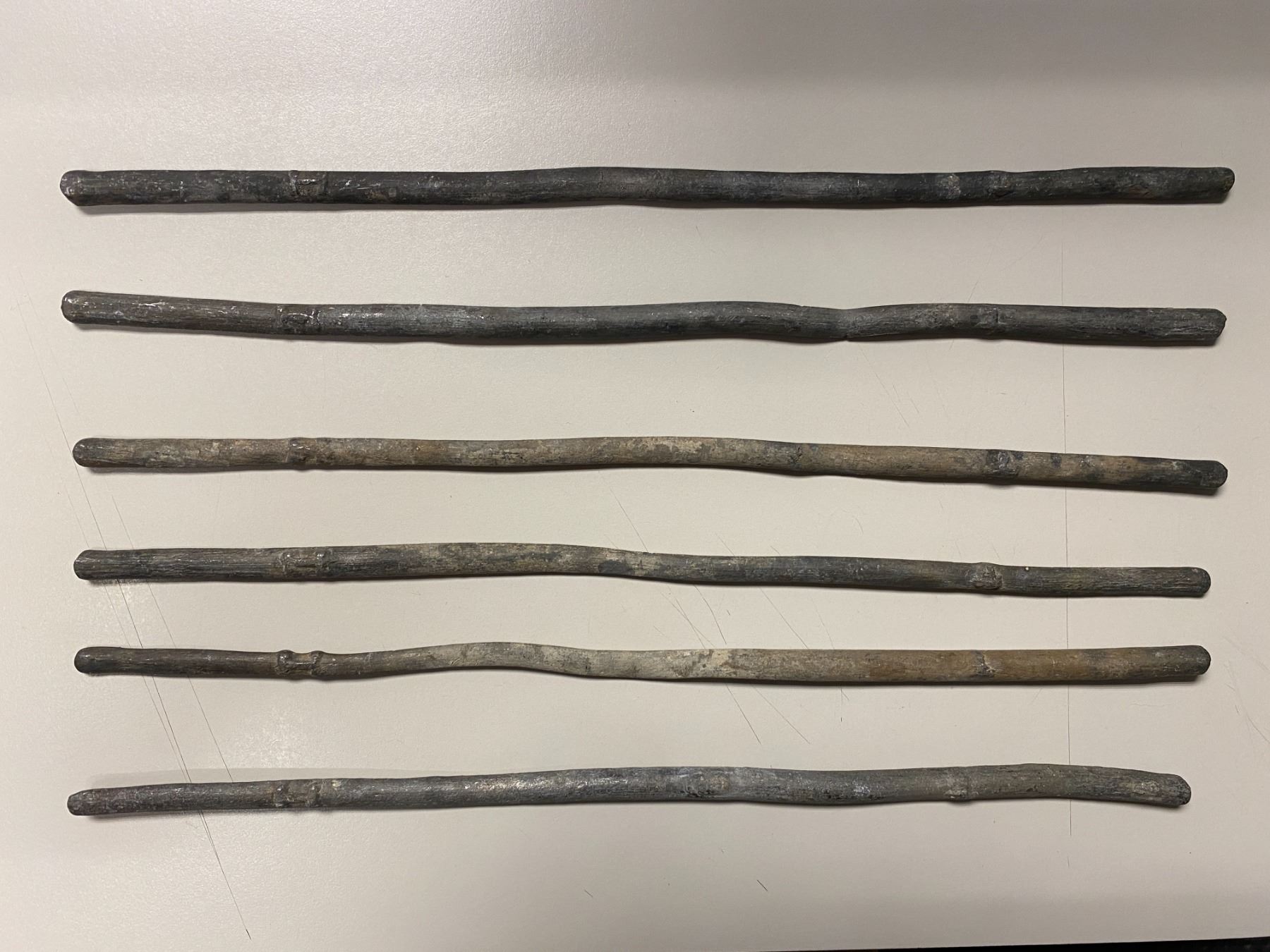 SUMATRA: LOT of 6 tin ingots, cf. Zeno-345197, all rod-shaped (ca. 35 x 1cm), convex on one side and flat on the other, with two raised symbols on the convex side, total weight 680g; retail value $300, lot of 6 pieces.