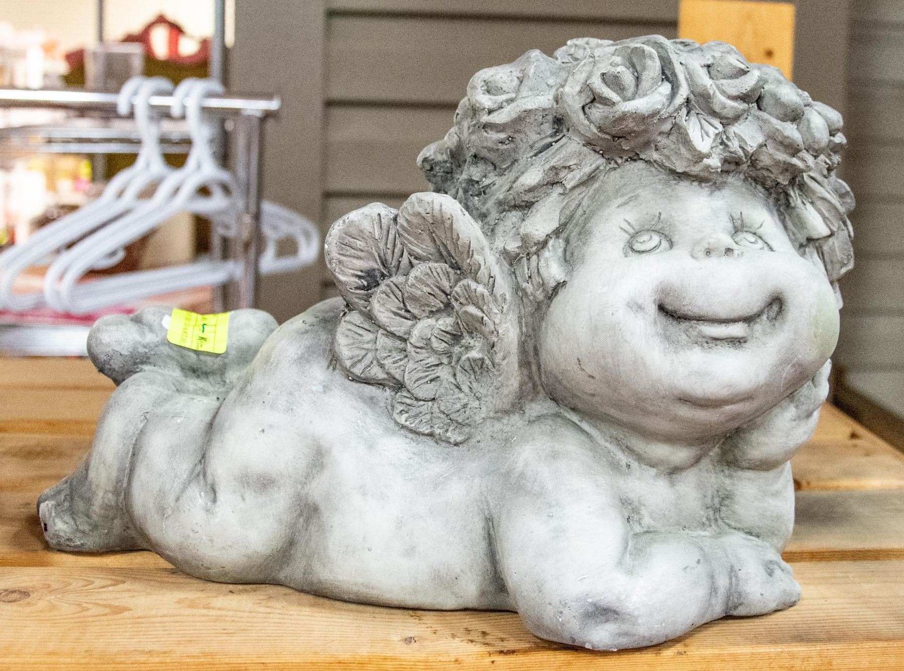 LAYING DOWN - HAPPY FACE BABY WITH WINGS, CONCRETE PLASTER FIGURE (12.5"L X 8"W X 8"H)