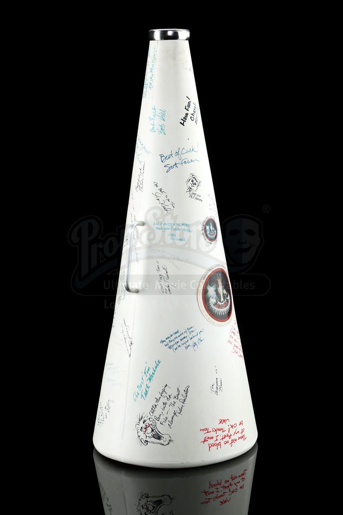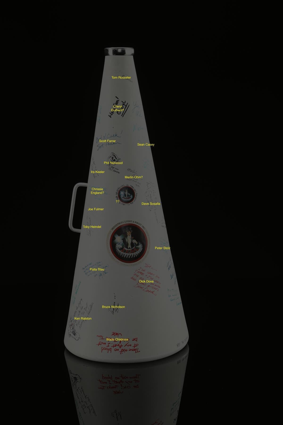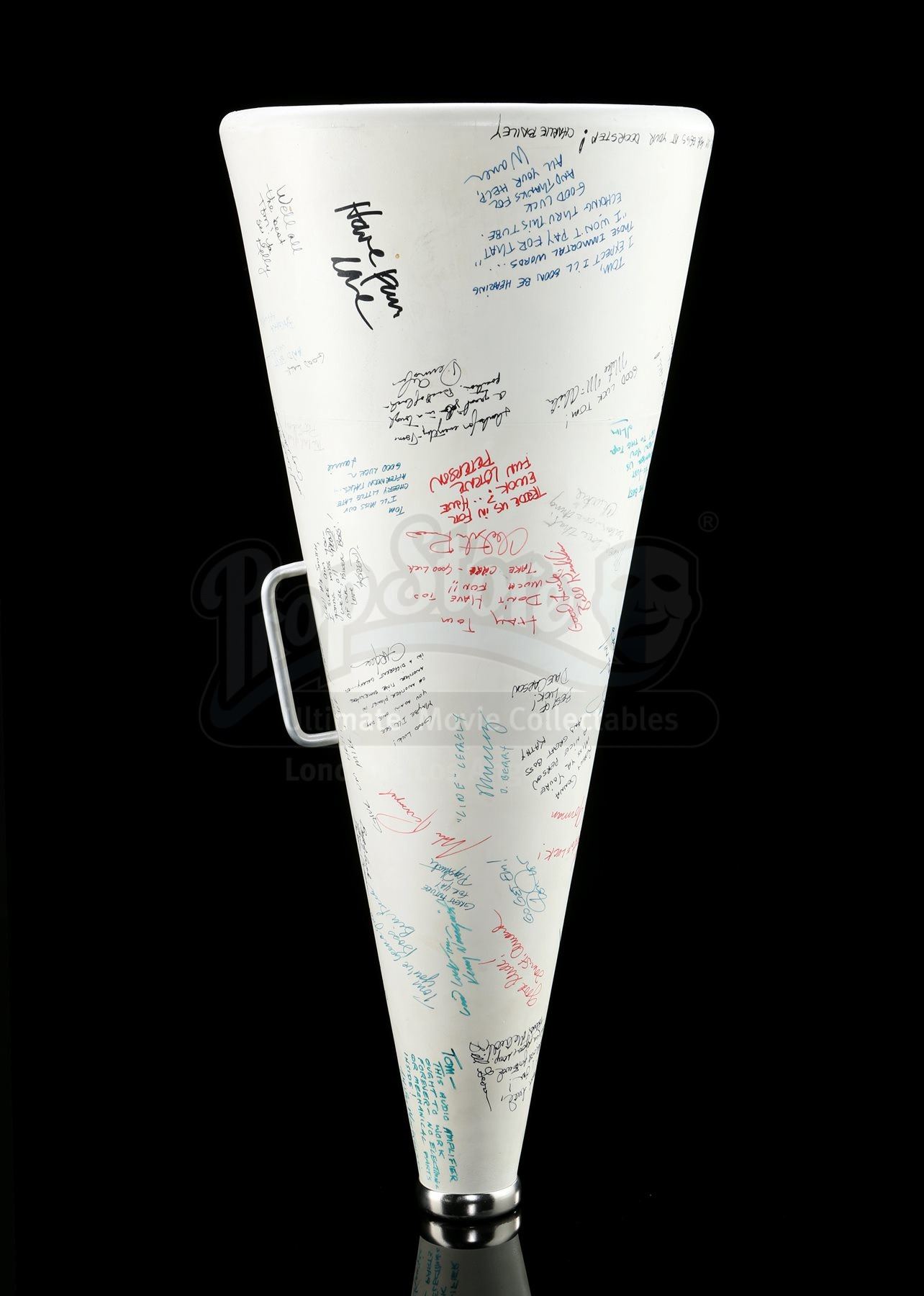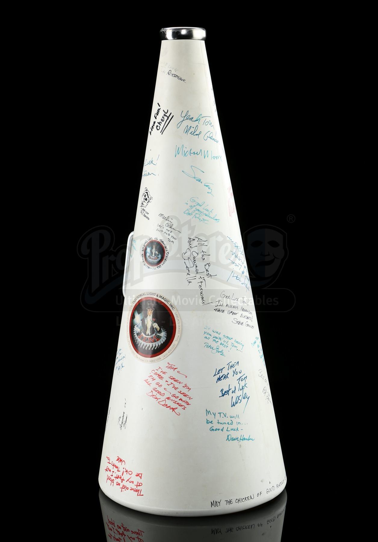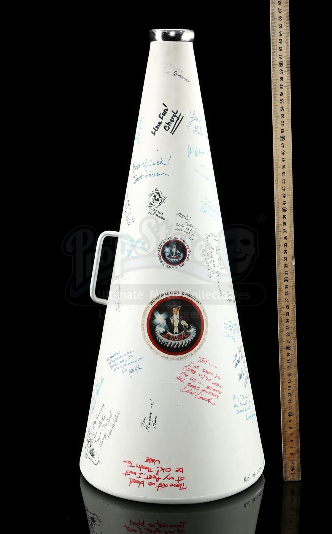 A megaphone autographed by numerous key staff from Industrial Light & Magic. Issued as a parting gift to former ILM general manager Thomas G Smith , who oversaw visual effects for classics such Raiders of the Lost Ark, E.T. The Extra-Terrestrial, Star Wars: Return of the Jedi and Poltergeist, the megaphone is signed by various effects artists and model makers, including Dave Carson, Dennis Muren, Ken Ralston, Lorne Peterson, Mike Fulmer, Mike McAlister, Norman Reynolds, Steve Gawley, and Tom St. Amand, among others. The cone-shaped megaphone is made of thick plastic with a metal grip and mouthpiece. The piece remains in very fine condition. Dimensions: 66 cm x 27 cm x 27 cm (26” x 10 ½” x 10 ½”)