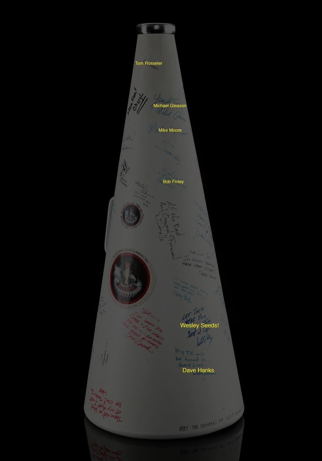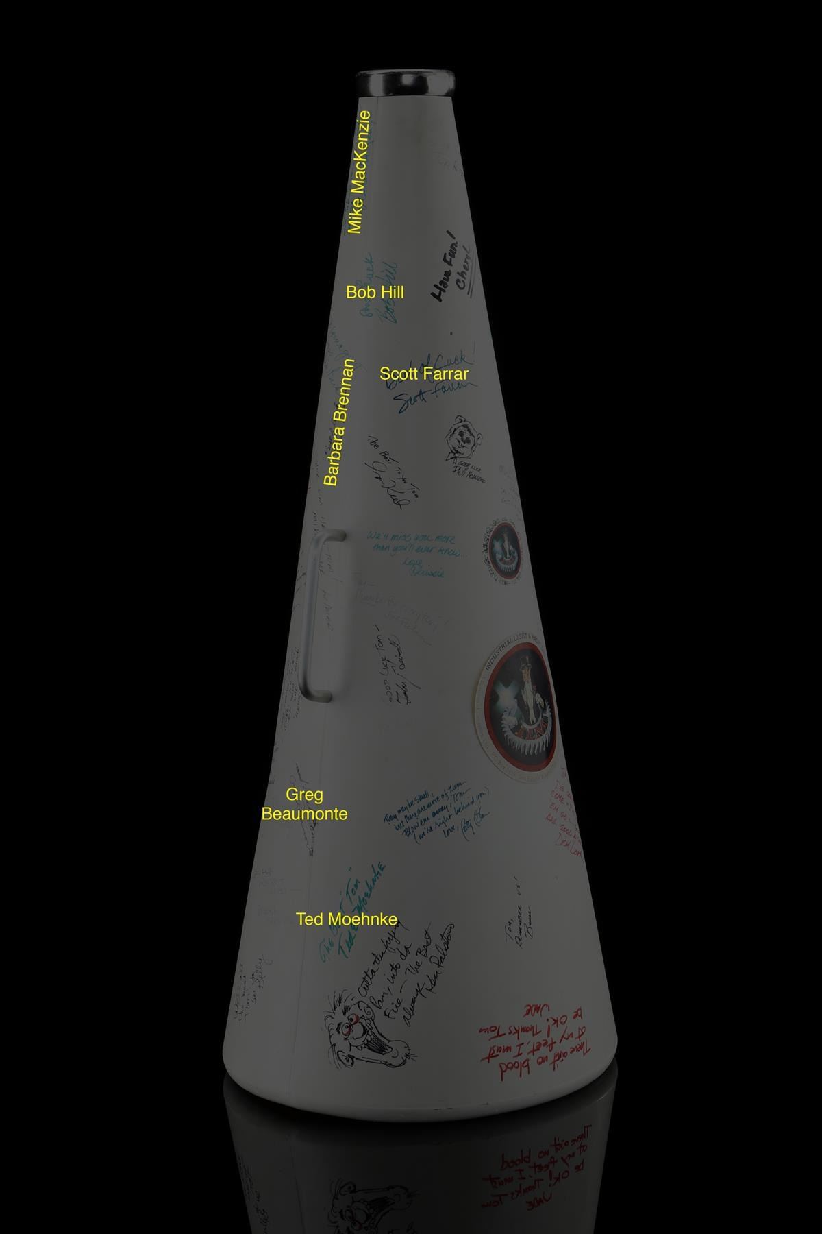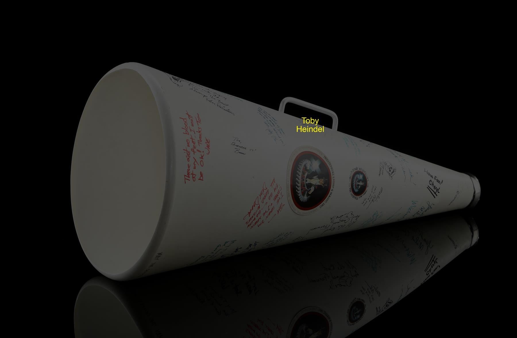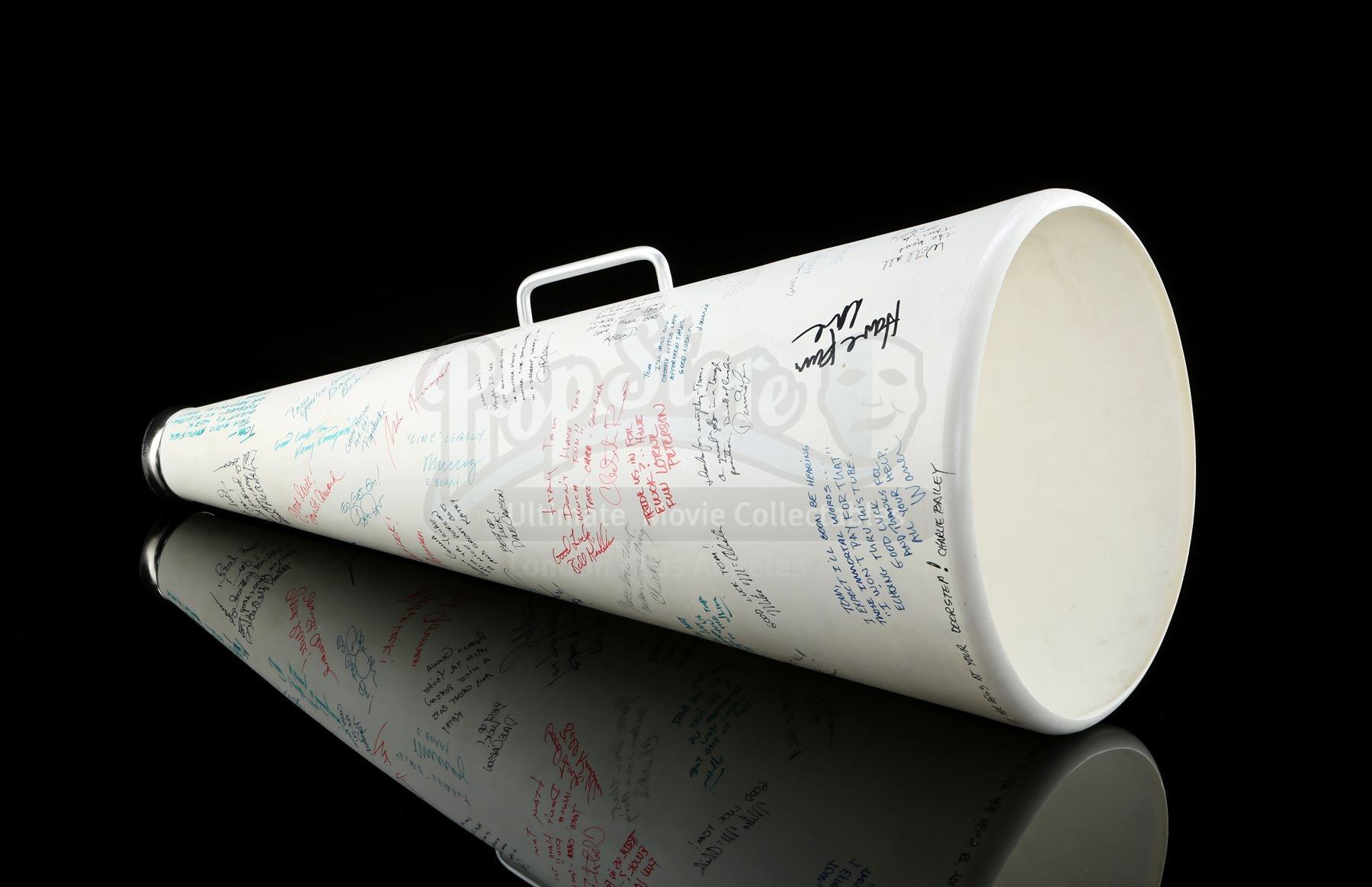 A megaphone autographed by numerous key staff from Industrial Light & Magic. Issued as a parting gift to former ILM general manager Thomas G Smith , who oversaw visual effects for classics such Raiders of the Lost Ark, E.T. The Extra-Terrestrial, Star Wars: Return of the Jedi and Poltergeist, the megaphone is signed by various effects artists and model makers, including Dave Carson, Dennis Muren, Ken Ralston, Lorne Peterson, Mike Fulmer, Mike McAlister, Norman Reynolds, Steve Gawley, and Tom St. Amand, among others. The cone-shaped megaphone is made of thick plastic with a metal grip and mouthpiece. The piece remains in very fine condition. Dimensions: 66 cm x 27 cm x 27 cm (26” x 10 ½” x 10 ½”)