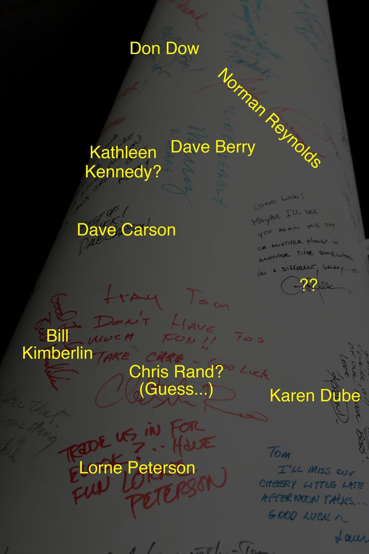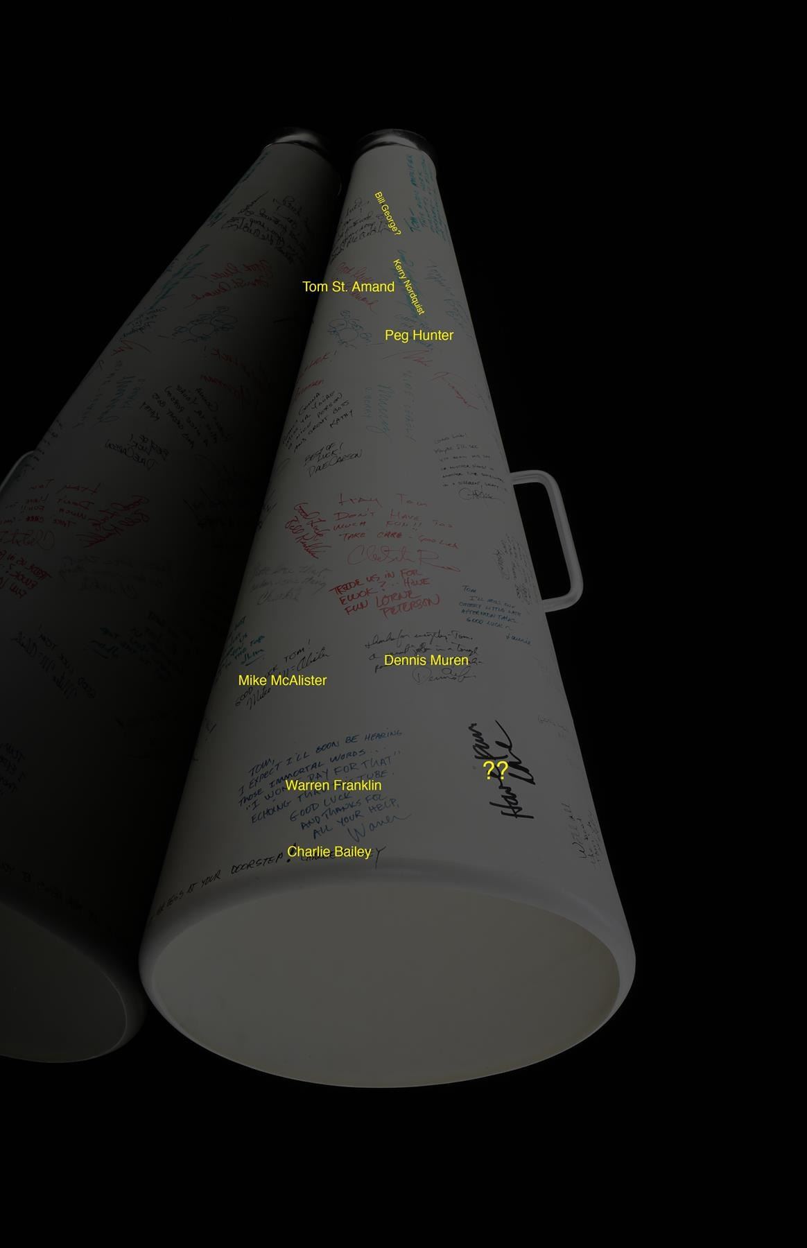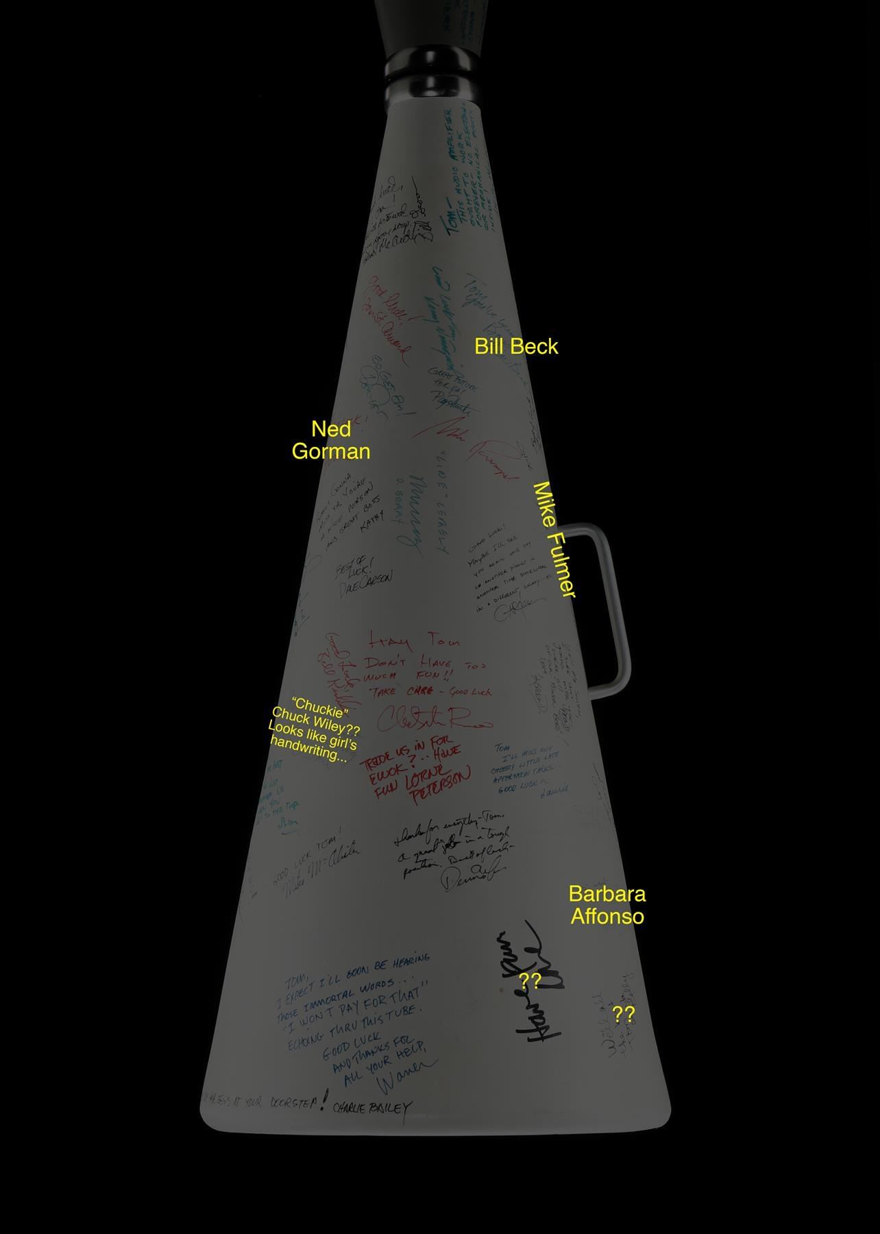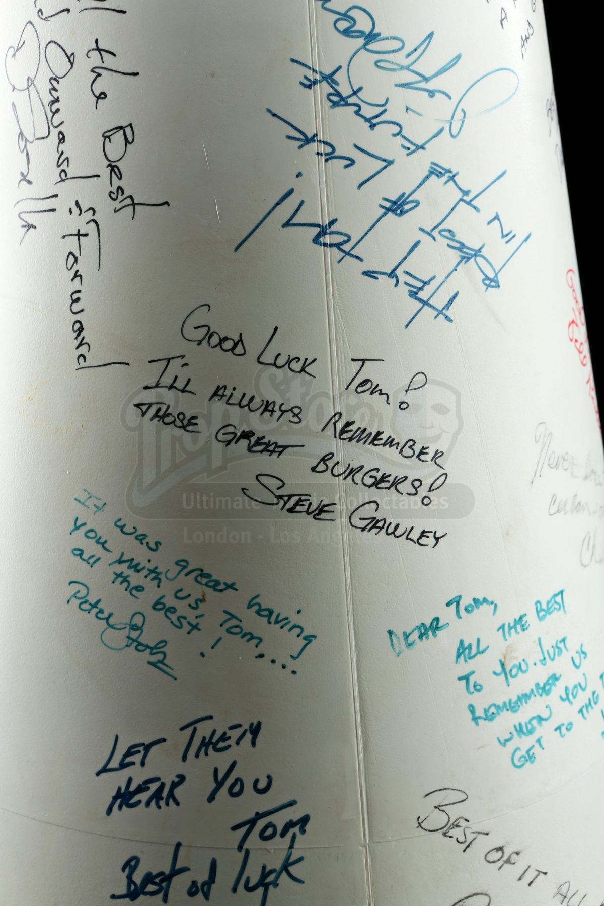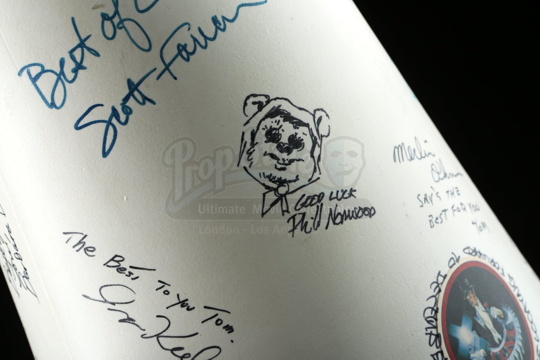 A megaphone autographed by numerous key staff from Industrial Light & Magic. Issued as a parting gift to former ILM general manager Thomas G Smith , who oversaw visual effects for classics such Raiders of the Lost Ark, E.T. The Extra-Terrestrial, Star Wars: Return of the Jedi and Poltergeist, the megaphone is signed by various effects artists and model makers, including Dave Carson, Dennis Muren, Ken Ralston, Lorne Peterson, Mike Fulmer, Mike McAlister, Norman Reynolds, Steve Gawley, and Tom St. Amand, among others. The cone-shaped megaphone is made of thick plastic with a metal grip and mouthpiece. The piece remains in very fine condition. Dimensions: 66 cm x 27 cm x 27 cm (26” x 10 ½” x 10 ½”)