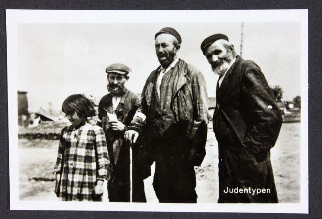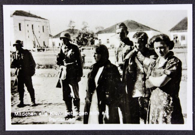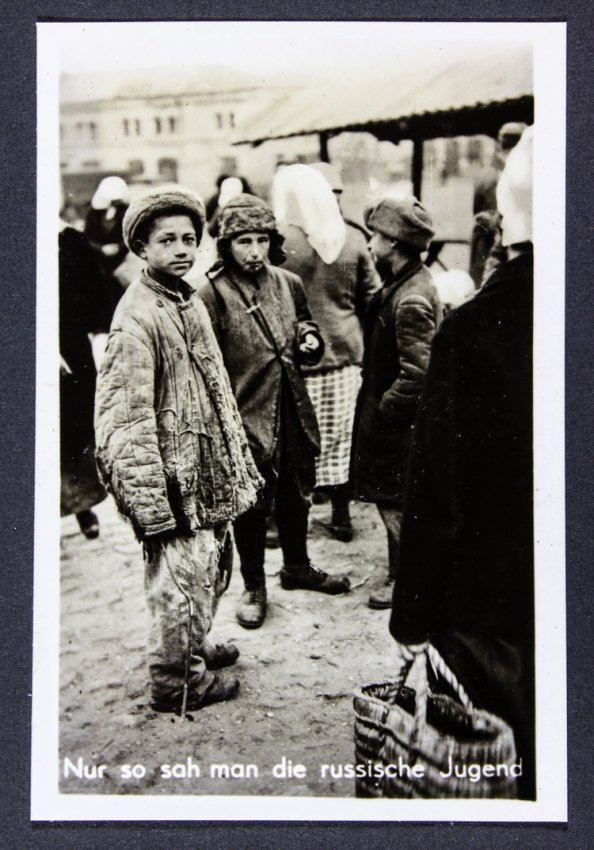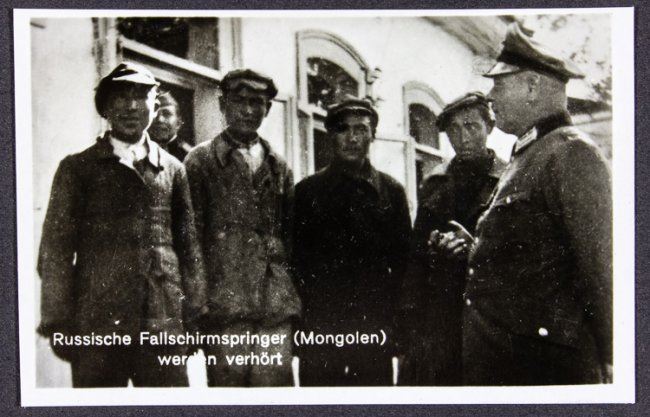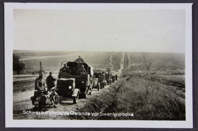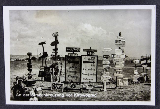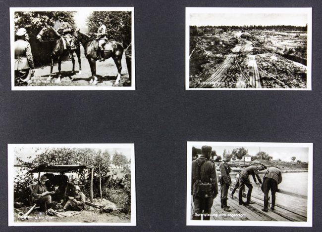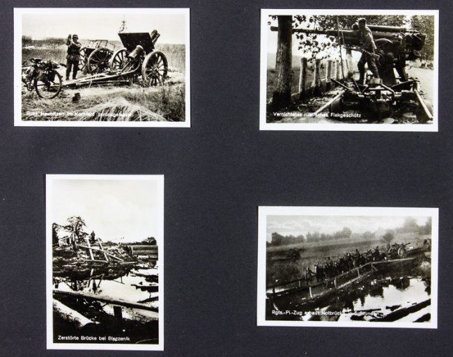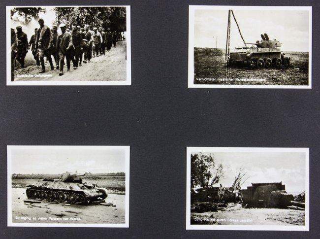 Photo album produced for distribution to members of I.R. 318 at year's end, 1942, containing about 180 3 1/2" x 2 1/2" printed photos with captions affixed within which document the regiment's service on the Eastern Front. Images depict travels through Poland to the front, Russian prisoners and prison camps, tanks and artillery, destroyed towns, captured regimental flags, wrecked aircraft, Judentypen, action in the Russian winter, and much more. Fine.
