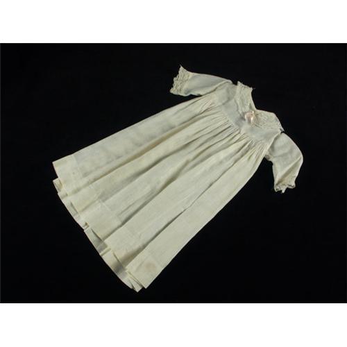 A infant's or doll's vintage cream colored cotton dress with lace trim at neck and sleeves, single button closure, 17''L x 5'' shoulders, some holes and staining noted.