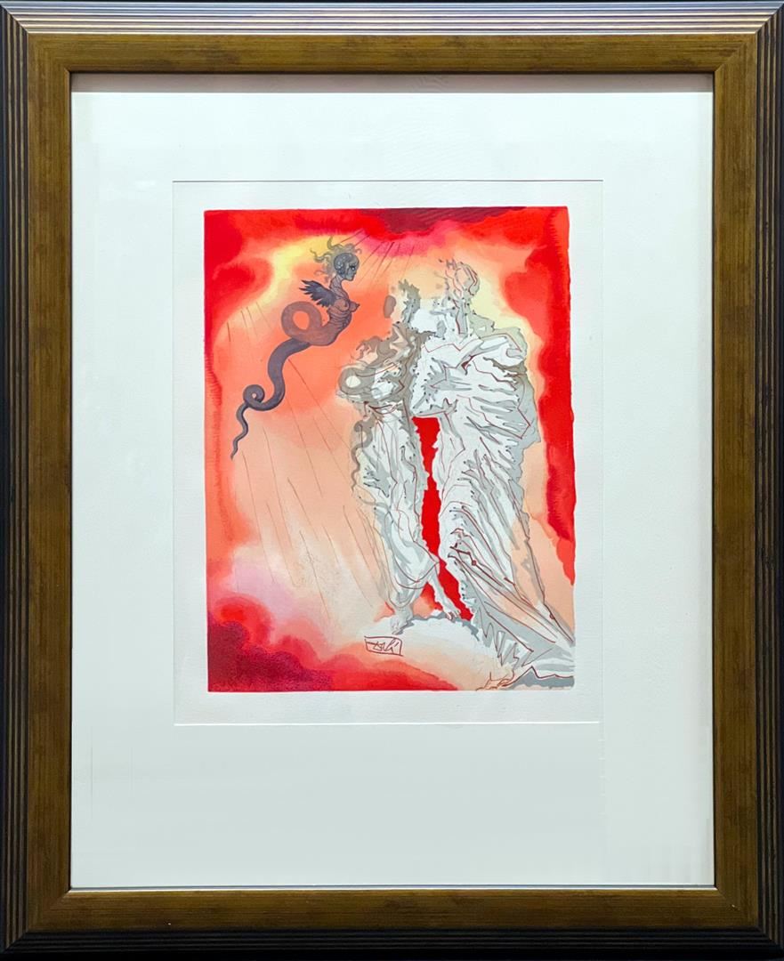 INFERNO 21 FRAUD (FRAMED) by Dali, Salvador. Open Block Signed Woodcut on Paper Framed. Dimensions: 10 x 7. Excellent Condition.
